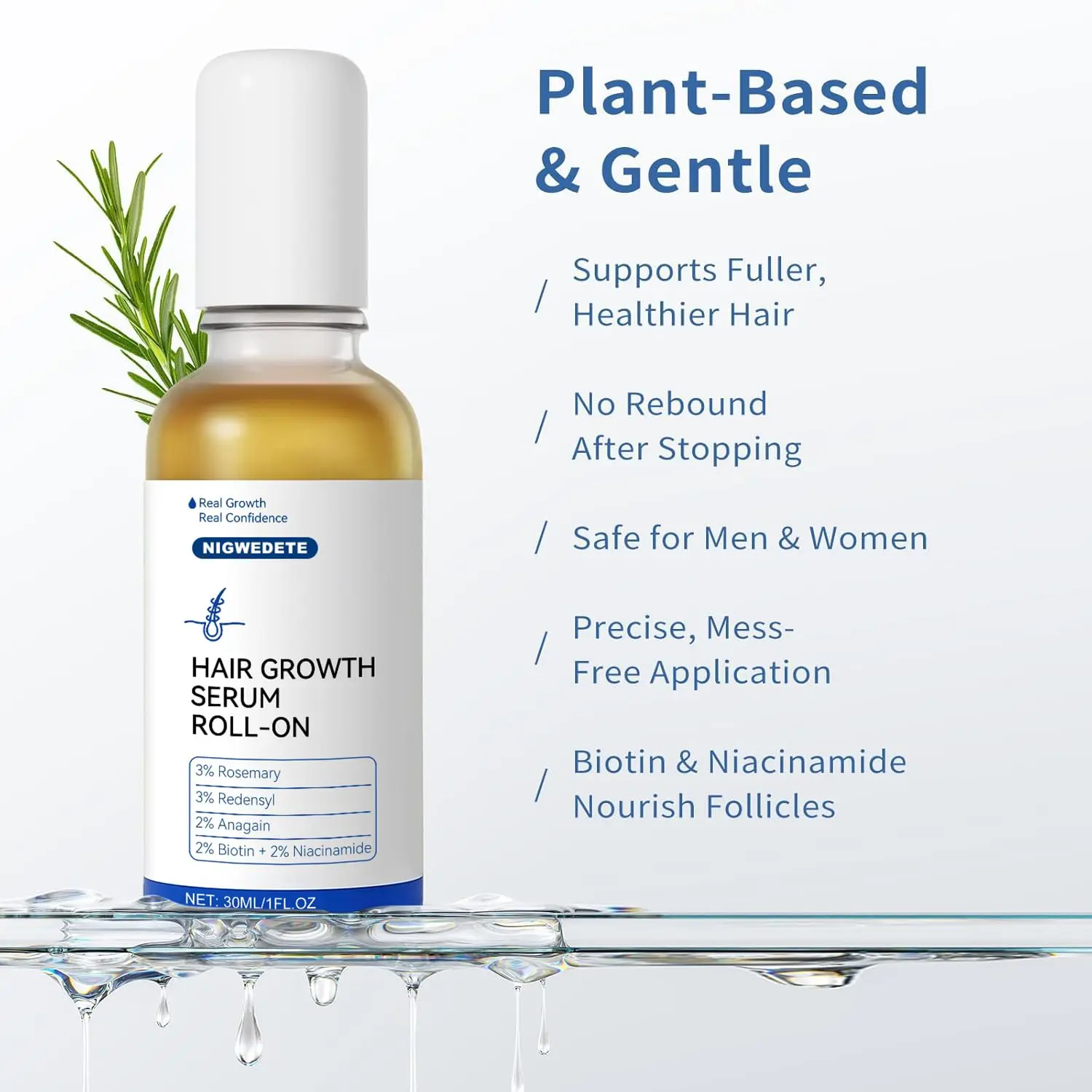 Advanced hair growth serum with Rosemary Oil and Redensyl. Targets thinning hair, promotes growth, and is gentle on all hair types. Easy roll-on application.