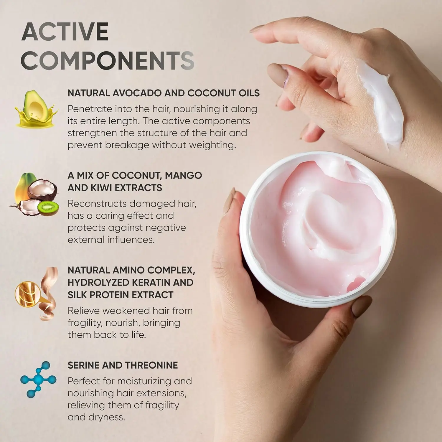 • Rebuilds hair structure – no silicones or harsh additives.