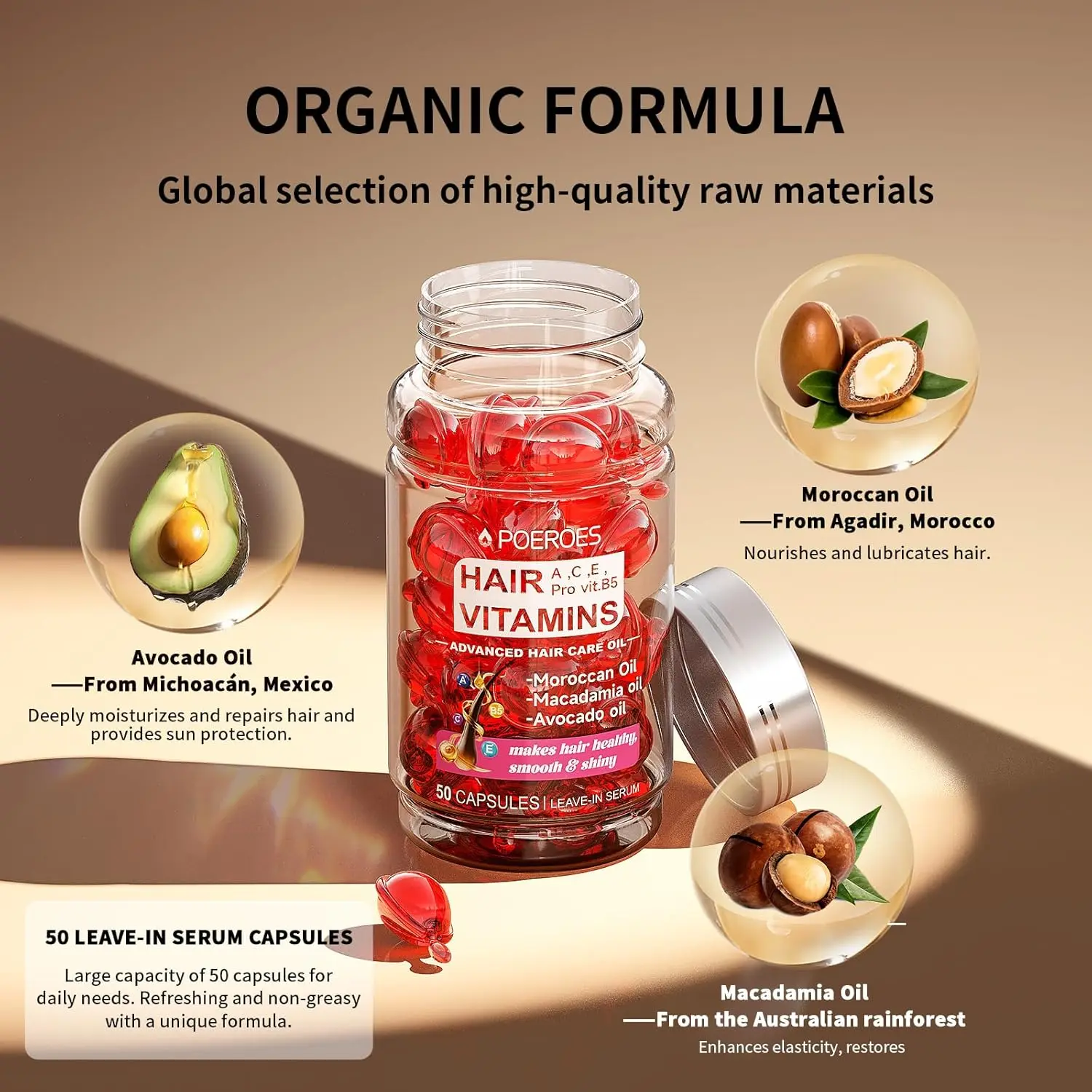 Transform your hair from frizzy and dull to silky and radiant with our Hair Serum Capsules, a potent blend of essential vitamins and nourishing oils designed to revitalize your locks. Each capsule is packed with Vitamins A, C, E, and B5 (Pro-Vitamin B5), along with Biotin and Sodium, to deeply condition and strengthen hair from root to tip. This unique formula combines the power of Macadamia Oil and Avocado Oil, known for their exceptional moisturizing and frizz-fighting properties.