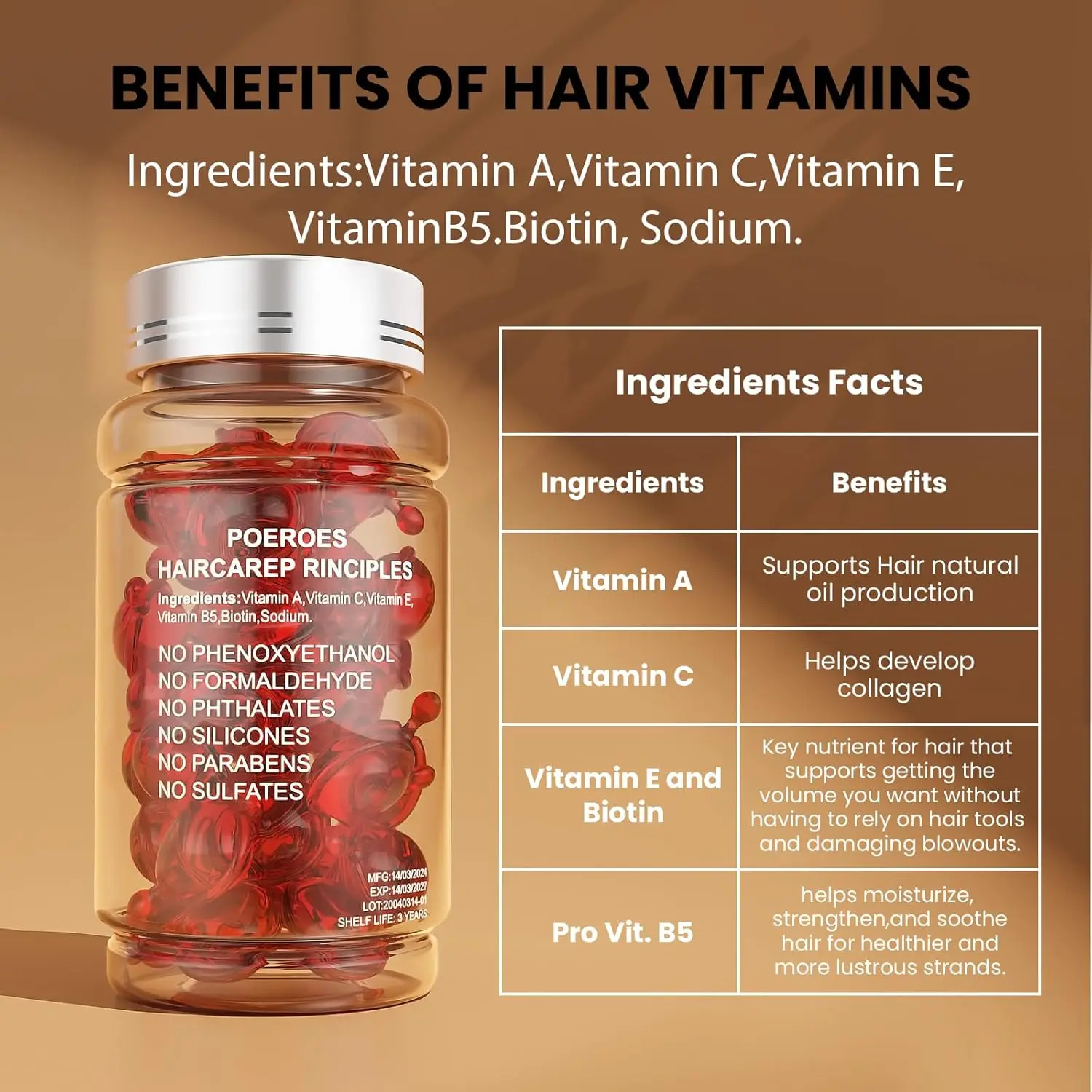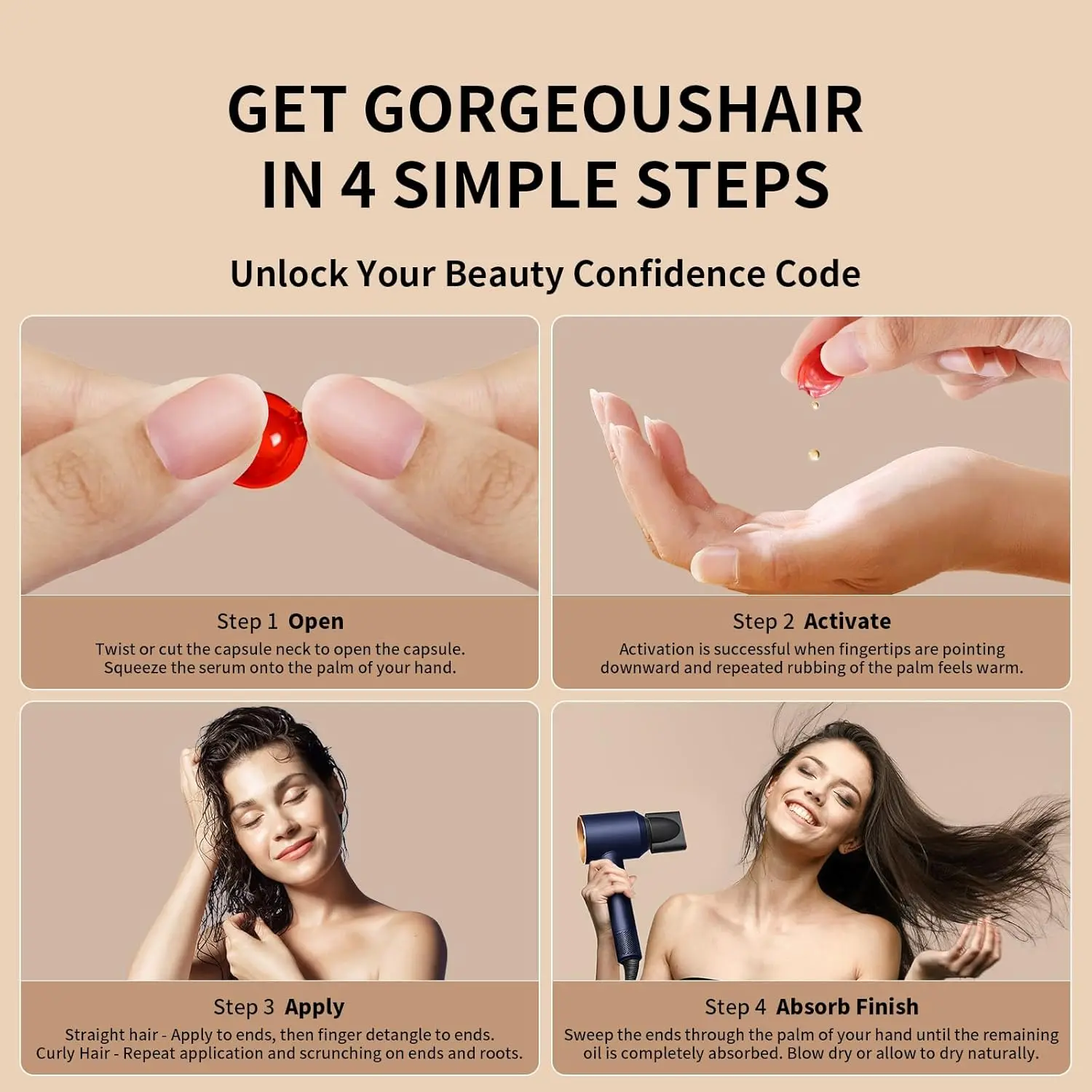 Gentle enough for daily use, our formula is free from parabens, sodium chloride, sulfates, harsh chemicals, and residues. Enjoy the convenience of our capsule formula, making it easy to apply just the right amount of concentrated oil. Simply place a few drops in the palm of your hand, rub your hands together, and apply evenly to your hair, focusing on the ends. Each bottle contains 50 capsules, providing a long-lasting supply of nourishing hair treatment. Say goodbye to frizz and hello to healthy, vibrant hair with our Hair Serum Capsules. Experience the difference of a vitamin-rich, oil-infused formula that truly transforms your hair.