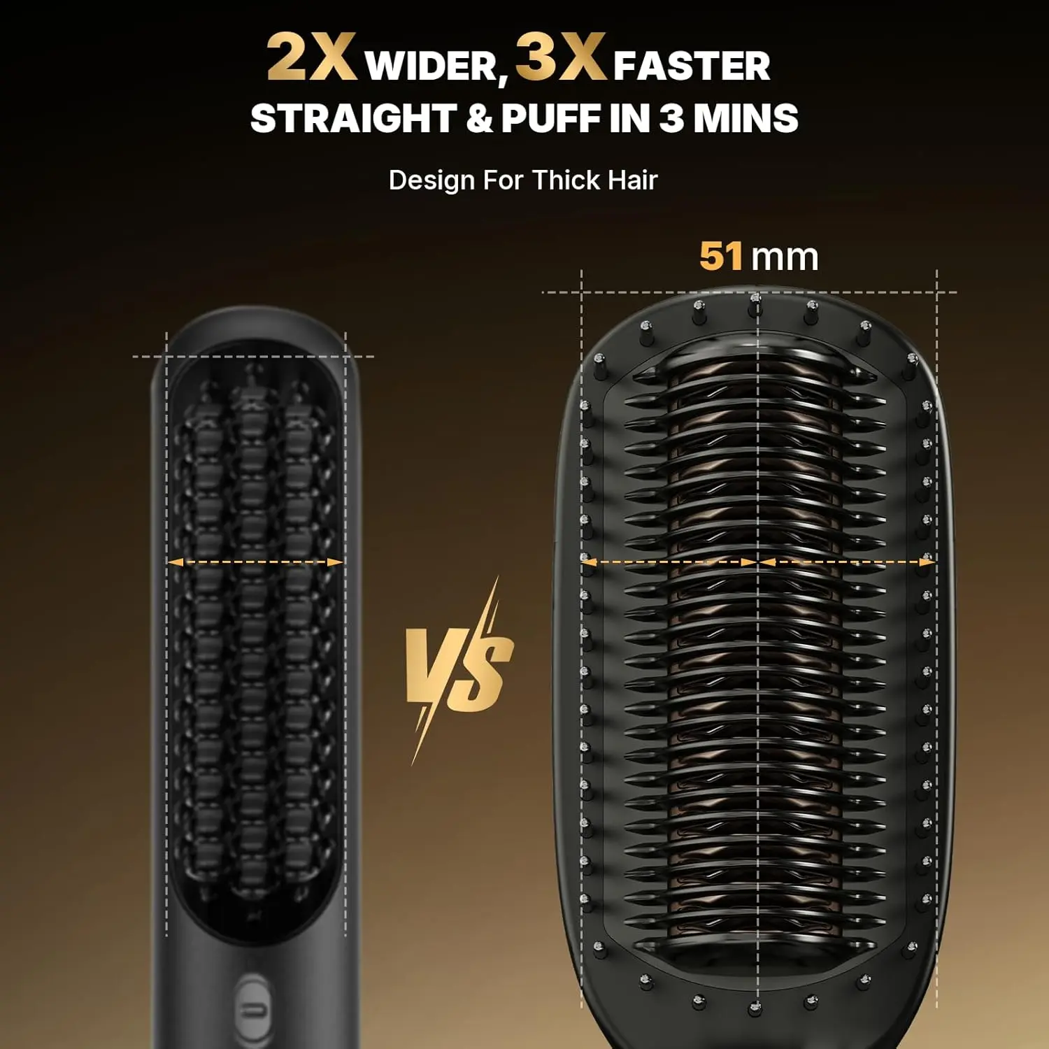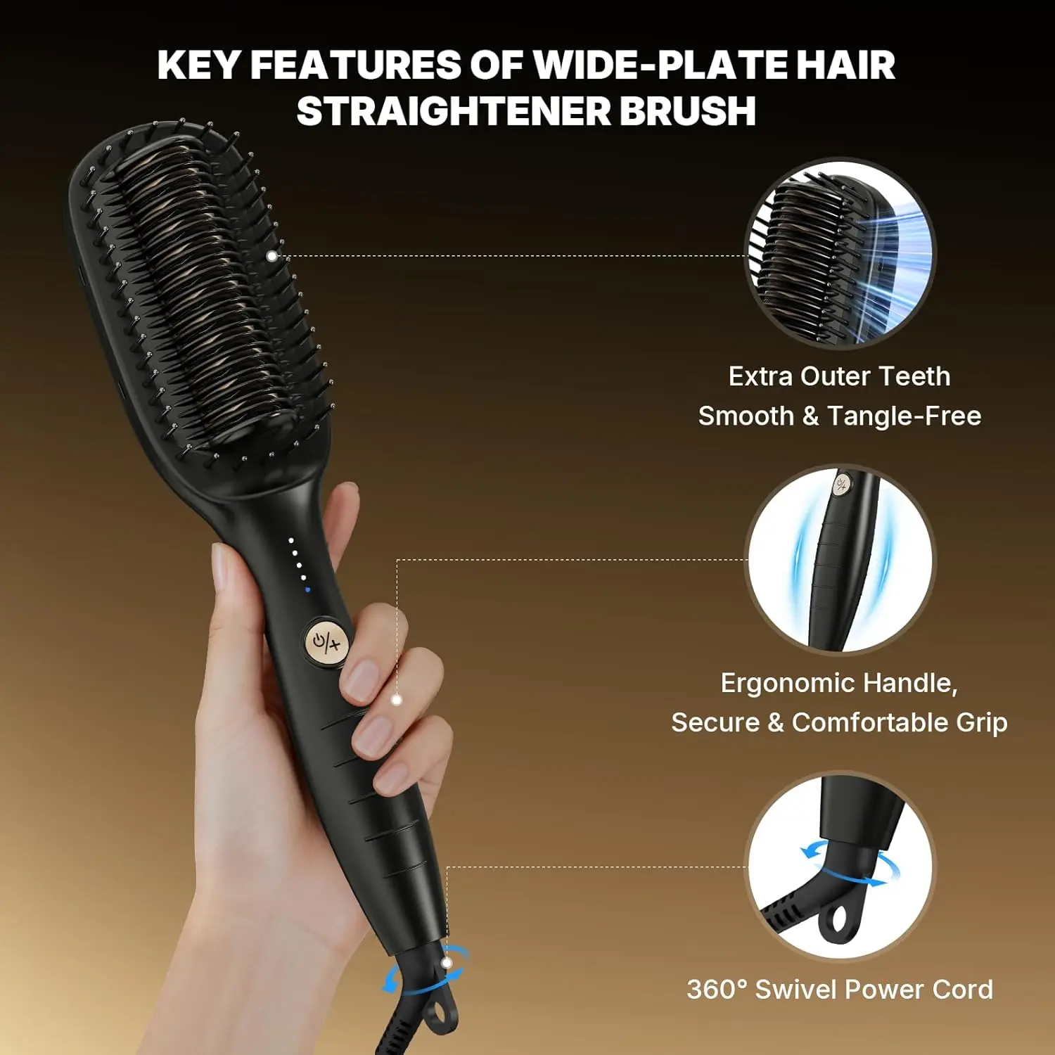 Achieve salon-worthy straight hair in minutes with our innovative Hair Straightener Brush. Featuring an extra-wide 51mm plate, this brush straightens your hair up to 3x faster than traditional straighteners, making it perfect for all hair volumes, from fine to thick and everything in between. Say goodbye to repeated passes and hello to effortlessly smooth, frizz-free hair. Our brush is designed with your hair’s health in mind. The advanced PTC thermostat maintains a consistent temperature, while the anti-scald teeth protect your scalp from burns. Infused with 40 million negative ions, this brush neutralizes static, reducing frizz and leaving your hair silky, shiny, and manageable. With 4 temperature settings (140-230℃), you can customize the heat to suit your hair type. The brush also features a 30-minute auto-shutoff for added safety. The ergonomic design and 360° rotating cord provide a comfortable and tangle-free styling experience. The extra circle of teeth on the outer ring grips more hair, preventing tangling and pulling, minimizing breakage and catering to diverse styling preferences. Upgrade your hair routine with our Hair Straightener Brush.