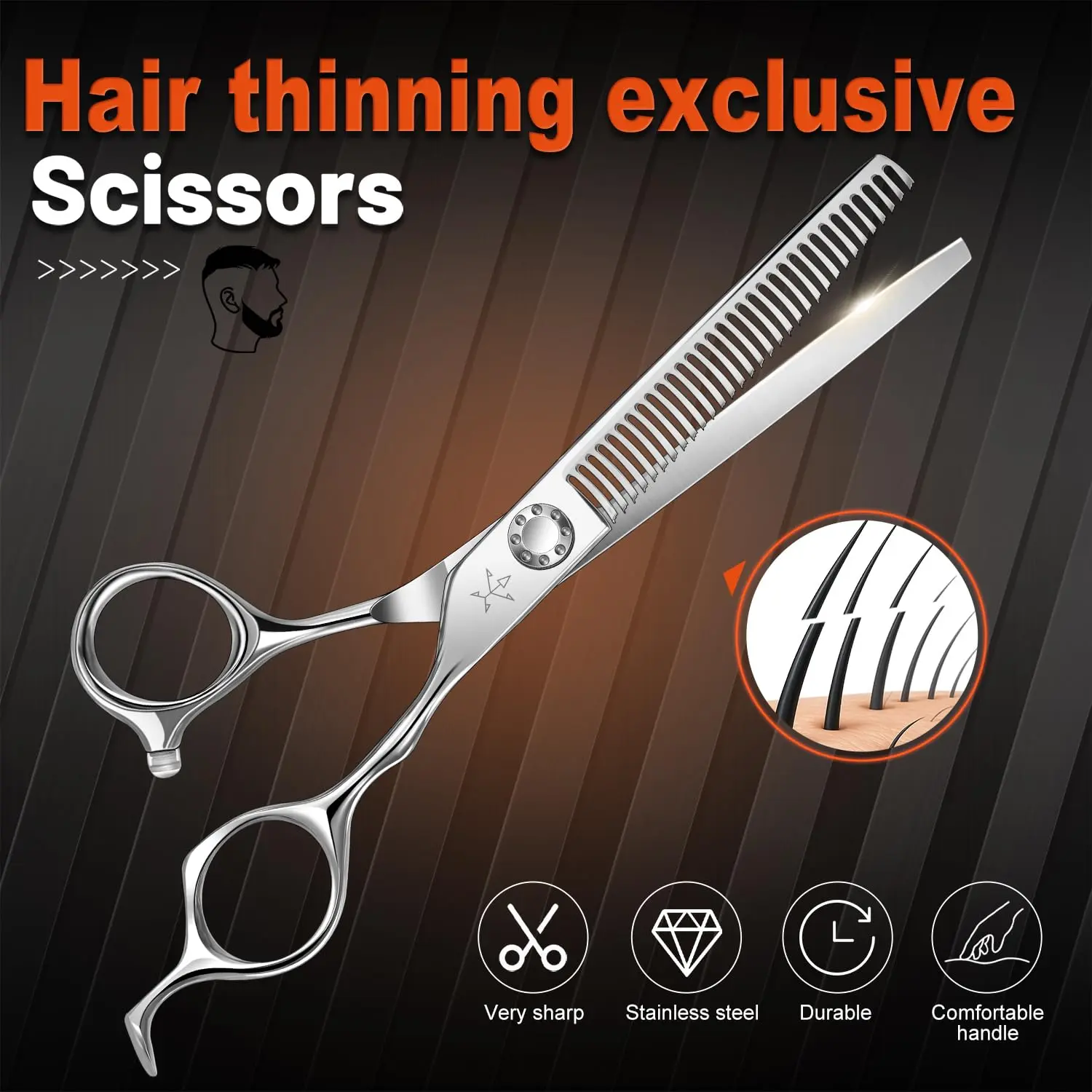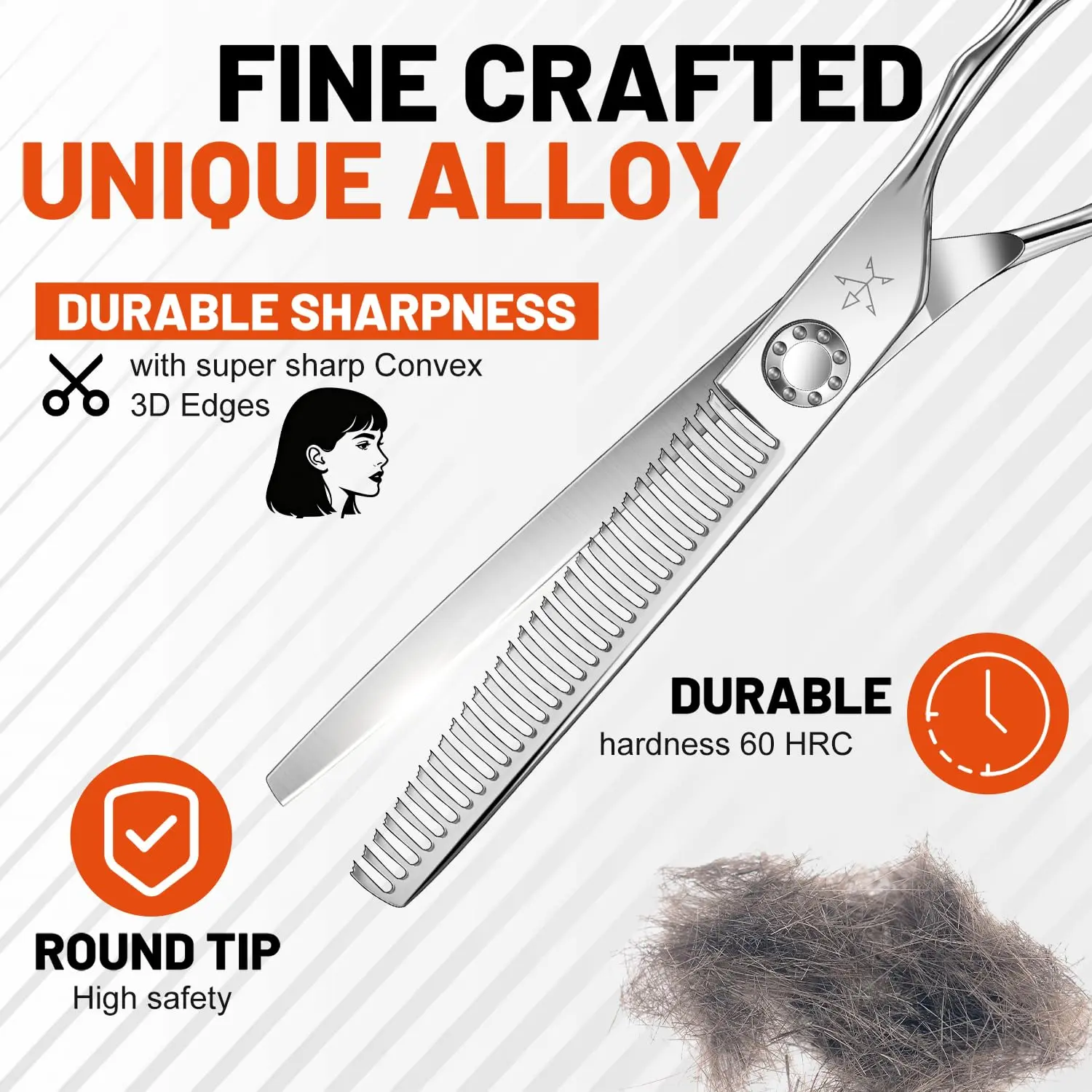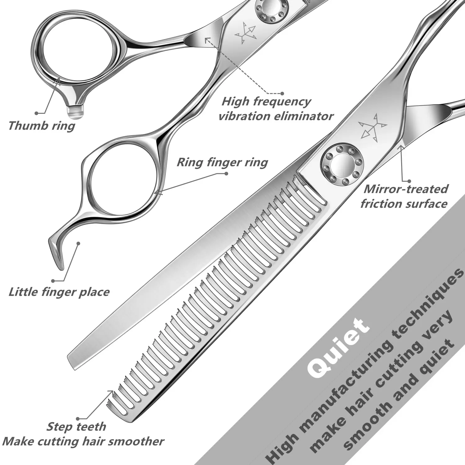 Experience unparalleled precision and quality with our Professional Barber Hair Thinning Scissors. Crafted from high-quality stainless steel alloy using meticulous handcrafting techniques and advanced laser freezing cutting technology on the blade, each pair undergoes 188 distinct manufacturing processes. We utilize a unique steel formula, exquisite production technology, and strict sharpness requirements to deliver exceptional performance. Our scissors feature a high solid bearing screw that connects the blades, allowing you to easily adjust the tightness for your preferred shear feel. These precise screws also ensure balanced weight distribution throughout the scissors. The sharp blades, solid material, adjustable screw, and ergonomic finger ring design combine to provide a comfortable, smooth, and quiet cutting experience. Every pair is subjected to rigorous selection and repeated inspection to guarantee superior quality. Suitable for professional hairdressers, cosmetologists, and home use alike, these hair cutting scissors are safe and easy to use on men, women, the elderly, kids, and babies. Weighing in at only 2.45 ounces, these shears offer exceptional maneuverability, allowing you to effortlessly create dimensional looks. Your scissors have been carefully adjusted to the optimal tightness and coated with lubricating oil for protection. Before first use, simply rinse thoroughly with soapy water and dry with the included complimentary flannelette cloth. Experience the difference that precision and quality make with our professional hair thinning scissors.