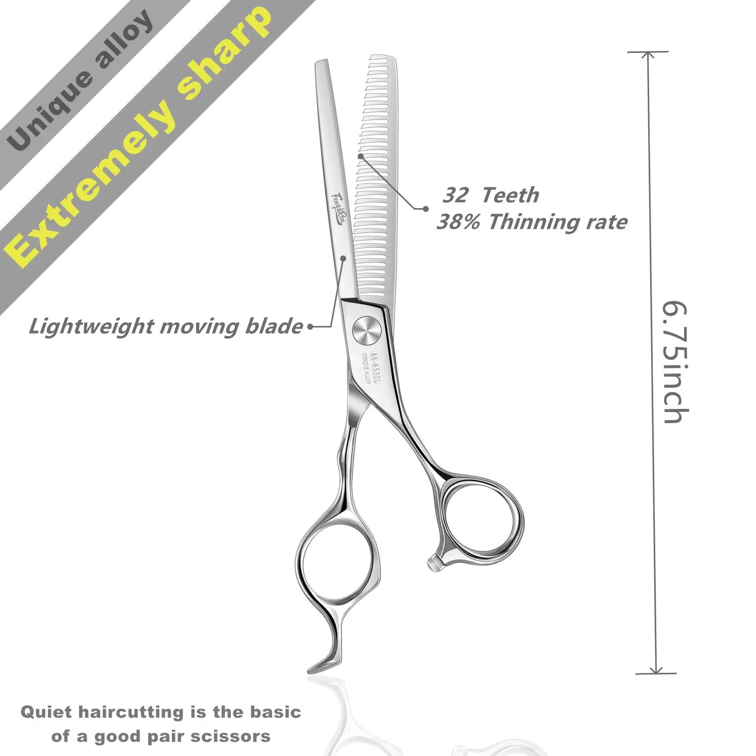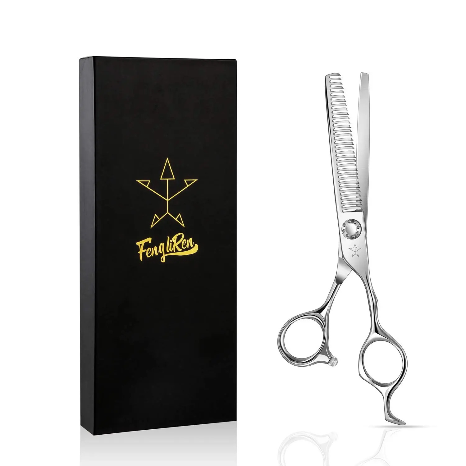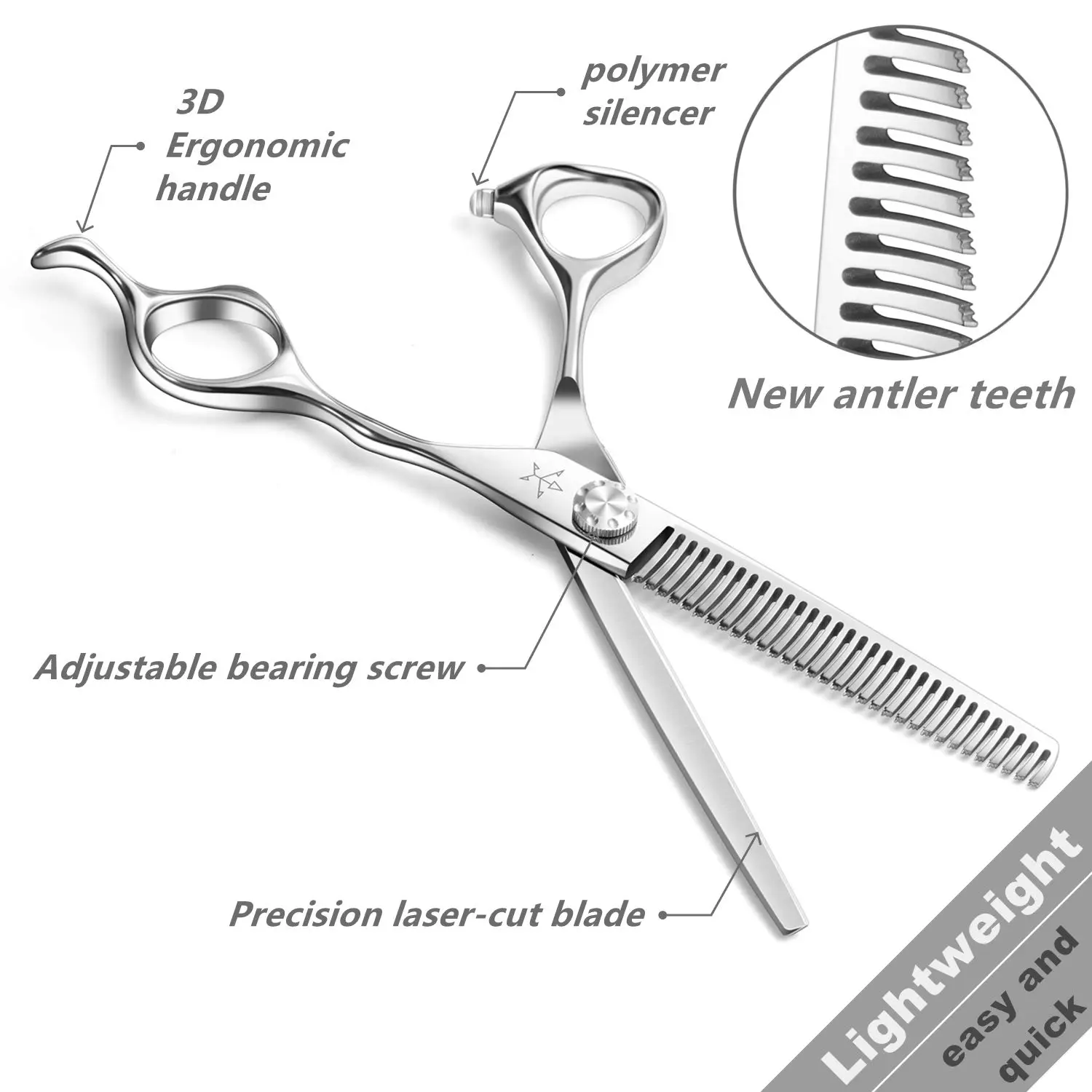 Experience unparalleled precision and quality with our Professional Barber Hair Thinning Scissors. Crafted from high-quality stainless steel alloy using meticulous handcrafting techniques and advanced laser freezing cutting technology on the blade, each pair undergoes 188 distinct manufacturing processes. We utilize a unique steel formula, exquisite production technology, and strict sharpness requirements to deliver exceptional performance. Our scissors feature a high solid bearing screw that connects the blades, allowing you to easily adjust the tightness for your preferred shear feel. These precise screws also ensure balanced weight distribution throughout the scissors. The sharp blades, solid material, adjustable screw, and ergonomic finger ring design combine to provide a comfortable, smooth, and quiet cutting experience. Every pair is subjected to rigorous selection and repeated inspection to guarantee superior quality. Suitable for professional hairdressers, cosmetologists, and home use alike, these hair cutting scissors are safe and easy to use on men, women, the elderly, kids, and babies. Weighing in at only 2.45 ounces, these shears offer exceptional maneuverability, allowing you to effortlessly create dimensional looks. Your scissors have been carefully adjusted to the optimal tightness and coated with lubricating oil for protection. Before first use, simply rinse thoroughly with soapy water and dry with the included complimentary flannelette cloth. Experience the difference that precision and quality make with our professional hair thinning scissors.