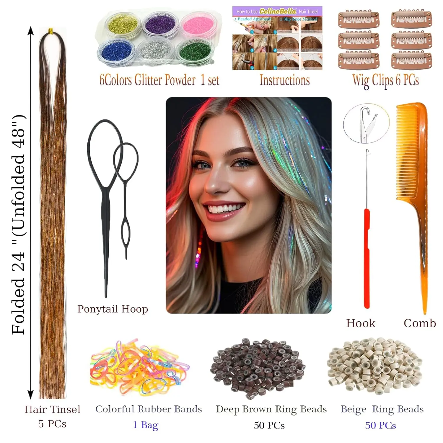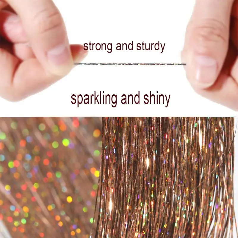Each strand measures 48 inches in length, providing ample material for creating a variety of stunning looks. Whether you want subtle highlights or a bold, shimmering statement, our adjustable length allows you to customize the tinsel to your desired style.
