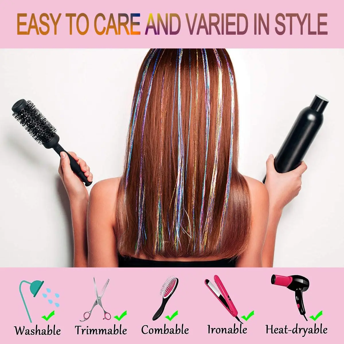 Add dazzling shine to your hair with our Hair Tinsel Kit! This heat-resistant tinsel is crafted from high-quality polyester fiber, ensuring a soft, strong, and long-lasting sparkle. Except for white hair tinsel, our tinsel can withstand heat styling tools up to 180℃, so you can curl, straighten, and blow-dry your hair without worry. The tinsel is designed to be stretch-resistant, maintaining its vibrant shine even after washing, drying, and ironing.