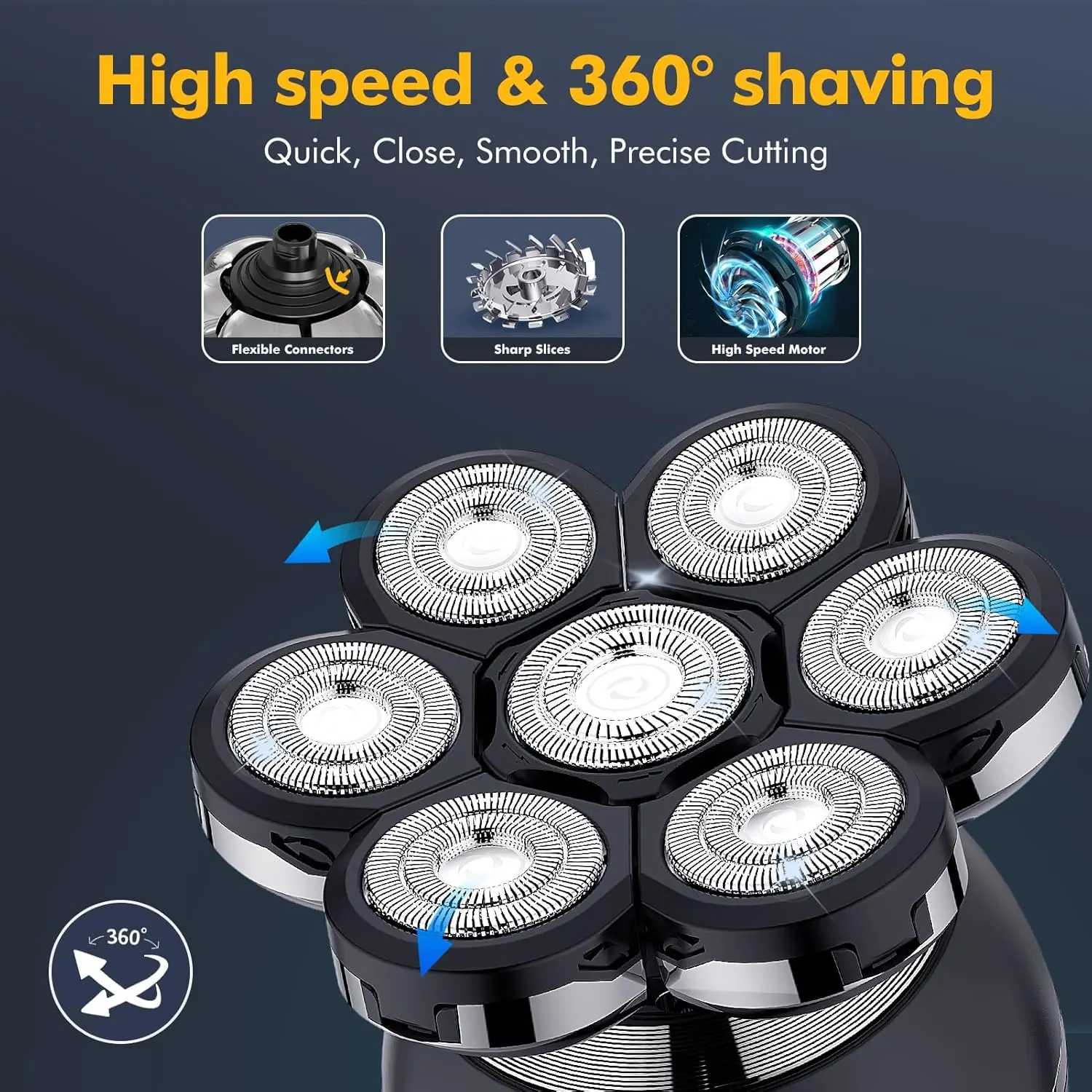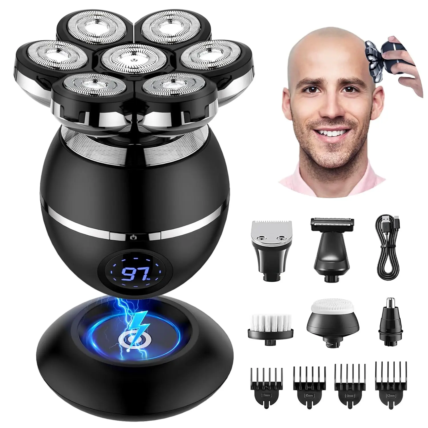 Achieve a flawlessly smooth head with the 2024 Upgraded Head Shaver for Bald Men! This innovative electric razor is designed specifically for bald heads, featuring a double-layer durable blade system that precisely captures both long and short hairs with safety and sharpness. The protective double net minimizes irritation, while the intelligent induction system prevents painful hair pinching. The enhanced contact area ensures a faster and more efficient shaving experience. More than just a head shaver, this is a complete 6-in-1 grooming kit. This electric razor is also designed for portability and durability. Its ergonomic design provides a comfortable grip and a sleek aesthetic, while the metal surface, free from paint, enhances its resistance to wear and tear. Lightweight and compact, it easily fits into your backpack or suitcase, making it the perfect travel companion for maintaining your clean-shaven look on the go. It’s also an excellent gift idea for fathers, boyfriends, husbands, or sons on special occasions like Christmas and birthdays. Experience the convenience of wet or dry shaving with the IPX7 waterproof technology. Use it with shaving cream in the shower for a comfortable and close shave, or dry for a quick touch-up. Cleaning is a breeze – the electric shaver can be easily disassembled and rinsed directly under the tap, saving you time and effort. The electric shaver supports wireless charging and utilizes USB C for convenient charging options. A quick 1.5-hour charge provides an impressive 90 minutes of runtime. The built-in LED display allows you to easily monitor the battery level, ensuring you’re never caught off guard. This shaver is not only durable and sustainable but also energy-saving and cost-effective. This professional grooming kit includes a 7D Rotary Shaver, a Nose/Ear Hair Trimmer, a Hair Trimmer with guide combs (3/6/9/12mm), a Facial Massage Brush, a Facial Cleaning Brush, a Body Trimmer, and a Sideburn Trimmer.