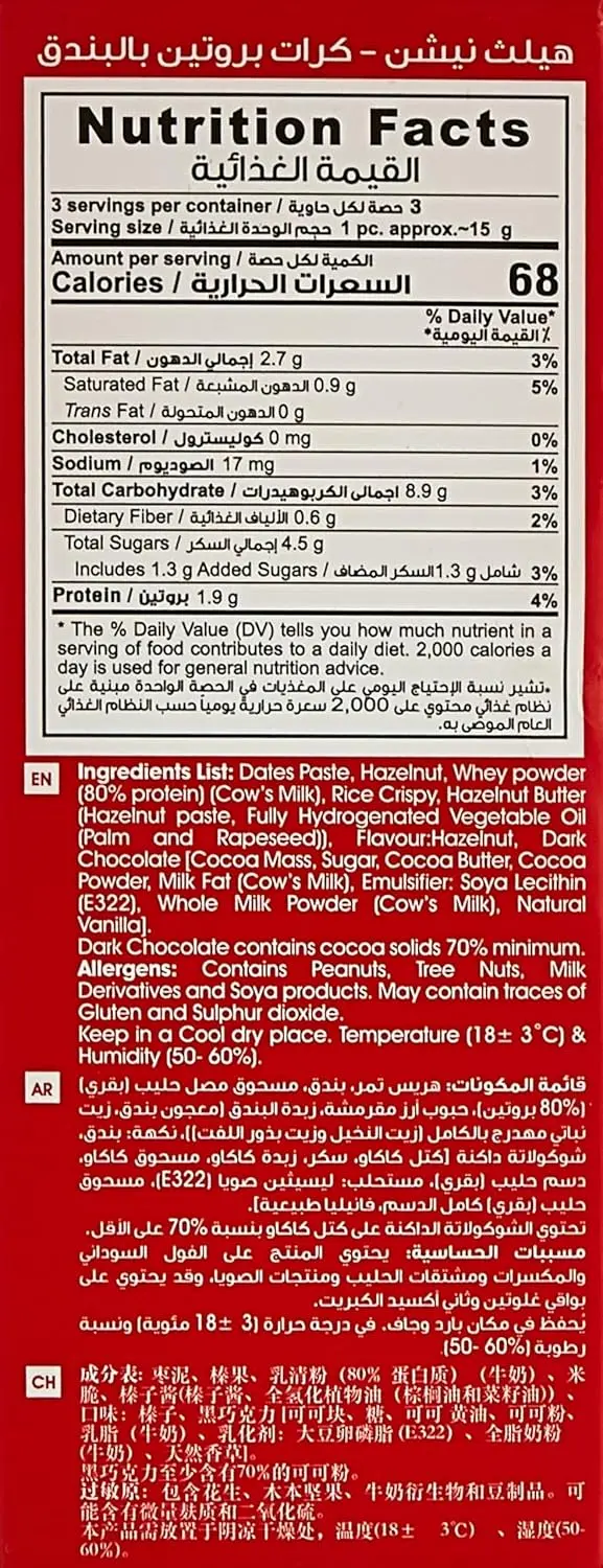 Indulge in the delicious and nutritious Health Nation Hazelnut Protein Ball! This heart-healthy snack is packed with the goodness of hazelnuts, known for their amazing benefits to cardiovascular and digestive well-being. Each bite delivers a satisfying combination of rich hazelnut flavor and a boost of protein, making it the perfect pick-me-up for any time of day. Whether you’re looking for a guilt-free treat, a post-workout refuel, or a healthy addition to your lunchbox, these protein balls are a fantastic choice. Hazelnuts are a great source of monounsaturated fats, which can help lower bad cholesterol levels and reduce the risk of heart disease. Additionally, their high fiber content promotes healthy digestion and keeps you feeling full and satisfied. Choose Health Nation Hazelnut Protein Balls for a delicious and convenient way to support your heart and digestive health. They’re the perfect snack for a healthy and active lifestyle. Enjoy the natural goodness and satisfying crunch of hazelnuts in a convenient and delicious protein-packed form!