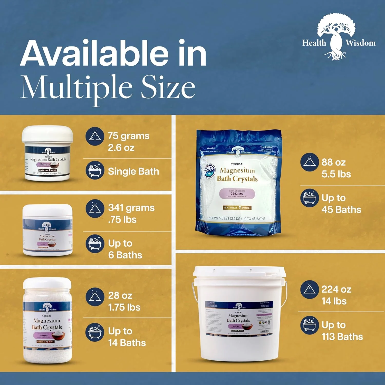 Experience the ultimate relaxation with Health & Wisdom Magnesium Bath Crystals. Soothe tired muscles, ease tension, and enjoy up to 50 baths of therapeutic bliss. Perfect for stress relief and muscle recovery.