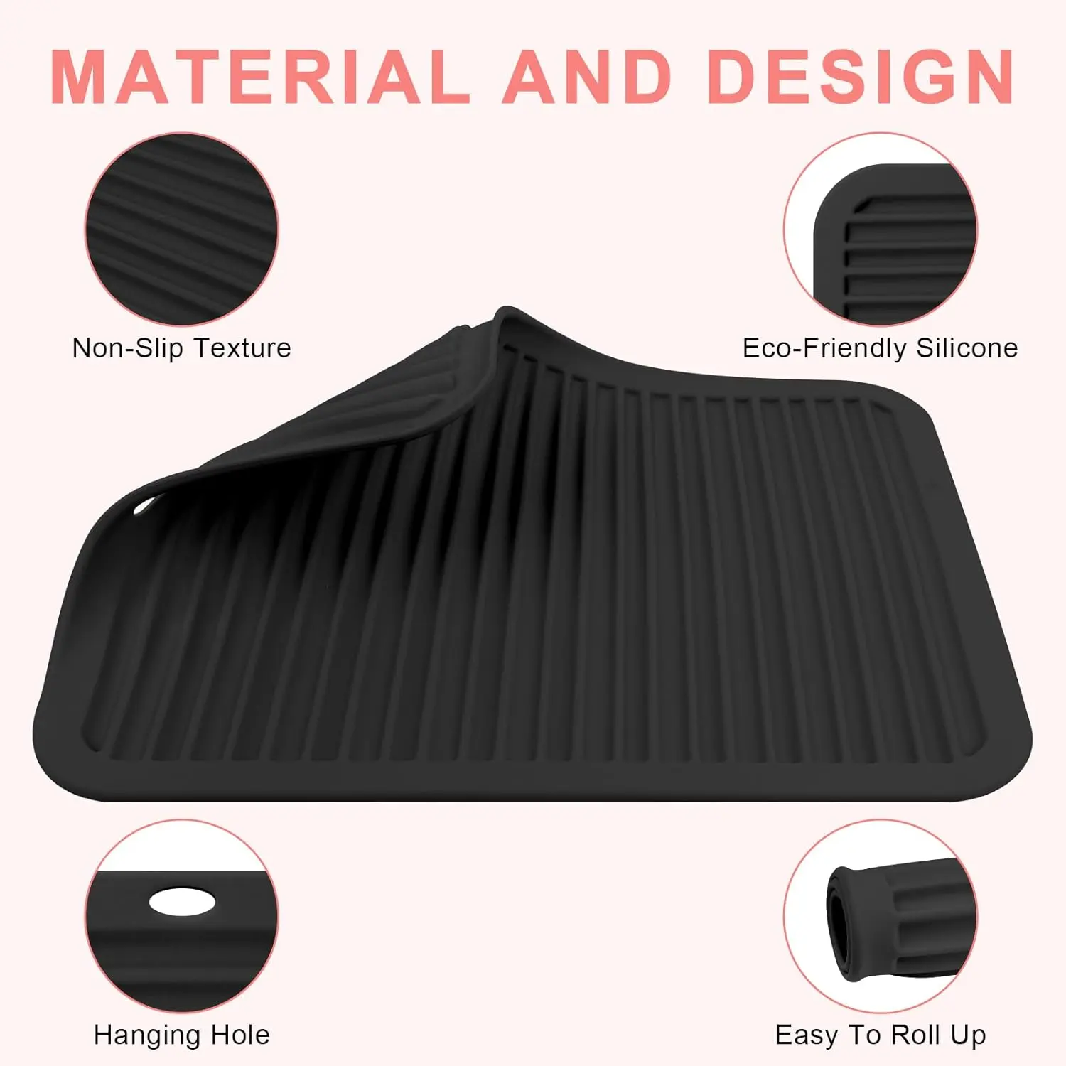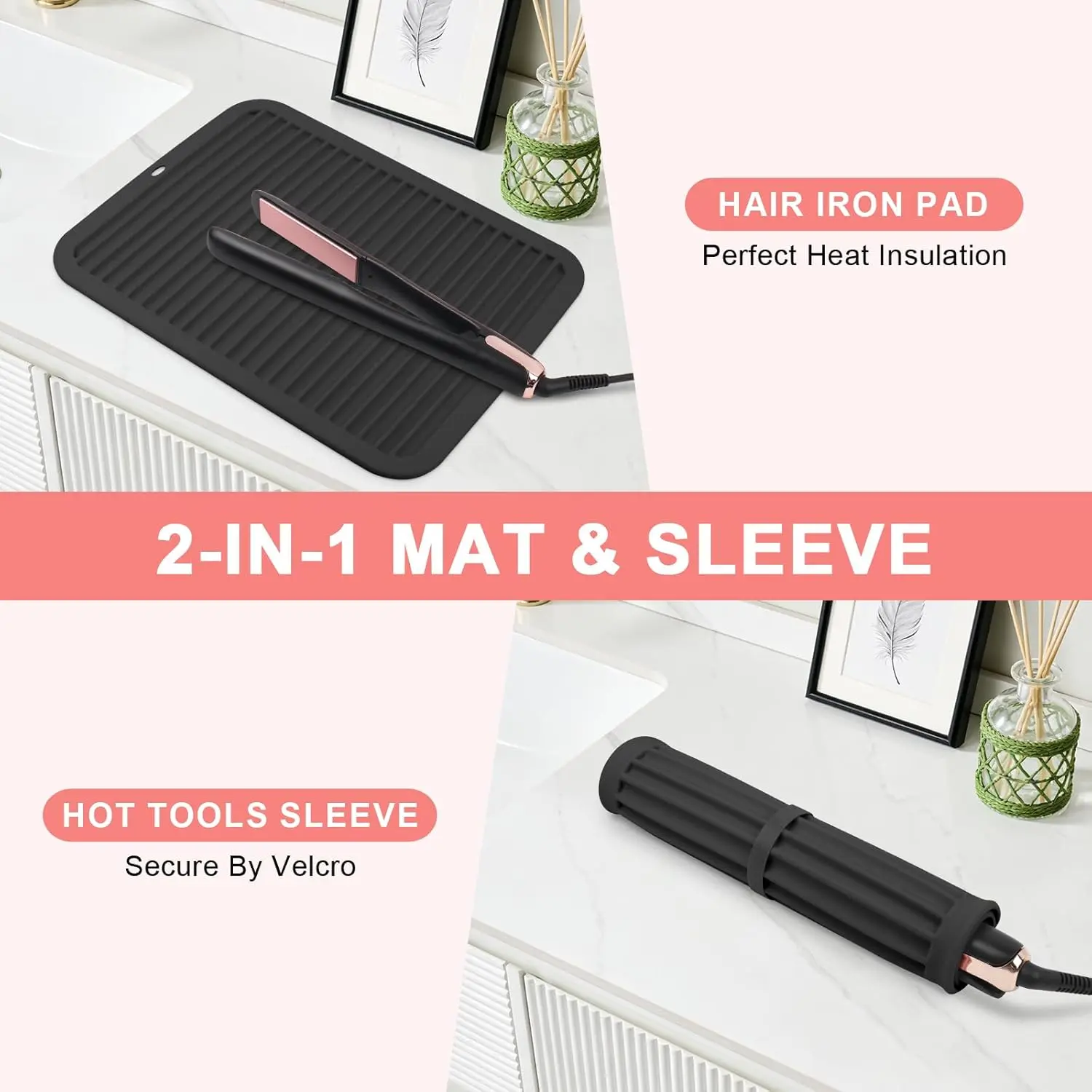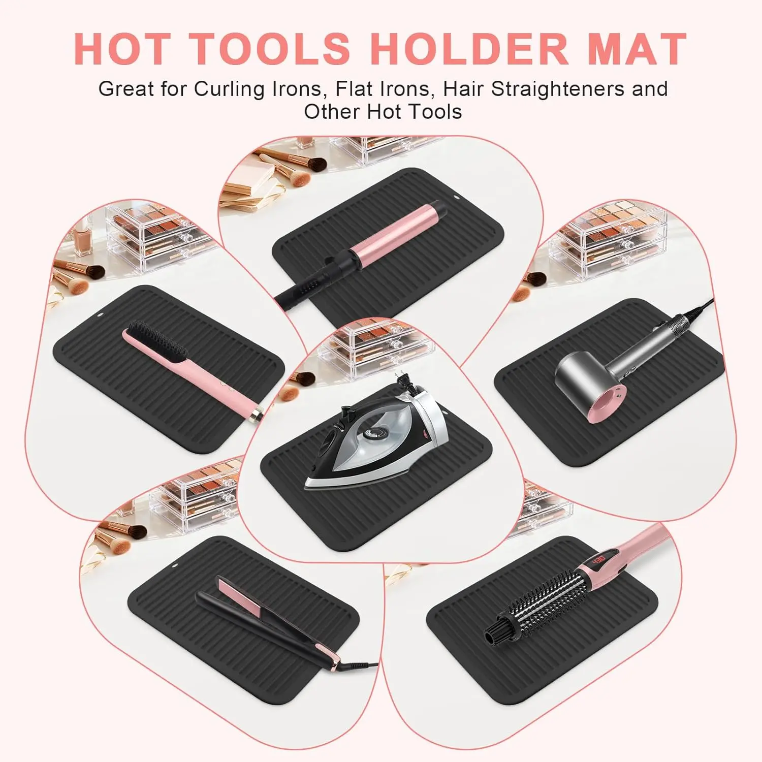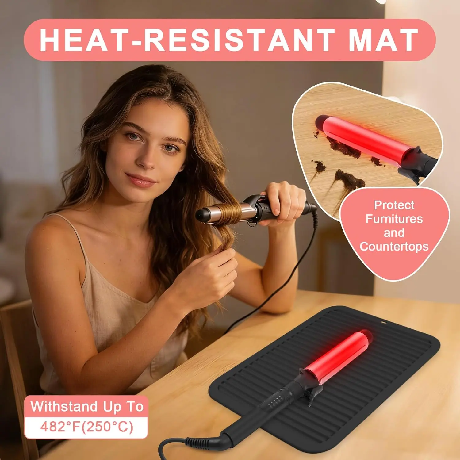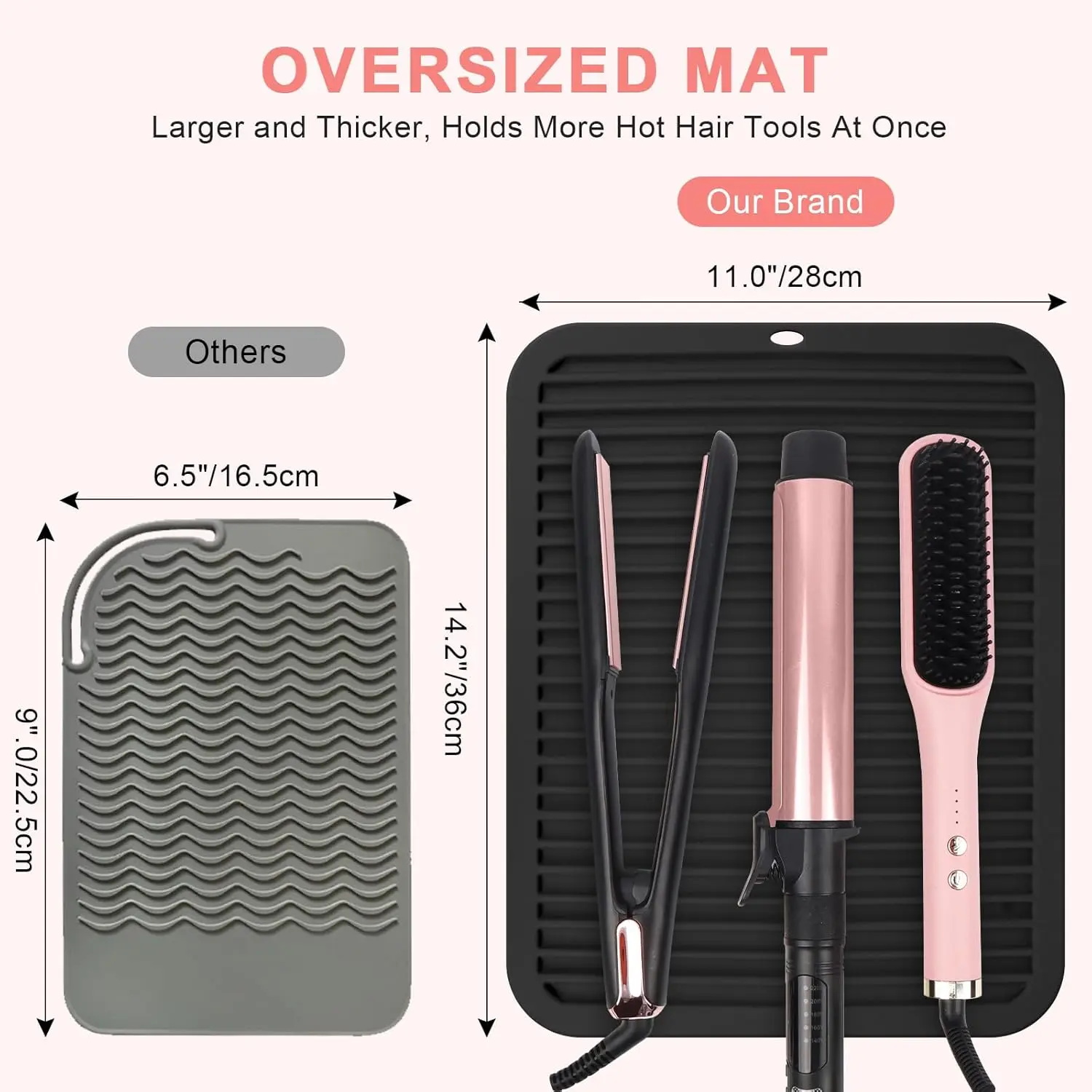 Protect your countertops and furniture from scorching heat with our Heat Resistant Mat! This essential accessory is designed to safeguard surfaces from the damaging effects of hot hair styling tools like flat irons, curling irons, hair straighteners, blow dryers, and hair curlers. Perfect for use at home, while traveling, or in professional hair salons, this mat provides a reliable barrier against heat. Crafted from high-quality, high-temperature resistant silicone, this mat can withstand temperatures up to 482℉ (250℃). Its durable and flexible design ensures long-lasting use and added safety. The oversized design (14.2 x 11.0 inches) accommodates multiple hot styling tools simultaneously, while the raised textured surface provides a secure grip to prevent slipping. Save time and simplify your routine with the versatile design, which includes a Velcro strap to secure hot tools wrapped in the mat for immediate storage after use. The convenient hanging hole allows for easy storage and space-saving. Cleaning is a breeze – simply wash with water or scald with boiled water, then ventilate and dry for a like-new appearance every time.