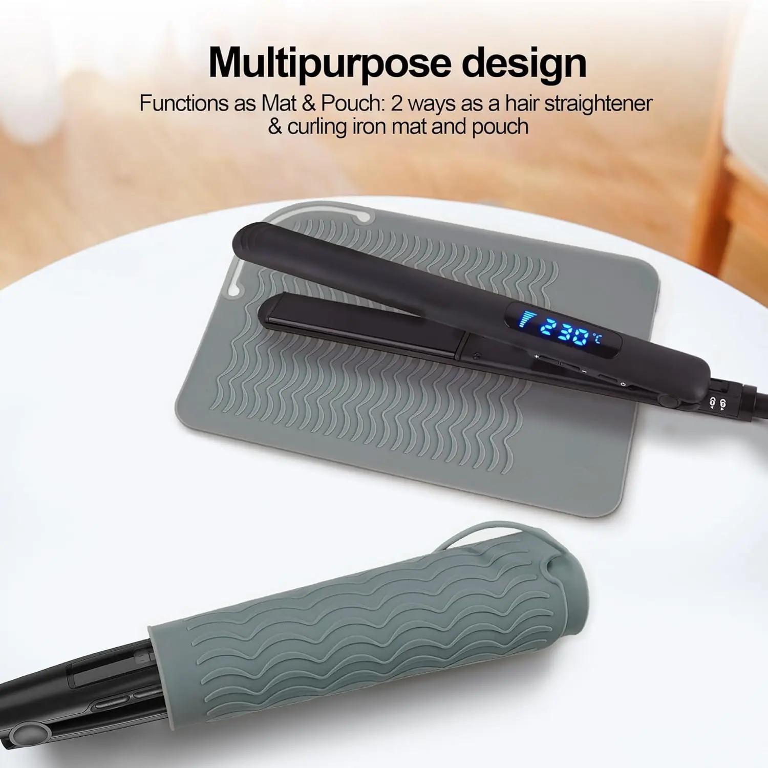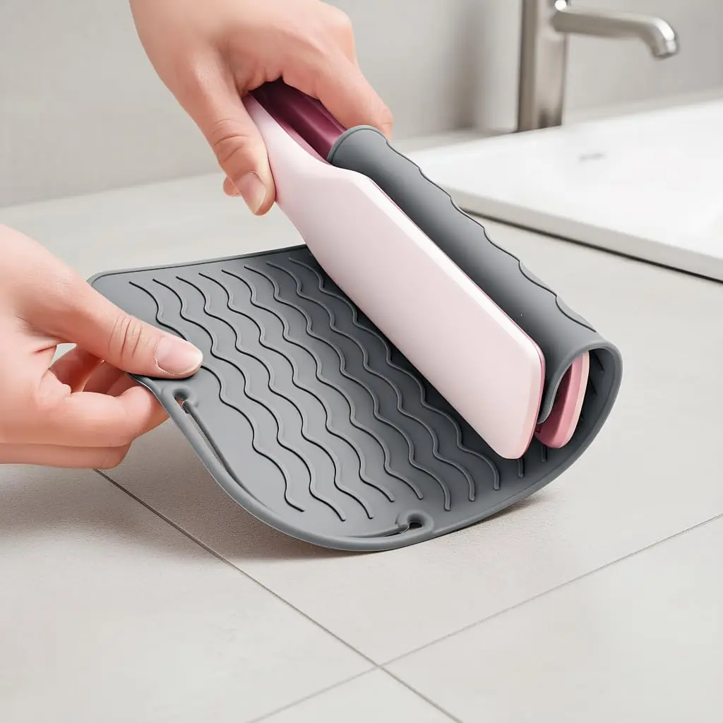 Protect your surfaces from heat damage with our Heat Resistant Mat for Hot Hair Tools. This stylish and functional mat is designed to safely hold your curling irons, flat irons, wands, and other hot styling tools, preventing burns and scratches on your countertops, vanities, and floors. Made from high-quality, heat-resistant silicone, this mat can withstand temperatures up to [Insert Specific Temperature Here], providing a reliable barrier between your hot tools and delicate surfaces. Its non-slip design ensures that your tools stay in place, preventing accidental slips and spills. The gray color complements any décor, and the flexible material allows for easy storage and portability. Whether you’re at home or on the go, this heat-resistant mat is an essential accessory for any hair styling enthusiast. Keep your space safe and stylish with this must-have tool! It is designed with raised edges to contain any residue from your styling products, keeping your surfaces clean and tidy. It’s also easy to clean – simply wipe it down with a damp cloth. This heat mat is durable and long-lasting, it is an investment in protecting your home from burns and scratches. This versatile mat is not only suitable for hot hair tools but also for other heat-sensitive items. Don’t risk damaging your surfaces – invest in our Heat Resistant Mat today!