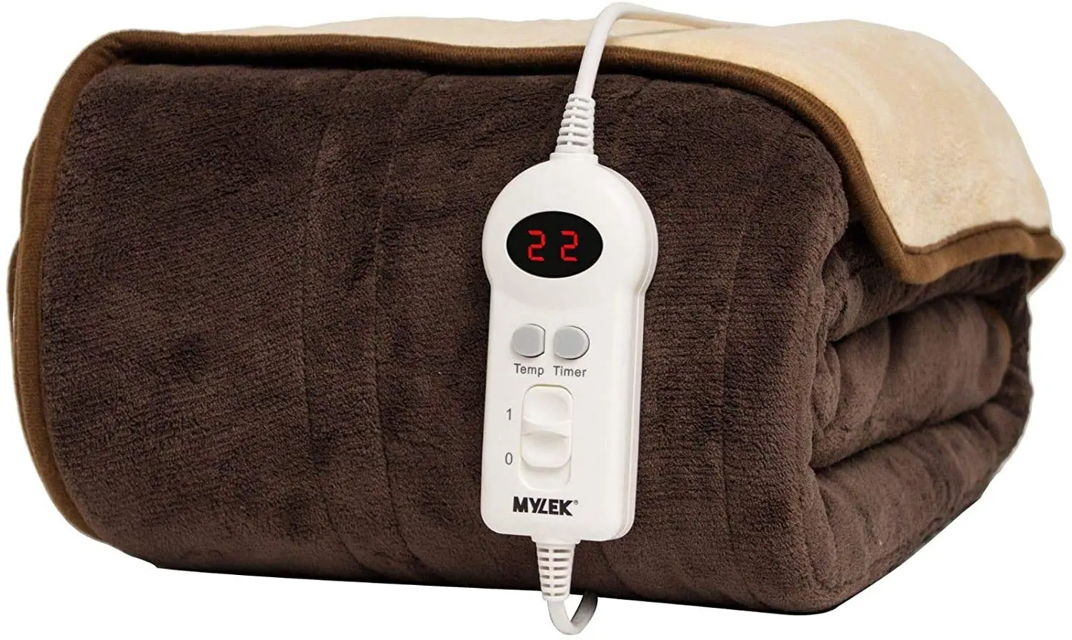 Stay cozy with the Mylek Luxury Heated Throw! Features 9 heat settings, a 9-hour timer, overheat protection, and an eco-controller. Save energy and enjoy ultimate comfort. 160x120cm.