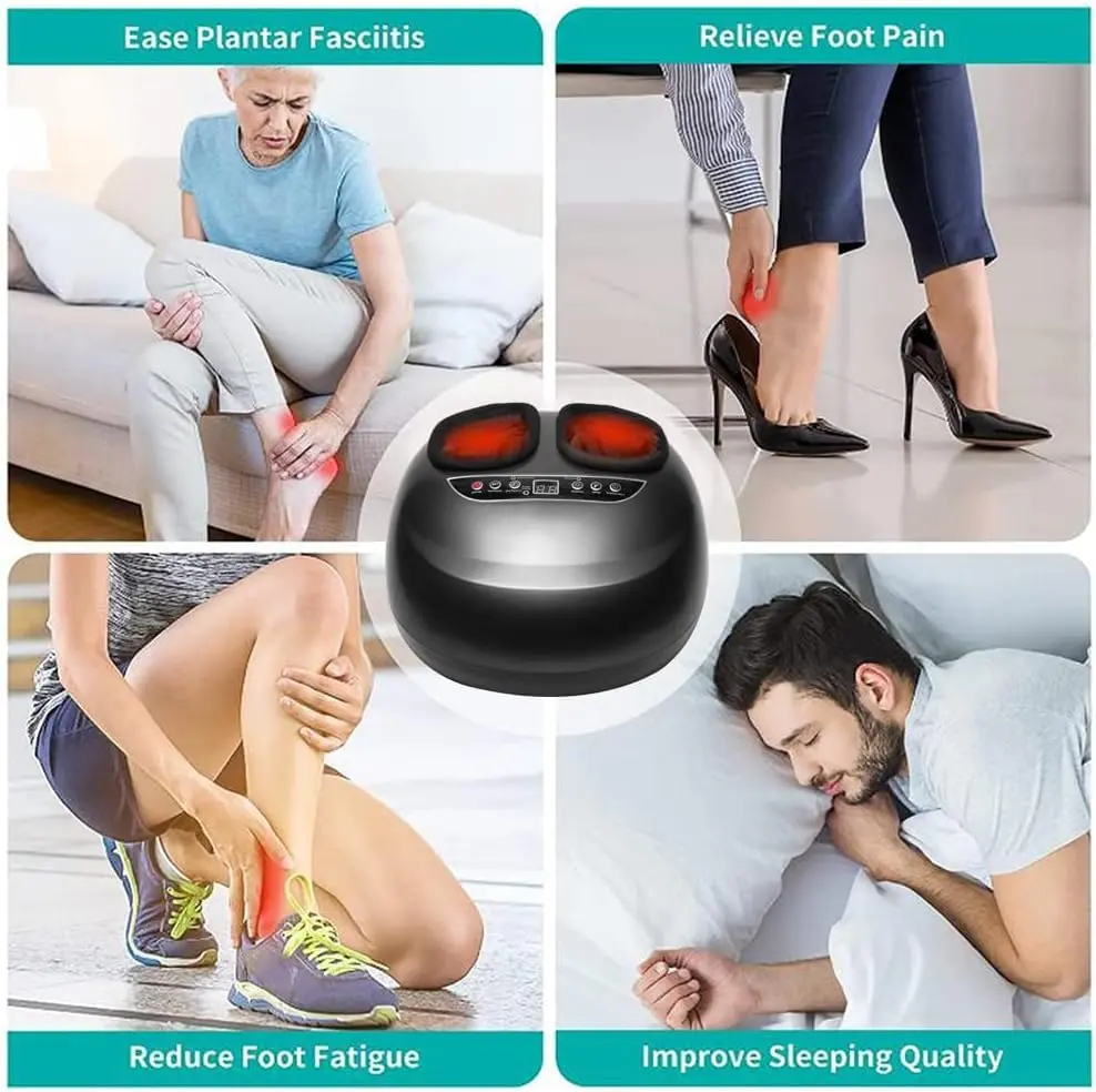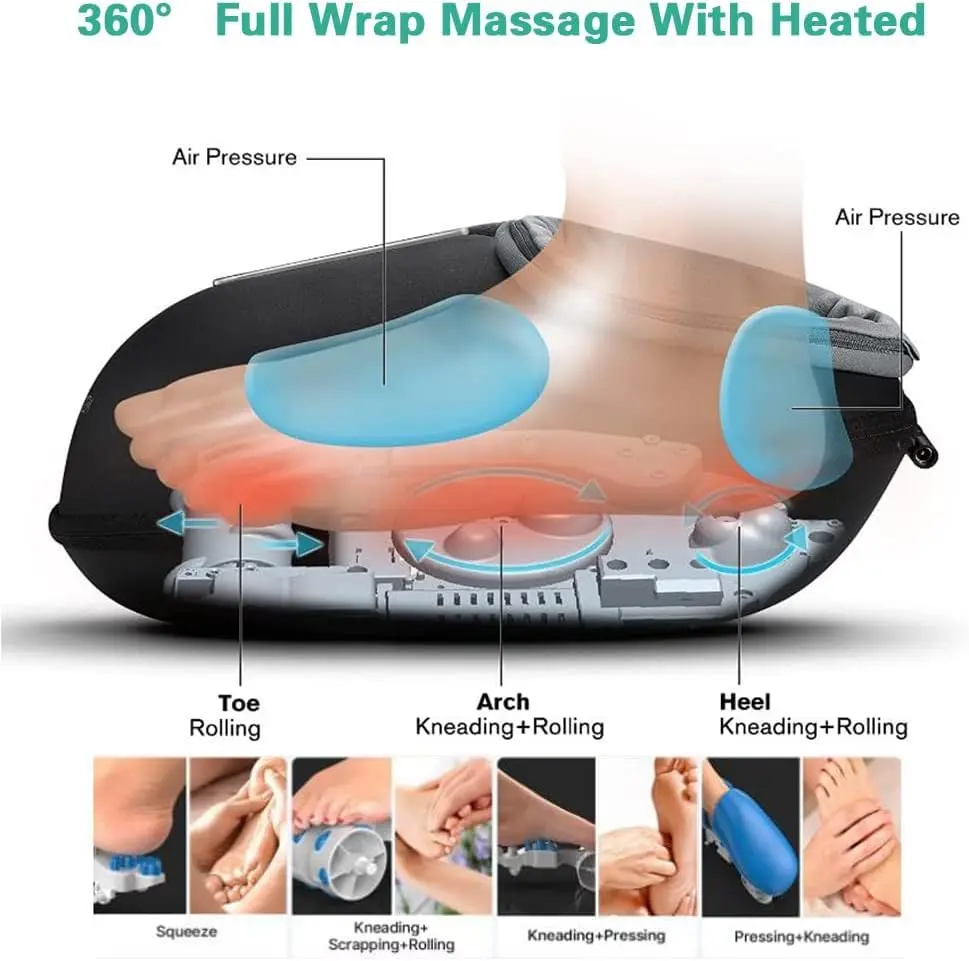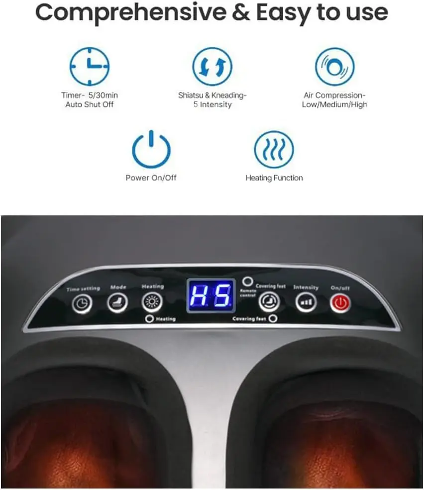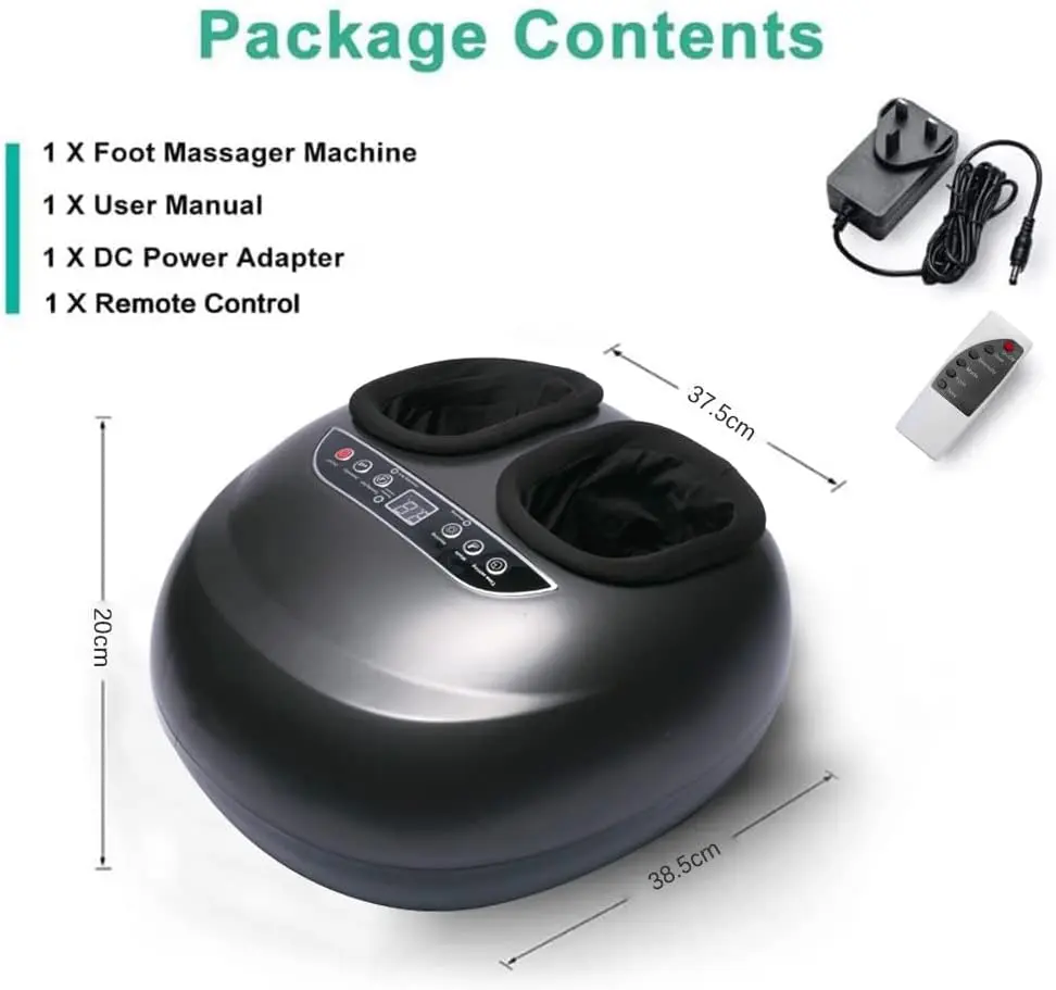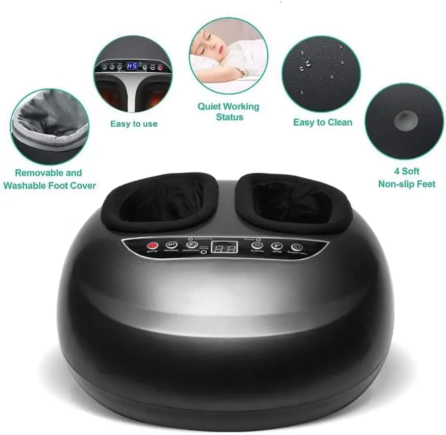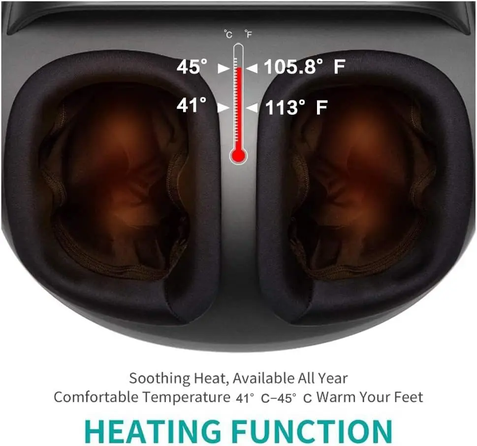 Experience ultimate relaxation and foot pain relief with our heated foot massager! This professional-grade Shiatsu foot massager machine is designed to provide deep kneading, scraping, rolling, heating, and air compression for a comprehensive and therapeutic massage. Two independent foot chambers target the bottom and sides of your feet with rolling and Shiatsu massage, while air pressure applies targeted pressure to all areas, effectively relieving fatigued muscles and overall body tiredness. The ergonomic design ensures a comfortable and complete massage experience. With 5 massage modes and 5 kneading intensity levels, you can customize your massage to your personal preference. The adjustable heat function (41-45℃) gently warms your feet, reducing muscle tension and promoting relaxation. Start with a low intensity level and adjust as needed for optimal comfort. The optional heating function gradually increases the temperature from 105.8 to 113℉ within 3-5 minutes, effectively reducing muscle tension, relieving foot soreness, and creating a deeply relaxing massage effect. You can easily turn the heating function on or off as desired. This foot massager deeply massages your feet, mimicking the skilled touch of a professional masseur. It’s especially effective when used with the deep kneading massage function, allowing you to fully unwind and de-stress after a long and demanding day. The adjustable time setting (5/10/15/20/25/30 minutes) allows you to personalize your massage duration. The device automatically turns off after the set time. The detachable and washable foot sleeves ensure easy cleaning and hygiene, allowing you to share the massager with family and friends without worry.