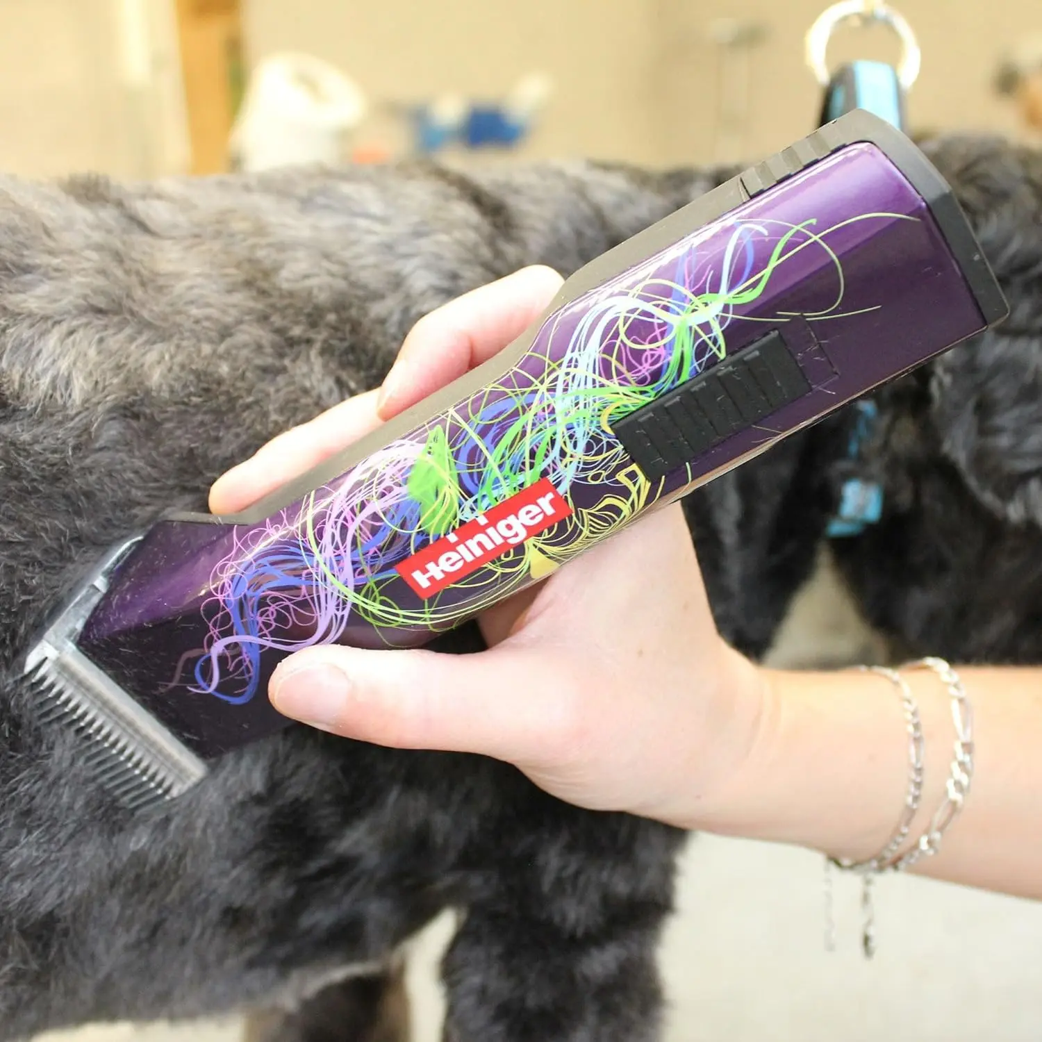 The Heiniger Saphir Purple Cordless Clipper is a top-tier choice for professionals and home groomers alike. Renowned for its exceptional quality and robust power, this cordless clipper delivers outstanding performance without the hassle of cords. Its slim, ergonomically designed hand-piece provides a perfectly balanced feel, ensuring comfortable and effortless use even during extended grooming sessions. With a remarkable speed of 2650 double strokes per minute, the Saphir clipper effortlessly glides through various coat types. Each battery provides 50-60 minutes of continuous clipping time, and the rapid 45-minute recharge time, coupled with the included two batteries and charger, allows for uninterrupted all-day use. Lightweight at just 440 grams and compact in size (204 x 50 x 41 mm), this clipper is incredibly maneuverable. This model includes a #10 blade, making it ready to use right out of the box. Complete with a UK plug, the Heiniger Saphir offers convenience, power, and precision in one sleek package.