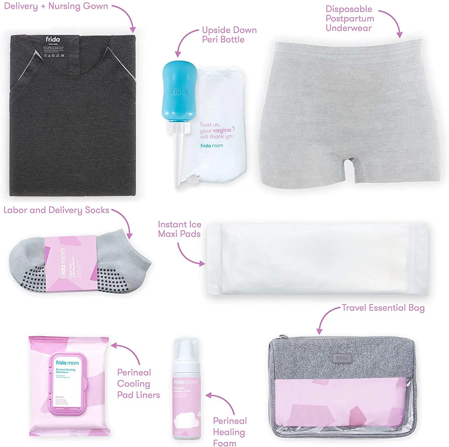 • Includes Peri Bottle, Underwear, Instant Ice Maxi Padsicles, Witch Hazel Pad Liners, and Perineal Healing Foam