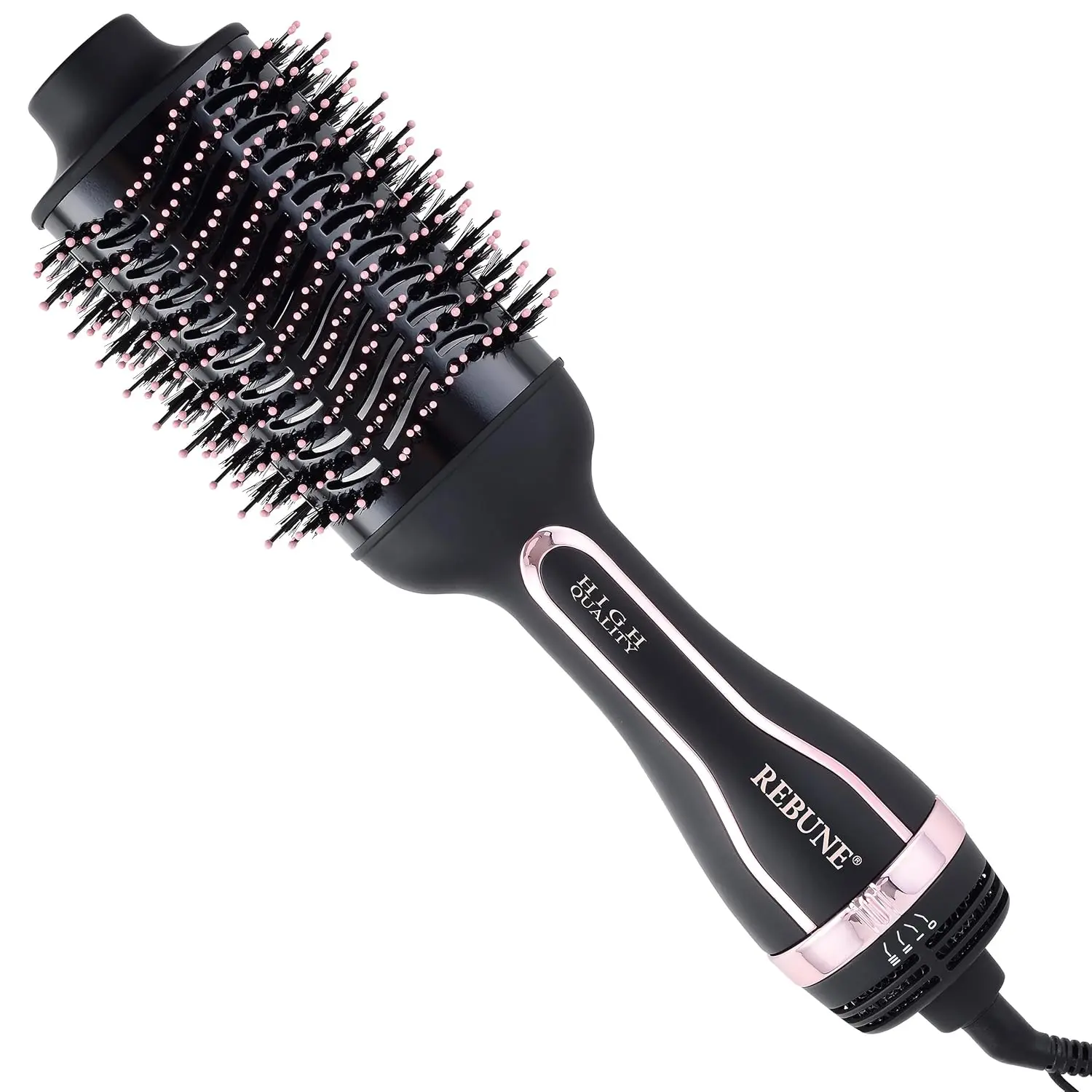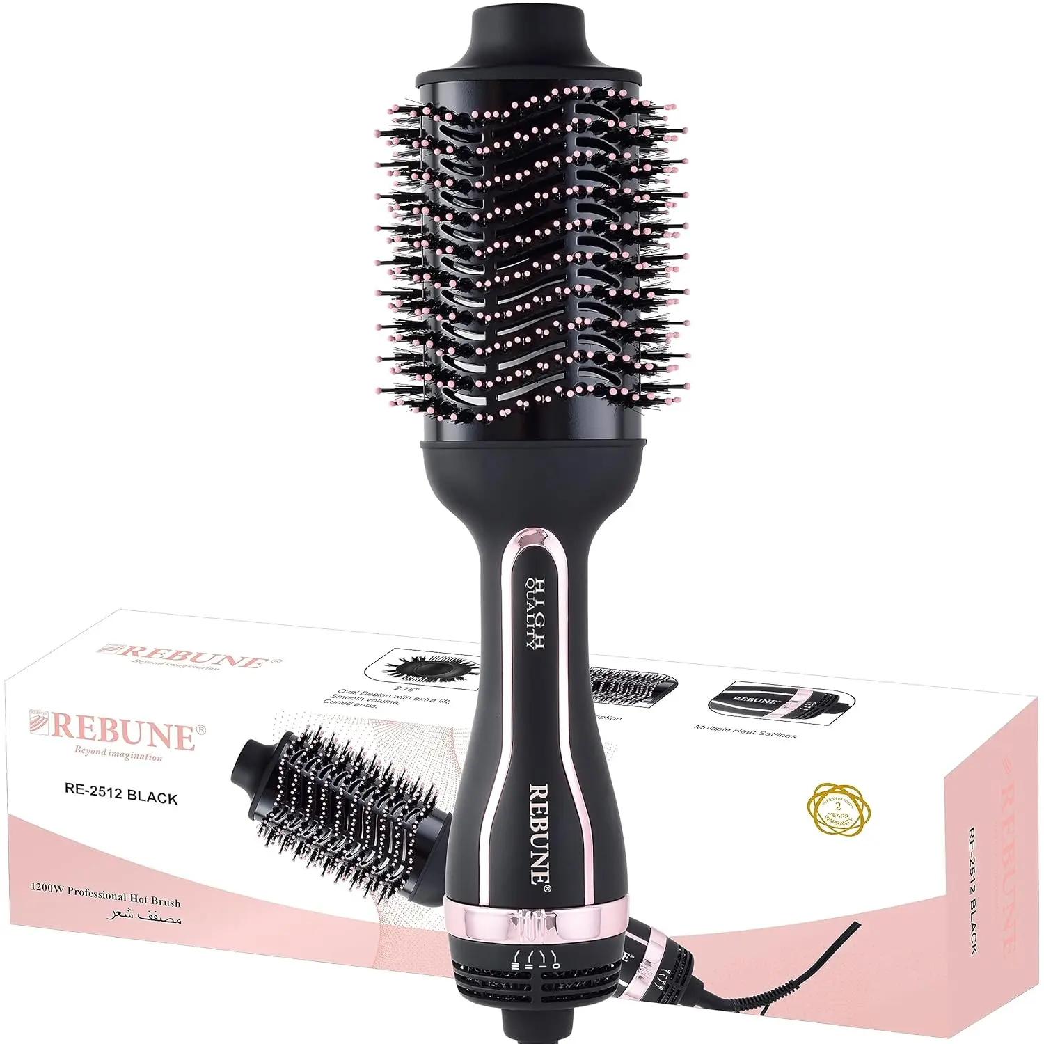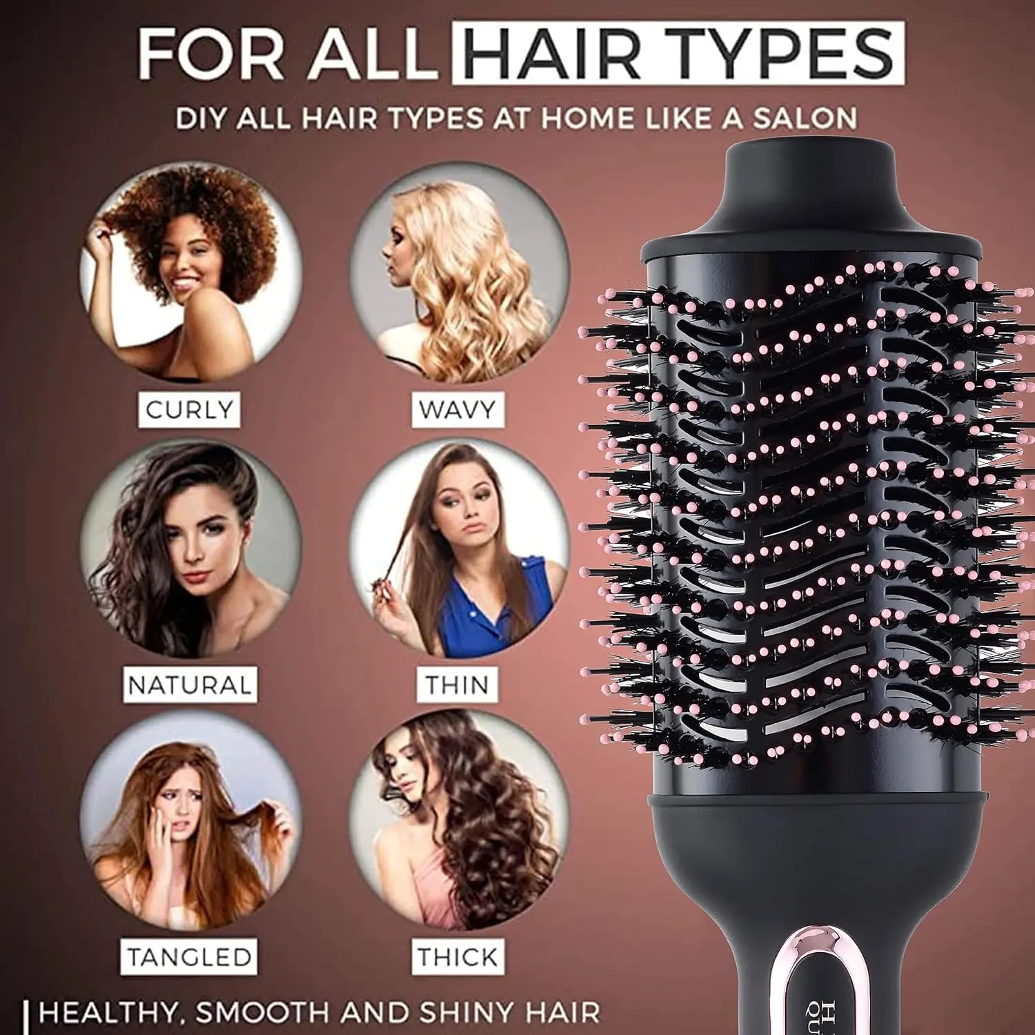 Achieve salon-worthy hair at home with our revolutionary 3-in-1 Hot Air Brush! This versatile tool combines the power of a hair dryer, straightener, and curler, allowing you to effortlessly create a variety of stunning hairstyles. Say goodbye to frizz, tangles, and dullness, and hello to silky, shiny, and voluminous locks. Our hot air brush utilizes advanced ionic technology to condition and nourish your hair, reducing damage and promoting healthy growth. Negative ions neutralize static and frizz, leaving your hair smooth, manageable, and radiant. With 1200 Watts of power and adjustable temperature settings, you can customize the heat to suit your hair type and desired style. The unique oval design and 360° swivel cord provide maximum flexibility and ease of use, while the massaging ball tips gently stimulate the scalp and promote blood circulation. The mixed nylon pins and tufted bristles are designed to glide effortlessly through your hair without snagging or tearing, ensuring a smooth and comfortable styling experience. Whether you want to straighten, curl, or add volume, our hot air brush is the perfect tool to achieve your desired look. Its unique airflow design ensures faster drying, saving you time and effort. Experience the difference and unlock your hair’s full potential with our 3-in-1 Hot Air Brush!