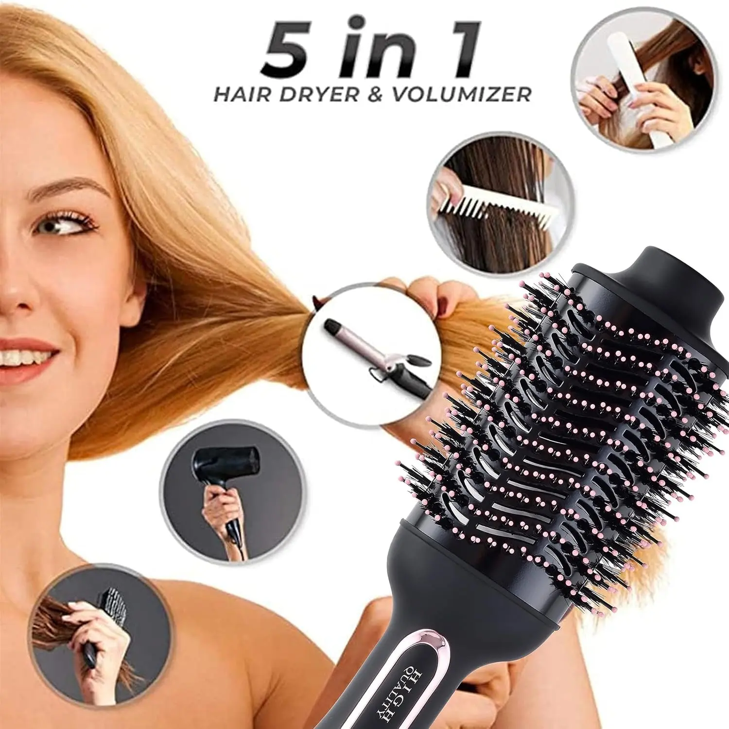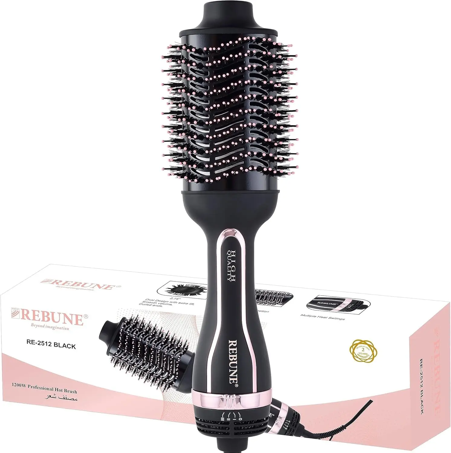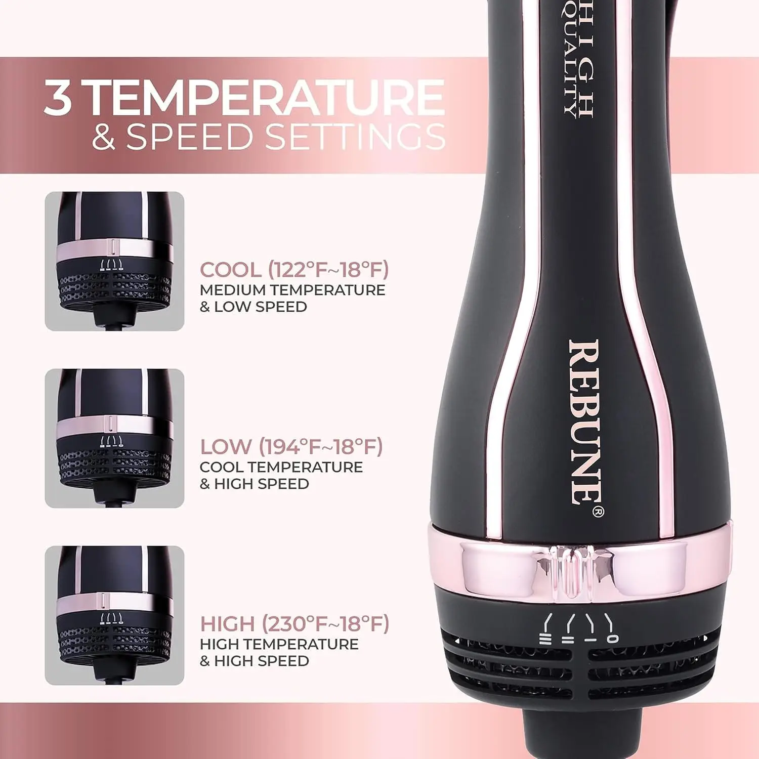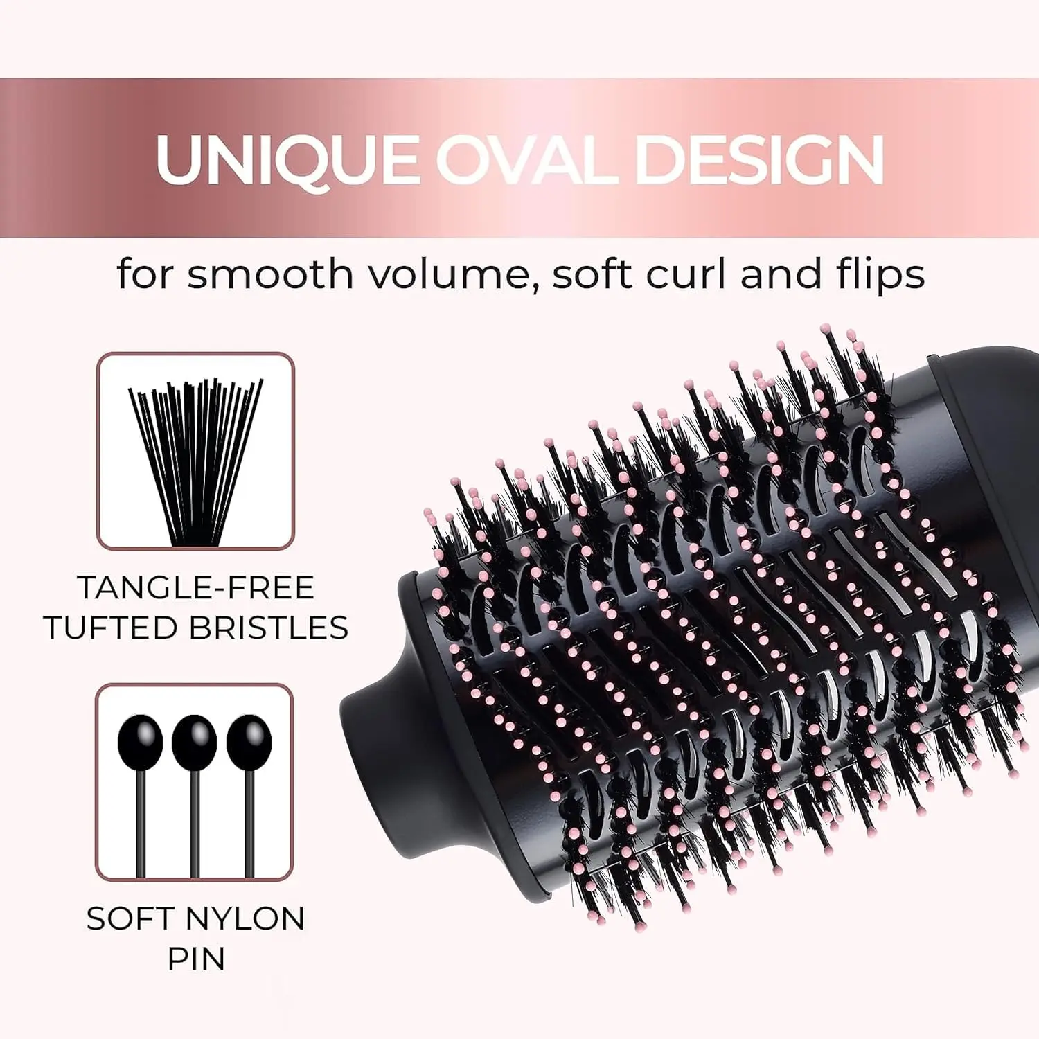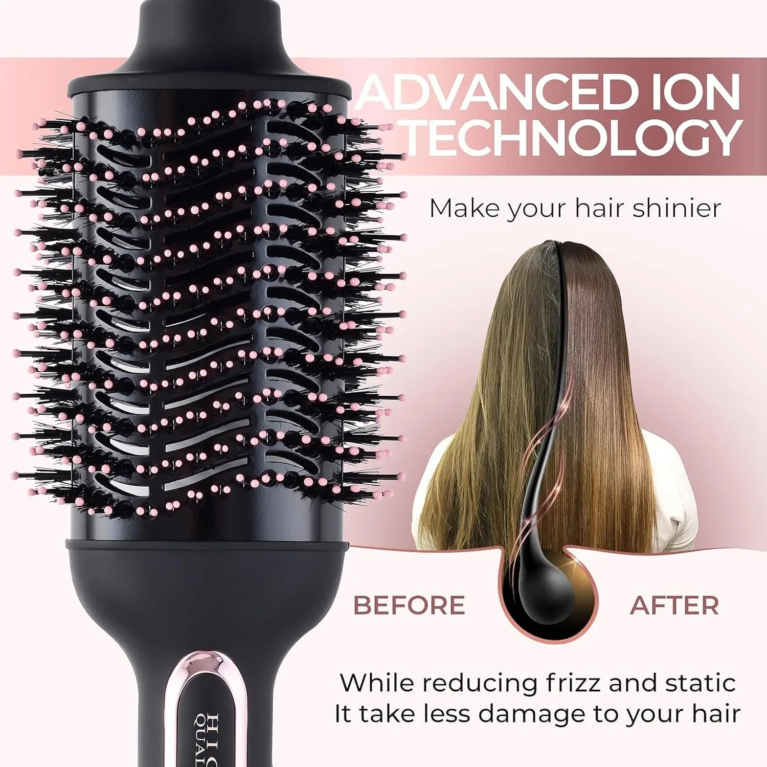 Achieve salon-worthy hair at home with our revolutionary 3-in-1 Hot Air Brush! This innovative tool combines the power of a hair dryer, straightener, and curler, allowing you to effortlessly create a variety of stunning hairstyles. Say goodbye to tangled tresses and hello to silky, shiny, and voluminous hair. The hot air brush is designed to make styling your hair a breeze. It features Ionic Technology, which releases negative ions to condition and nourish damaged hair, reducing frizz and static for a smooth and polished finish. You can customize the heat and speed settings to suit your hair type and desired style. With 1200 watts of power and three heat selections, the brush dries hair quickly while minimizing damage. The unique oval design and 360° swivel cord offer maximum flexibility and ease of use, preventing tangles and allowing you to move freely. The massaging ball tips gently stimulate the scalp while drying, smoothing, and styling your hair in half the time. The mixed nylon pins and tufted bristles glide through hair without tangling or tearing, ensuring a comfortable and effective styling experience. Its unique airflow design can dry hair faster. It helps you create hairstyles to keep your hair full, bulky, and keep your hair healthy. Whether you want to straighten, curl, or add volume, this hot air brush is your all-in-one solution for achieving beautiful, healthy-looking hair.