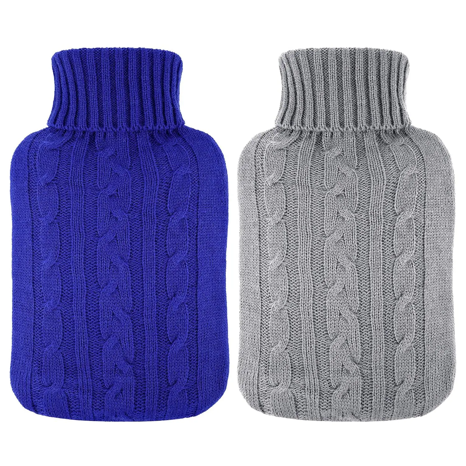 Get 2 winter knitted hot water bottle sweater covers in charming colors. Soft, breathable knitted fabric keeps water hot & relieves muscle aches. Fits 2L bottles, perfect winter gift!