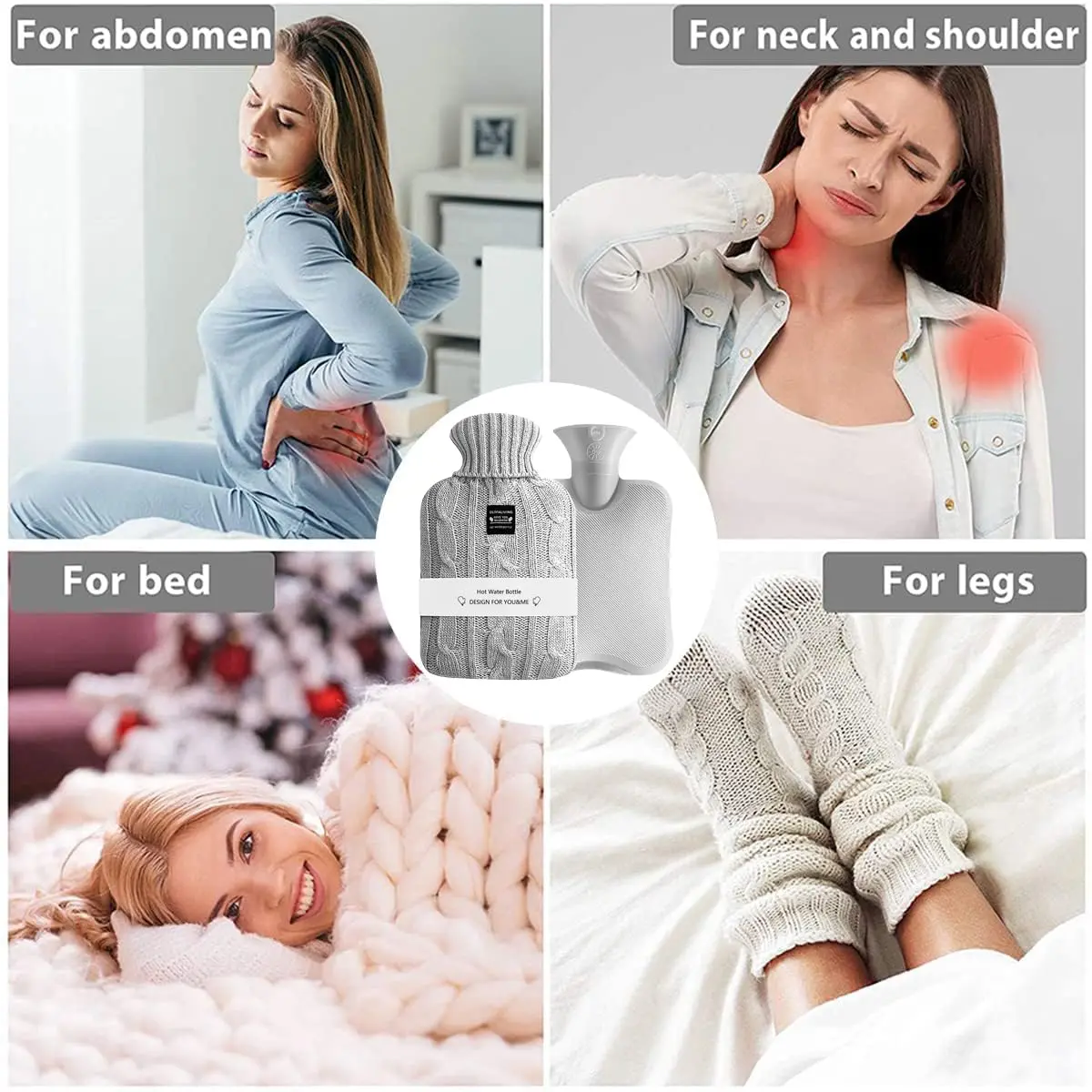 The grid structure provides a safer and more comfortable skin contact experience. The included elegant knitted cover not only enhances the bottle’s appearance but also prevents direct skin contact with the hot rubber, reducing the risk of burns. Remember to replace the rubber bottle after two years of use and regularly inspect the stopper for any signs of wear. Enjoy warmth and relief. It is ideal for those winter months where extra warmth is needed. Stay comfortable and ease pain with this hot water bottle, providing soothing relief for sore muscles, stress, cramps, arthritis, pain, stiff neck, lower back pain, menstrual pain. The bottle can also be used for cold therapy for those with minor injuries.
