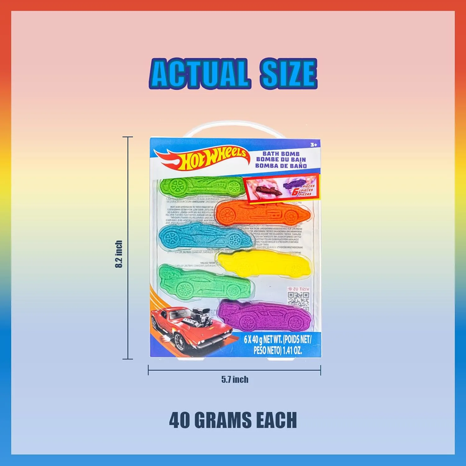 6 Hot Wheels car bath bombs for kids 3+. Bubble gum scented, fun & fizzy bath time experience. Perfect gift for birthdays, holidays, or just because! Makes bath time fun again!