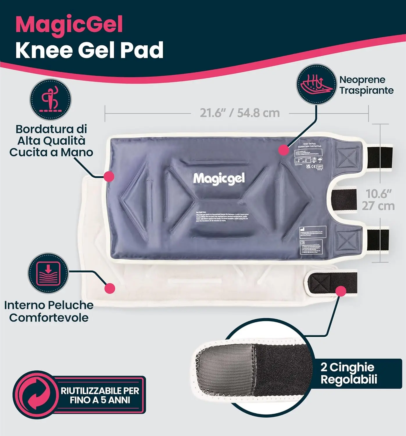 • Durable Straps: Reusable gel packs with adjustable hook and loop fasteners.