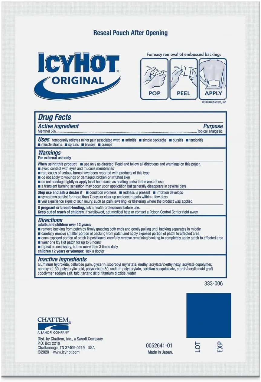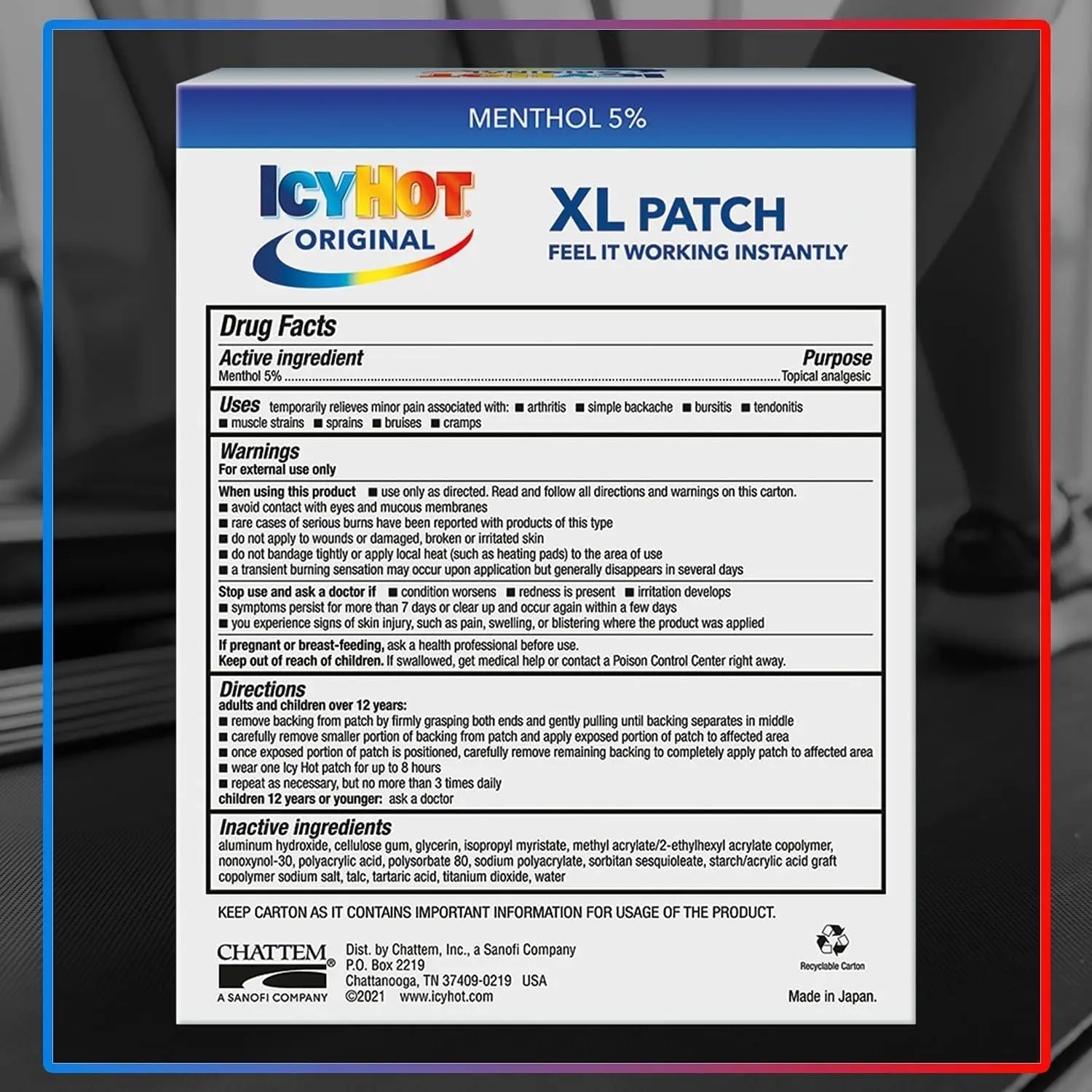 The Icy Hot Back Patch XL provides targeted, long-lasting relief from back pain. Experience the power of icy coolness and warming heat for up to 8 hours. Easy to apply, mess-free, and extra-large for maximum coverage.