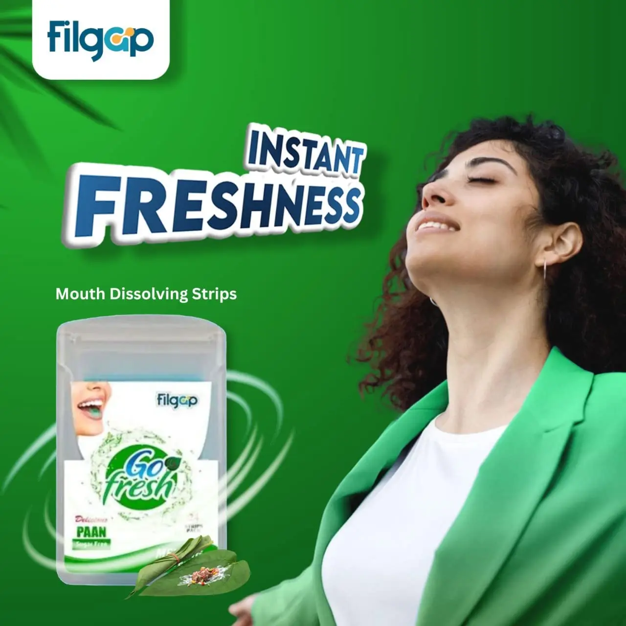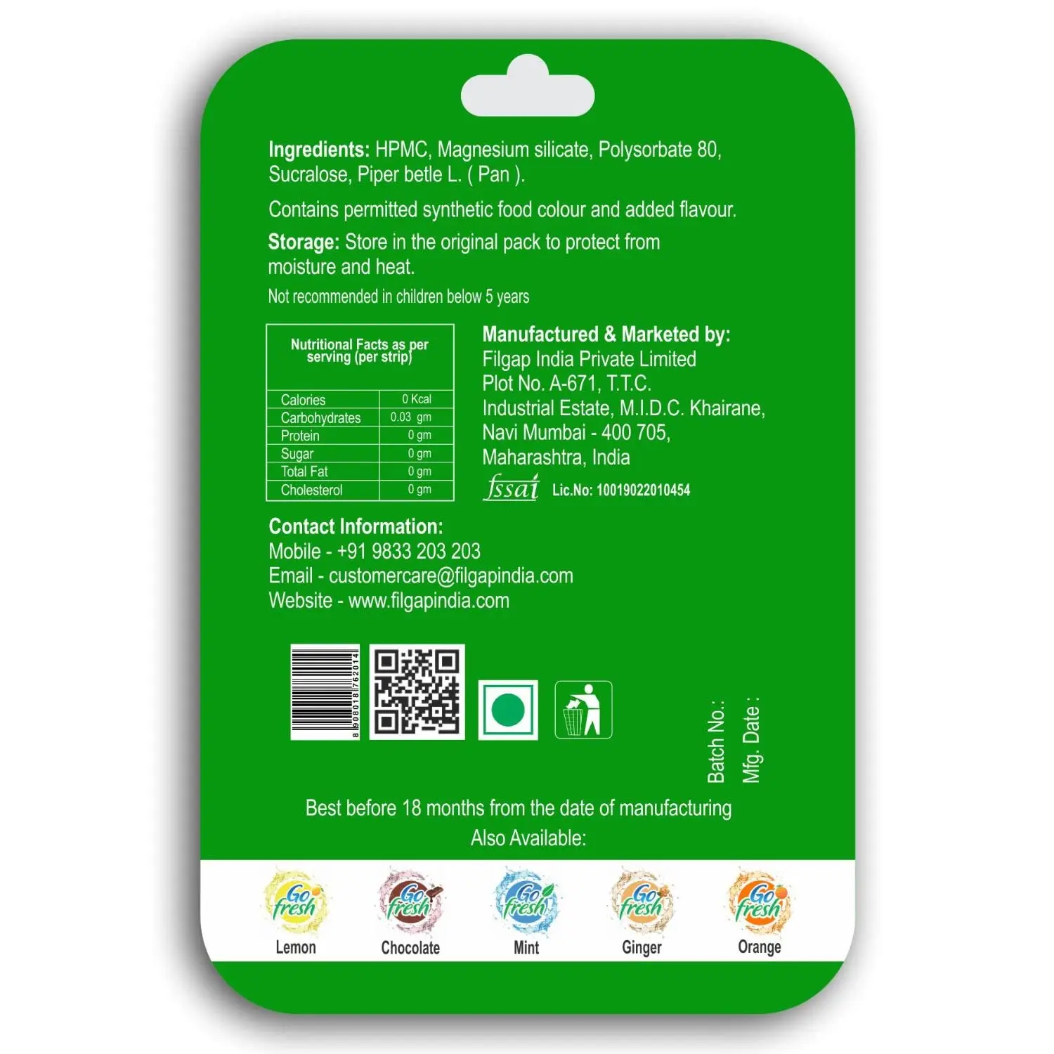 Experience instant fresh breath confidence with our uniquely formulated fresh breath strips. These Instant Mouth Freshener Strips in Paan Flavor provide a burst of refreshing coolness in seconds! Unlike chewing gum or sugary mints, our strips offer a guilt-free way to freshen your breath without harming your teeth or gums. Made with innovative film technology, these sugar-free strips dissolve instantly on your tongue, fighting bad breath germs at the source. Enjoy the exotic taste of Paan while eliminating odor-causing bacteria. No need to chew or swallow – these orally disintegrating strips melt away quickly, leaving you with a clean and refreshed feeling. Perfect for those moments when you can’t reach a washroom for a quick mouthwash rinse, or when you want a discreet and effective way to freshen your breath. Our strips are conveniently packaged in a small, portable container that easily fits in your wallet or pocket, making them a hygienic and accessible way to maintain fresh breath throughout the day. Say goodbye to paper wrappers and hello to a convenient and refreshing solution for instant fresh breath! Have as many strips as you want without worrying about your oral health. Get freshness without harming your gums or teeth. These strips uses the most innovative film technology for oral hygiene and fresh breath. The sugar free films once placed on your tongue, instantly dissolve and fight with the bad bacteria in your mouth that create an odor. Our strips are easily disintegrable and avoid trouble of swallowing or chewing.