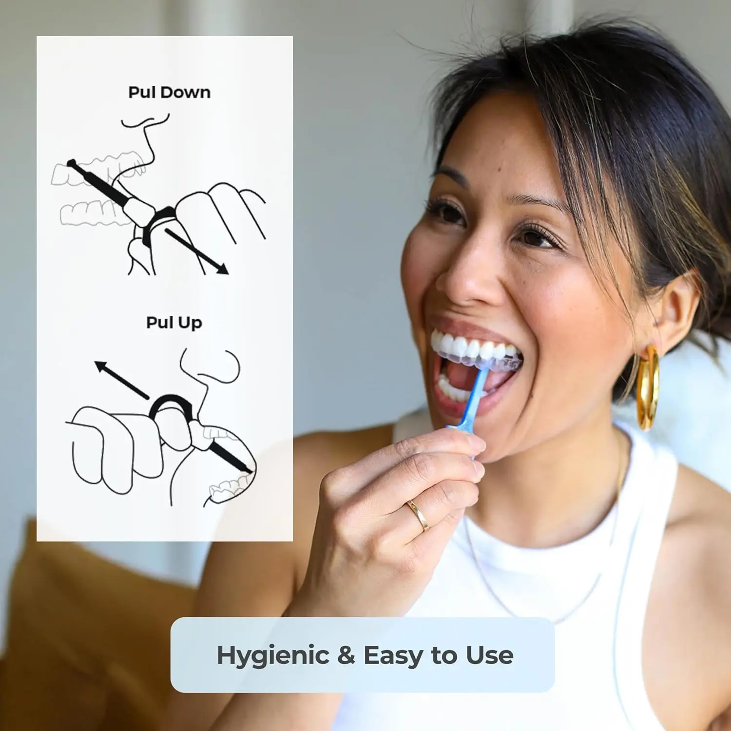 Struggling to remove your clear aligners? PULTOOL offers a simple, hygienic, and pain-free solution! Designed by a dental assistant, PULTOOL is specifically engineered to make clear aligner removal easy for Invisalign, Smile Direct Club, ClearCorrect, and other clear aligner systems. Say goodbye to awkward fingernail struggles and hello to effortless removal. PULTOOL is durable, compact, and discreet, easily fitting inside your Invisalign retainer case for on-the-go convenience. Made from BPA-free material, PULTOOL is a safe and hygienic way to remove your retainers. Whether you have buttons or attachments on your teeth, PULTOOL’s design ensures a comfortable and effective removal process. Works with clear aligners, whitening trays, Invisalign, and invisible braces. Get your 2-pack today and experience the PULTOOL difference! No more struggling and no more pain. Just easy, convenient, and hygienic aligner removal. Keep your aligners clean, keep your fingers safe, and keep your smile bright with PULTOOL. Enjoy a more comfortable and confident aligner experience. PULTOOL – your smile’s best friend!