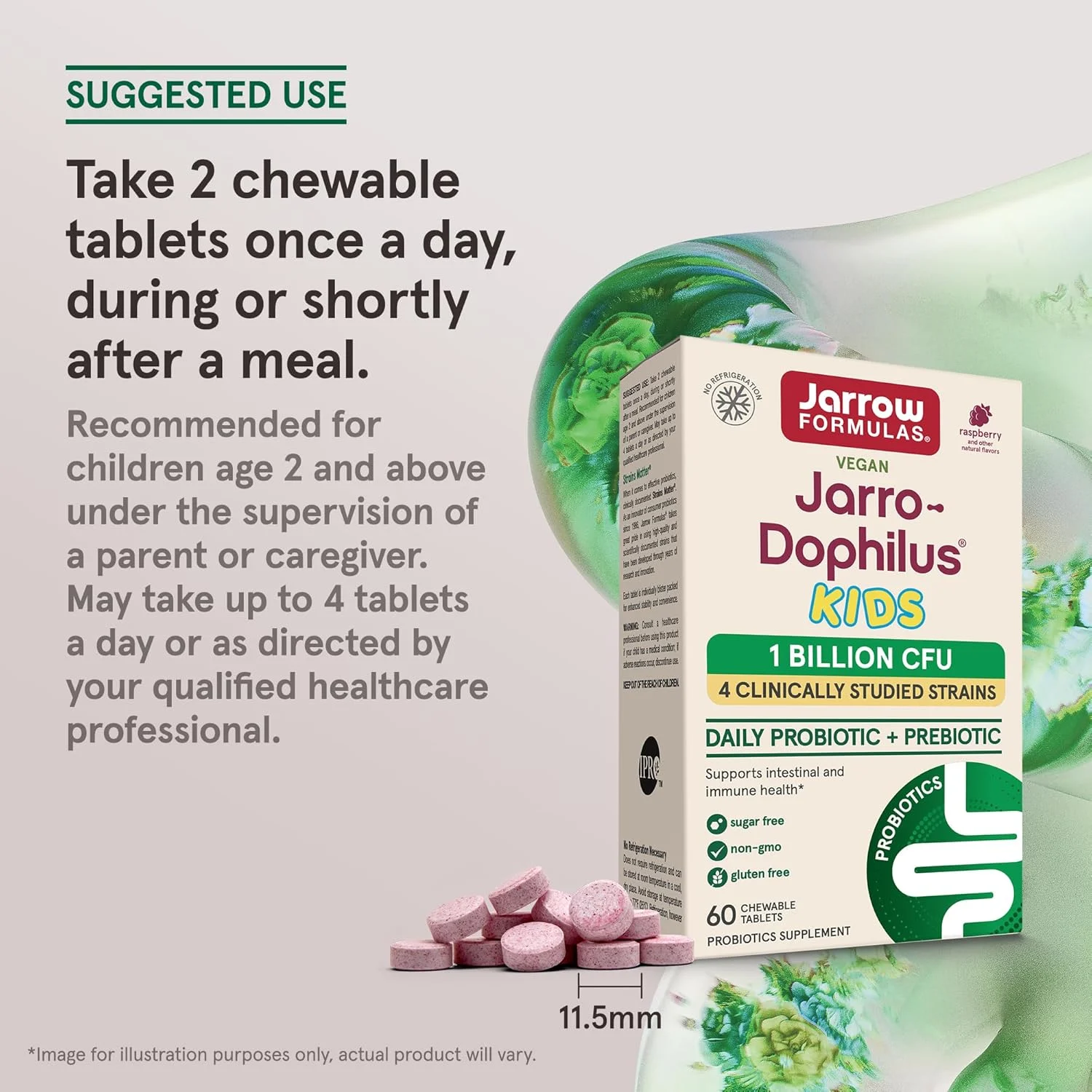 Support your child’s digestive health with Jarrow Kids Probiotic Raspberry! This delicious, chewable probiotic is specifically formulated for children, delivering beneficial bacteria to promote a healthy gut microbiome. Each tablet contains a blend of probiotic strains known to support immune function, aid in nutrient absorption, and help maintain a balanced digestive system. The natural raspberry flavor makes it easy to get kids to take their daily probiotic. Jarrow Kids Probiotic is a convenient and effective way to help your child thrive. Support your little ones overall wellness with this delicious and beneficial dietary supplement. Give your children the advantage of a healthy gut with the power of probiotics. Promote optimal health with a formula they’ll love! With 60 chewable tablets per bottle, you’ll have a two-month supply of these essential probiotics. Choose Jarrow Kids Probiotic Raspberry for a happy, healthy gut. A healthy gut contributes significantly to overall well-being. Give your children the gift of better health with this tasty and effective probiotic supplement.