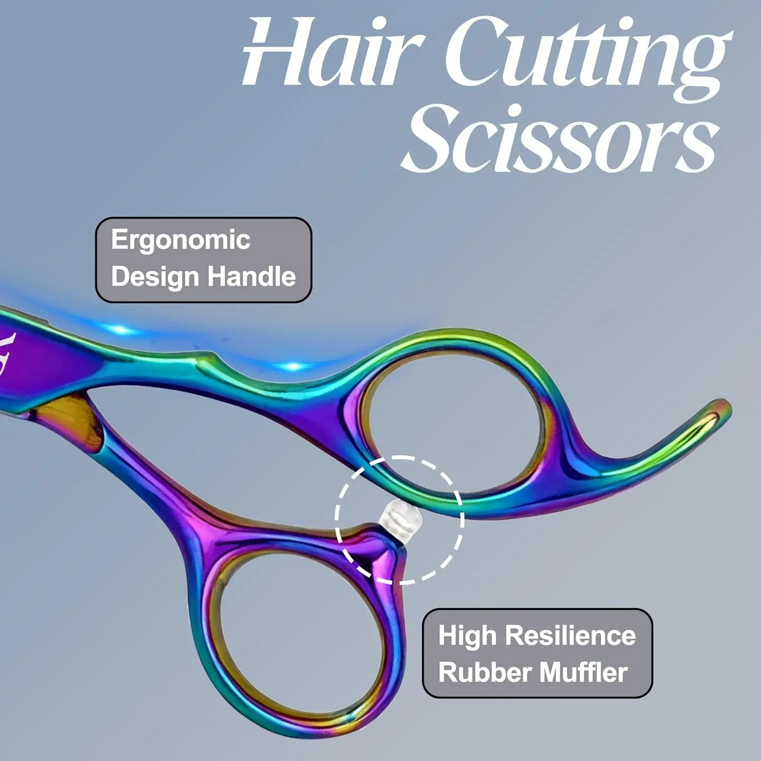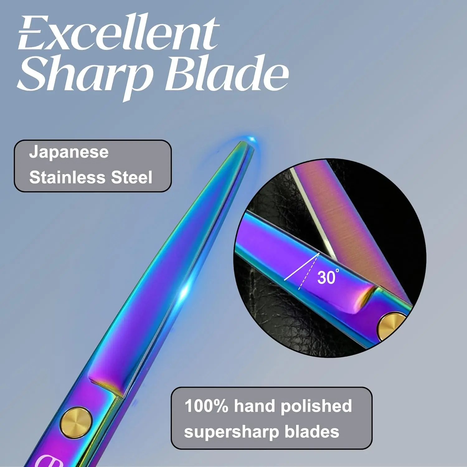 Experience the pinnacle of precision and artistry with JAVENPRO Hair Cutting Shears. These tailor-made, high-end hairdressing scissors are meticulously crafted for professionals who demand excellence. We use premium Japanese imported 420c steel, ensuring exceptional sharpness, durability, and resistance to wear. Each pair is 100% handmade, reflecting our unwavering commitment to quality and customer satisfaction. The ergonomic curved handle is designed for comfortable, all-day use, reducing strain and allowing your fingers to move freely and independently. The incredibly sharp blades effortlessly cut through all types of hair, wet or dry, delivering clean, precise results every time. The blade is carefully crafted through a multi-step process revealing the line of the blade with clarity. Fine-tuning bearings integrated into the adjuster provide superior stability, smooth opening and closing action, and minimized friction for enhanced control. The scissors also incorporate a firm VG10 steel regulator. With a Rockwell hardness rating of 62HRC, these scissors are built to withstand the rigors of daily use in a busy salon environment for years to come. The blades are hand-sharpened razor edges. We prioritize comfort by keeping the weight between 2.11 and 2.2 ounces. We have also improved the inner diameter of the ring to accommodate any finger!