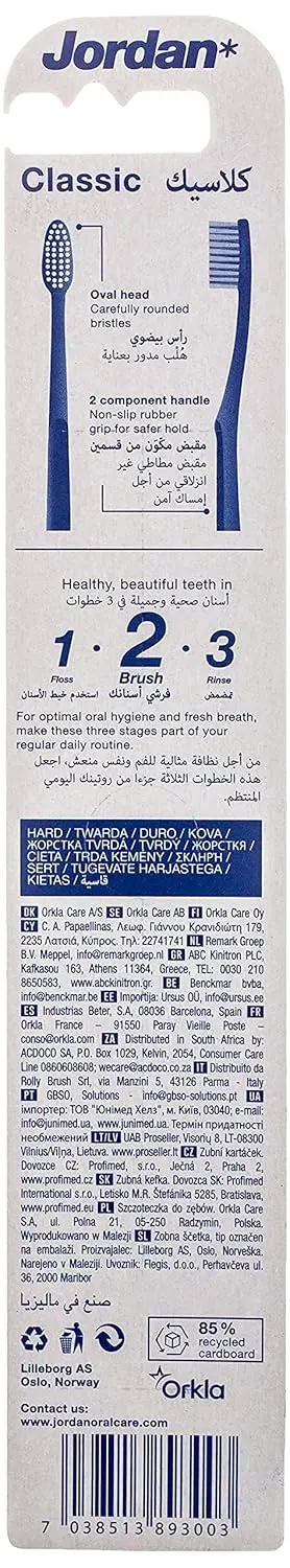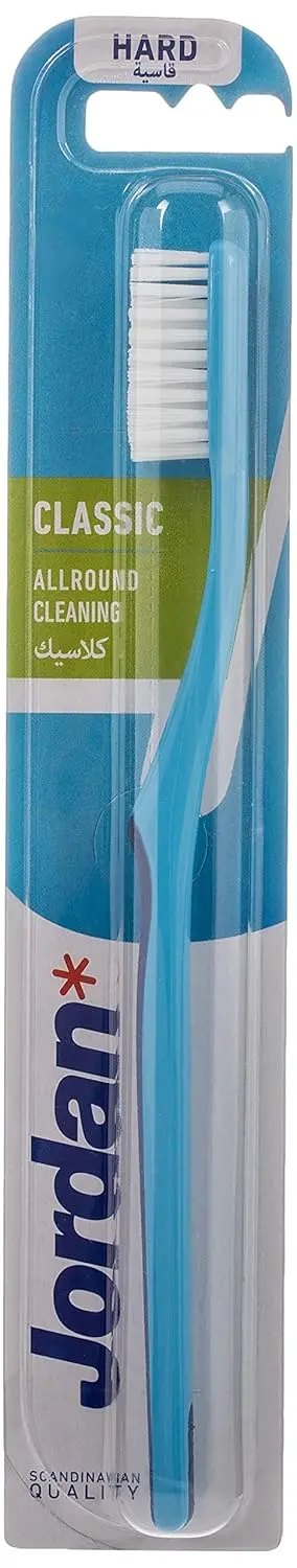 The Jordan Classic Toothbrush Hard provides a reliable and effective clean with its oval head, rounded bristles, and non-slip grip. Comes in assorted colors for a vibrant touch to your daily routine.