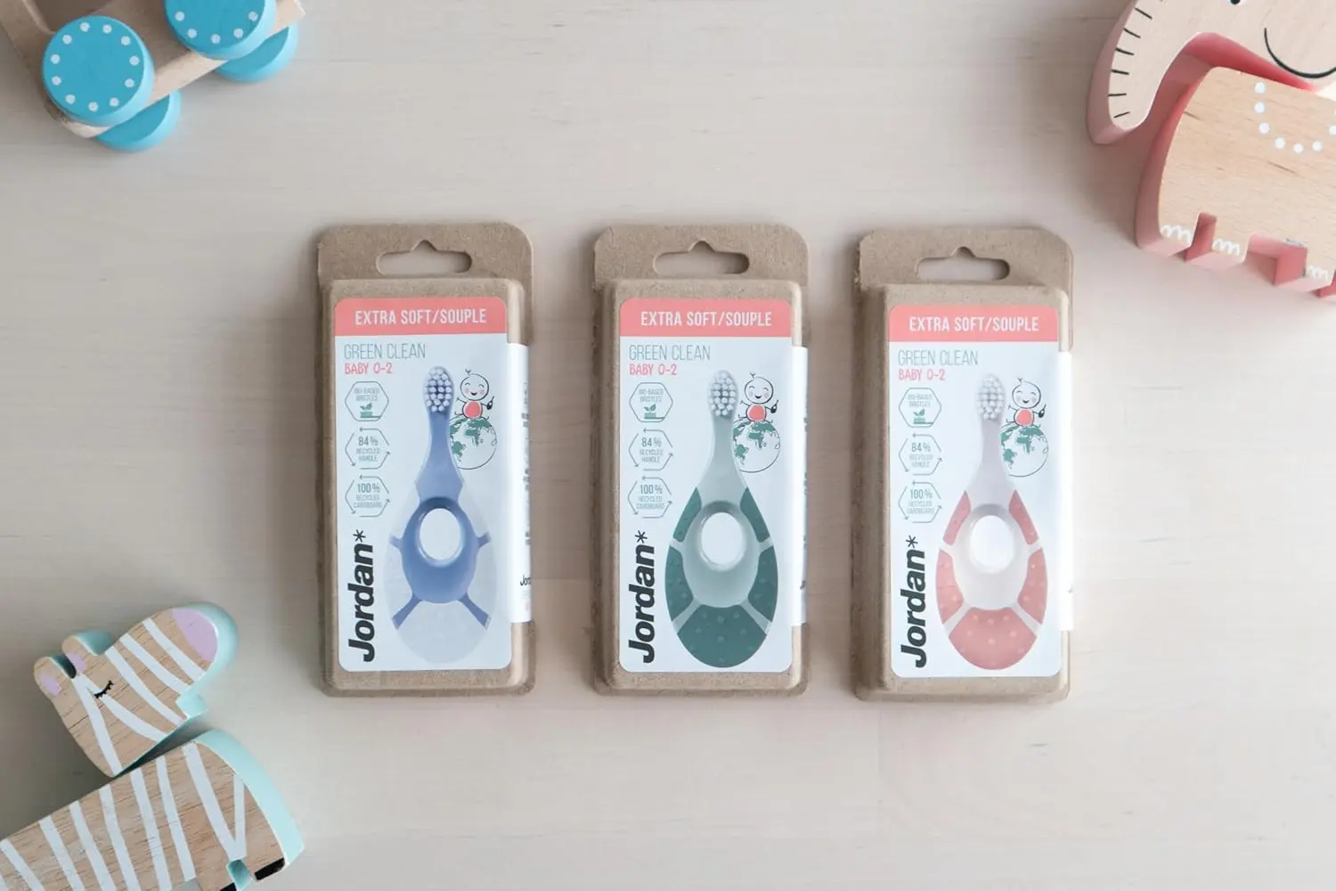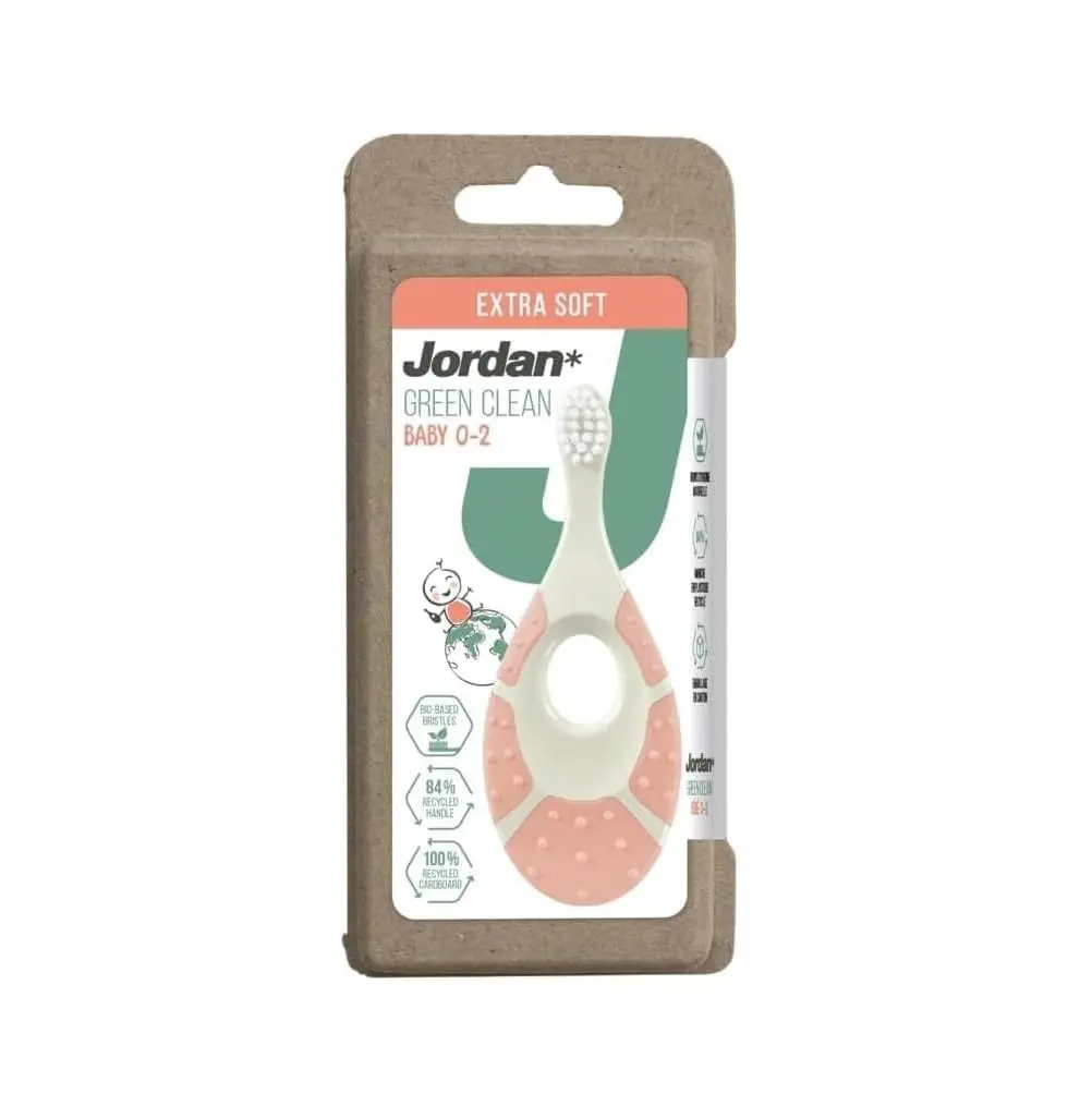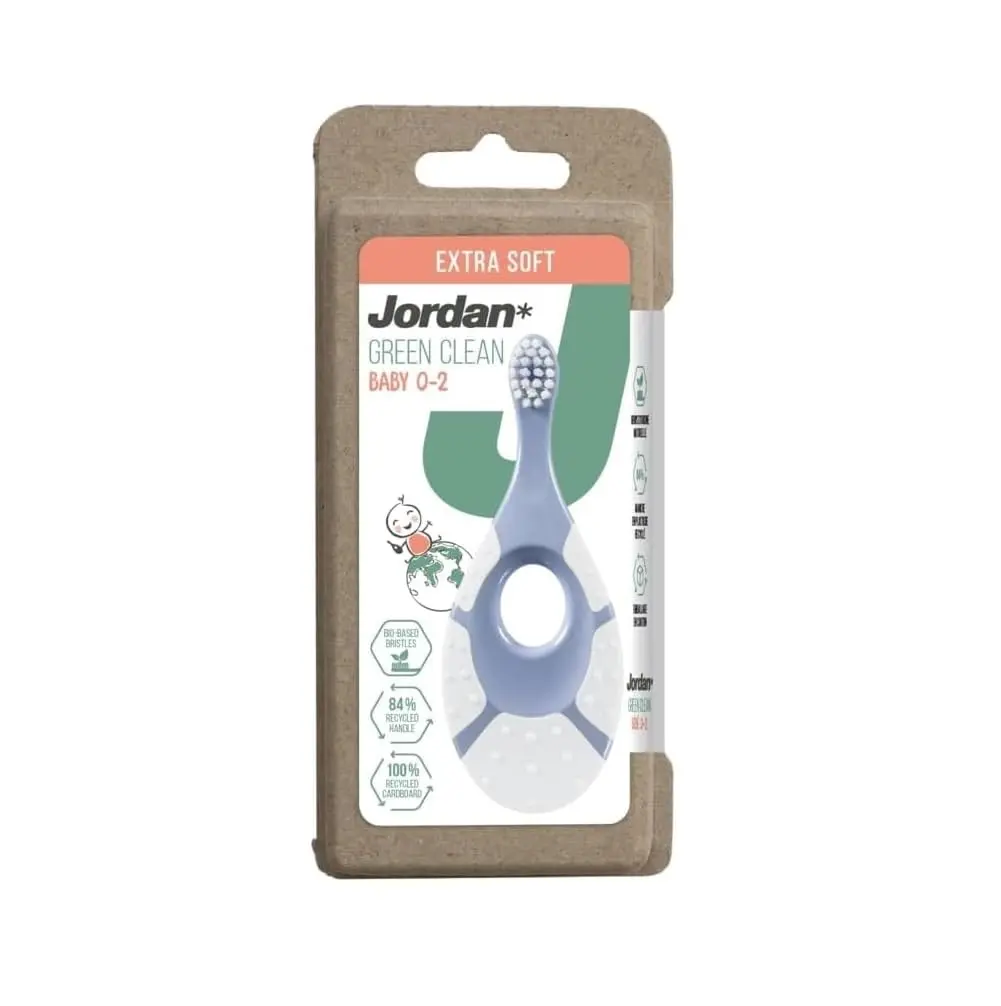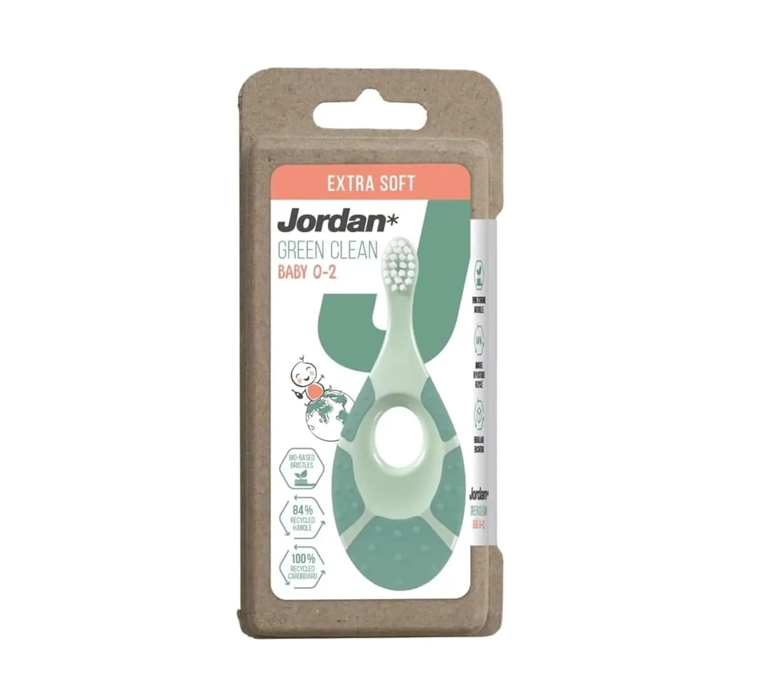 The Jordan Green Clean baby toothbrush is expertly designed to gently introduce your little one to the world of oral hygiene. Created specifically for babies aged 0-2 years, this toothbrush is a perfect first step in establishing healthy and happy dental care routines that will last a lifetime. Its extra soft bristles, made from 100% biobased nylon, are gentle on delicate gums and emerging teeth. The ergonomically designed handle, crafted from 84% safe recycled plastic, is shaped to comfortably fit both babies’ and parents’ hands, making brushing time easier and more enjoyable. Not only is this toothbrush gentle and effective, but it’s also environmentally conscious. Packaged in 100% recycled cardboard, the Jordan Green Clean baby toothbrush demonstrates a commitment to sustainability from product to packaging. This toothbrush features a soft biting ring, designed to soothe teething gums and provide a safe and comfortable experience for your baby. Choose the Jordan Green Clean baby toothbrush for a gentle, sustainable, and effective start to your child’s oral health journey.
