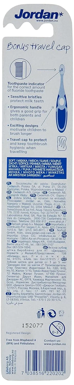 The Jordan Step 2 toothbrush is expertly designed for children aged 3-5 years, specifically catering to the unique needs of their smaller milk teeth. This toothbrush ensures a gentle yet effective cleaning experience, promoting healthy oral hygiene habits from an early age. The brush head features ultra-soft bristles that are gentle on delicate gums and developing teeth, minimizing the risk of irritation or discomfort. The ergonomic handle is thoughtfully crafted to provide a comfortable and secure grip for both parents and children, encouraging independent brushing while also allowing parents to assist when needed. A unique toothbrush indicator helps guide users in applying the correct amount of toothpaste, preventing overuse and ensuring optimal fluoride exposure for cavity prevention. The Jordan Step 2 toothbrush is available in an assortment of fun and engaging colors, making brushing a more enjoyable experience for children. Regular use of this toothbrush, combined with proper brushing techniques, helps remove plaque and bacteria, preventing cavities and promoting healthy gums. It’s a perfect tool for establishing a lifelong commitment to oral health. Choose the Jordan Step 2 toothbrush for a gentle, effective, and fun way to care for your child’s teeth. It’s more than just a toothbrush; it’s a step towards a brighter, healthier smile. Make brushing time a positive experience with the Jordan Step 2 toothbrush, designed with your child’s dental health in mind. Because healthy habits start young, give your child the best start with the Jordan Step 2 toothbrush, promoting a lifetime of healthy smiles. The Jordan Step 2 toothbrush, the perfect start for healthy teeth!