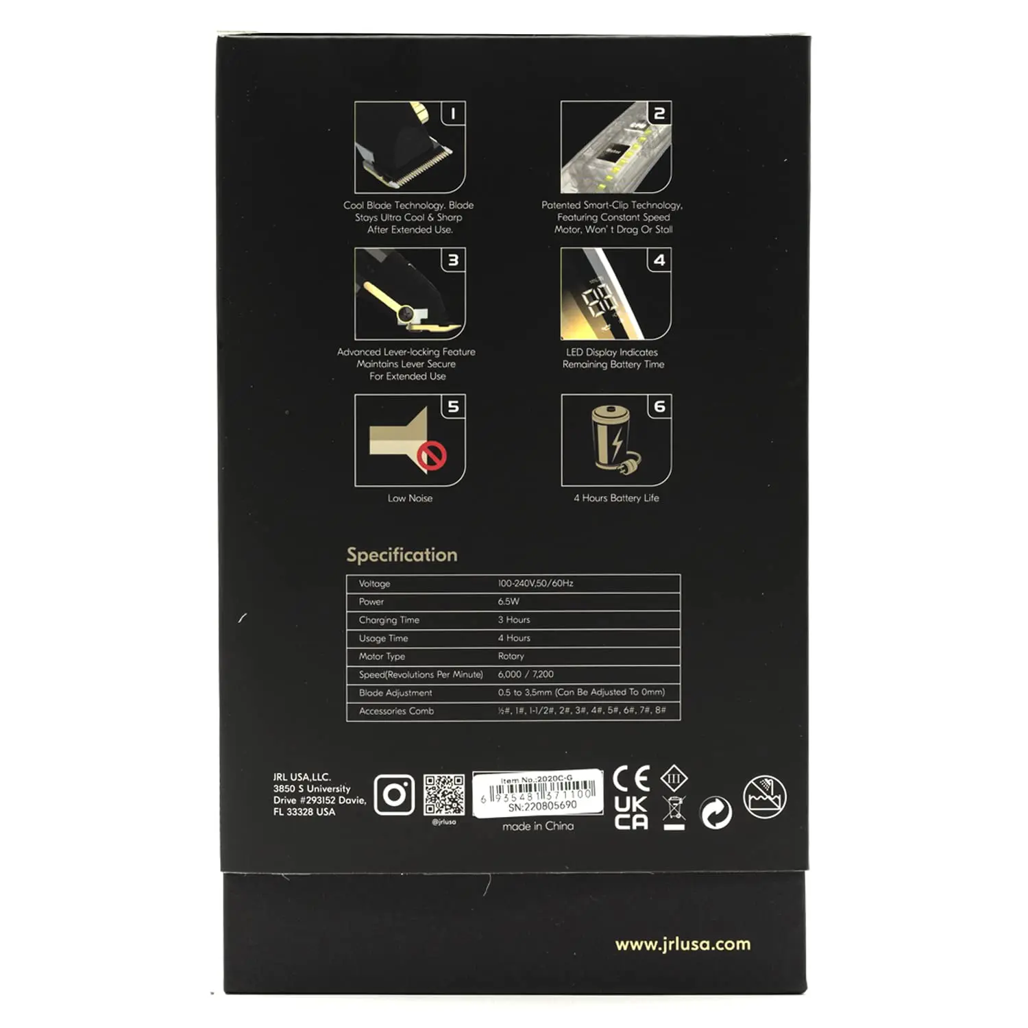 Experience the next level of hair cutting with the JRL Fresh Fade 2020C-G Clipper. This professional-grade clipper is engineered with innovative features designed to deliver superior performance and comfort. The revolutionary cool blade technology keeps the titanium blade significantly cooler than traditional clippers, ensuring a comfortable experience for both the barber and the client. The integrated LCD digital screen displays the power level, providing real-time feedback for optimal clipping. Equipped with smart clip technology, these clippers intelligently sense blade resistance and automatically adjust the motor speed to prevent dragging, ensuring a smooth and consistent cut every time. The powerful motor operates at a quiet level, below 60dB, creating a relaxed and peaceful working environment. The long-lasting lithium-ion battery provides up to 4 hours of run time on a single 2-hour charge. With two adjustable speeds and an advanced lever locking feature, these clippers offer unparalleled versatility and control. The included clipper kit provides everything needed for a professional haircut, including a hanging hook for easy storage, a screwdriver, a brush, lubricant oil, a blade protector, a US plug, and 10 comb guards in various sizes.