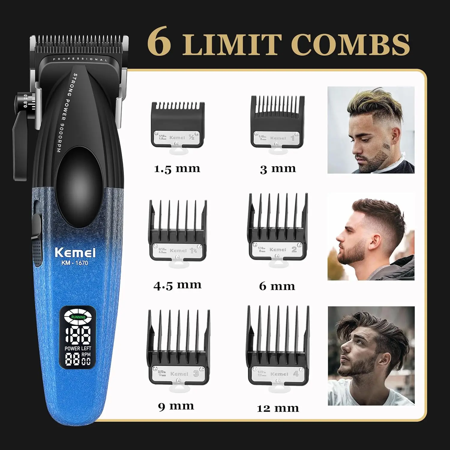 Achieve professional-quality haircuts at home with the KEMEI 1670 Hair Clippers for Men. This cordless barber clipper set is designed for both professional barbers and home users, offering a smooth, even cut every time. The set includes the KEMEI 1670 hair clipper with a clear LCD digital display, a convenient charging base, and six clipper guide combs (1.5mm, 3mm, 4.5mm, 6mm, 9mm, and 12mm) to cater to various haircutting needs.