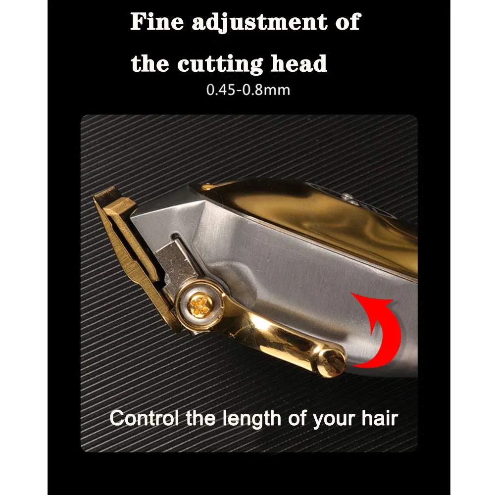 Professional cordless hair clipper with titanium & ceramic blades. Features adjustable length settings and a long-lasting rechargeable battery. Perfect for barbers and home use.