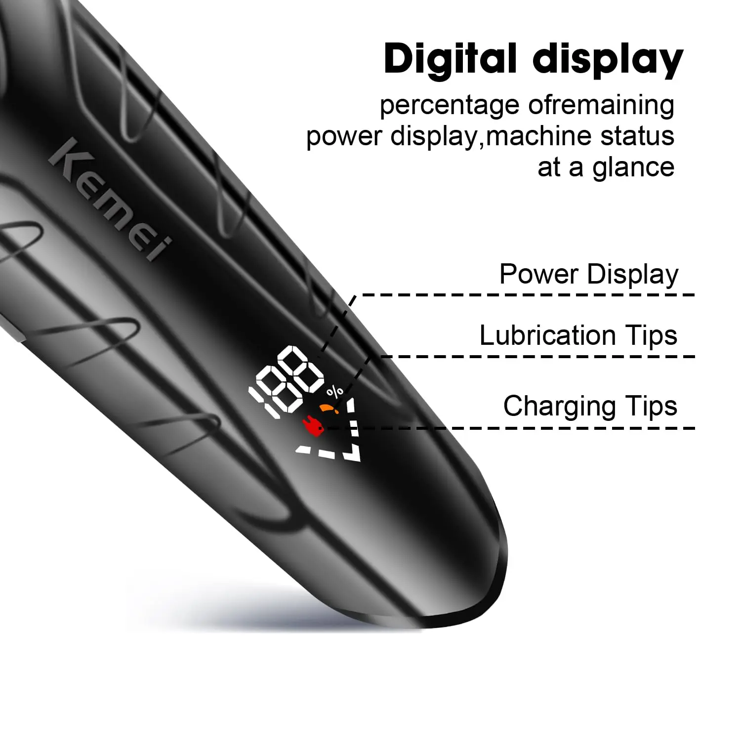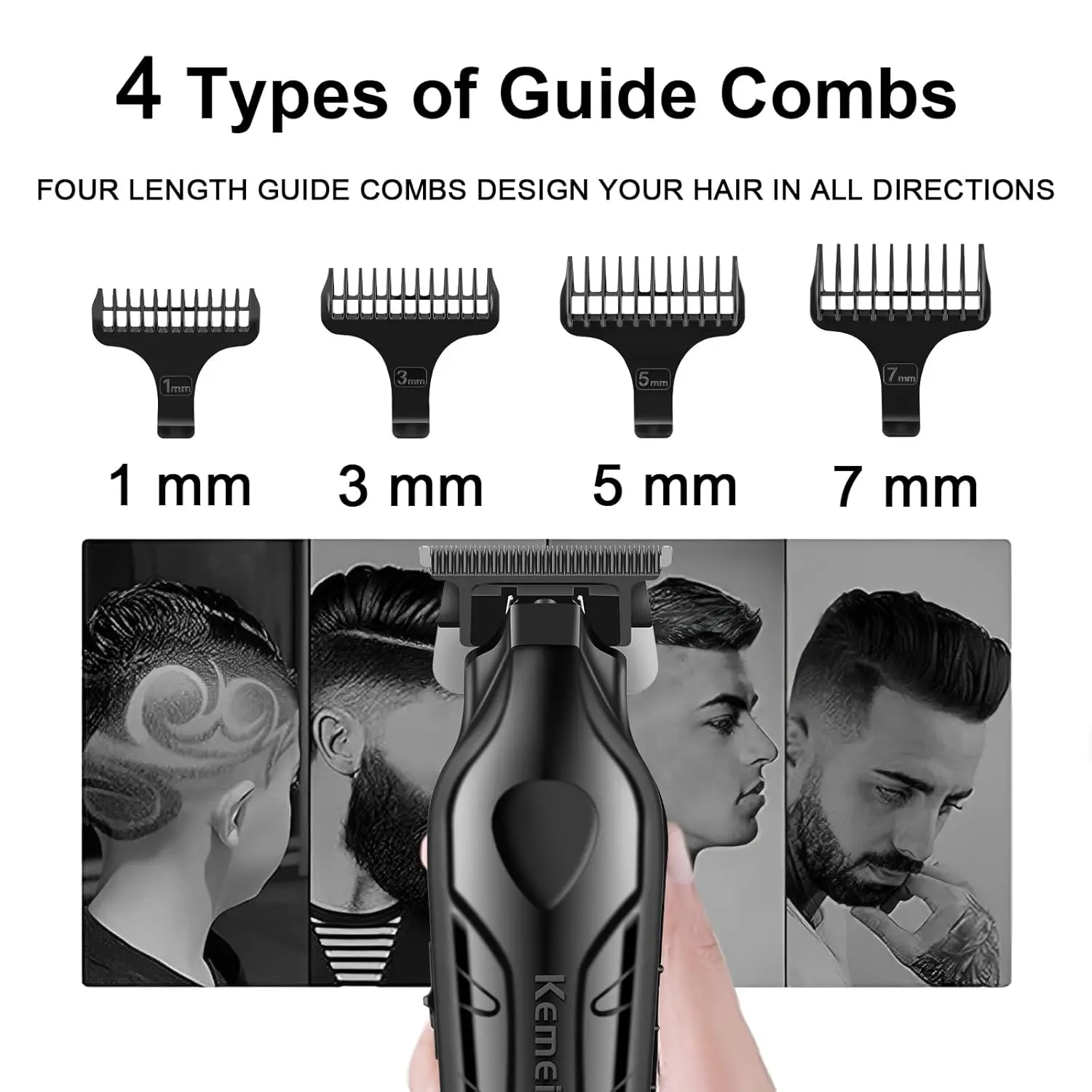 Experience professional-grade haircuts at home with the KEMEI Hair Clippers for Men. This T-Blade Zero Gap Trimmer is designed for precision and performance, making it ideal for creating fades, gradients, and intricate artistic carvings. The advanced precision powder metallurgy blades ensure a sharp and safe cutting experience, effortlessly trimming hair of all types and textures. The included limit combs (1/3/5/7 mm) provide versatile cutting lengths, allowing you to achieve your desired hairstyle with ease. The ergonomic design of the trimmer ensures a comfortable grip and optimal control, even during extended use. Whether you’re a professional barber or simply maintaining your own hairstyle, this trimmer is a must-have tool. The kit includes everything you need for a complete haircutting experience: the professional electric hair trimmer, limit combs in various sizes, a barber comb for styling, a USB Type-C charge cable for convenient charging, a cleaning brush for maintenance, and a velvet bag for storage and travel. The USB Type-C fast charging capability ensures that your trimmer is always ready when you need it. The built-in 2000 mAh lithium battery provides an impressive 300 minutes of continuous runtime after just 3 hours of charging. This worldwide USB charging compatibility makes it perfect for use at home or on the go. With its sharp blades, long battery life, and comprehensive accessory kit, the KEMEI Hair Clippers offer unparalleled performance and convenience.