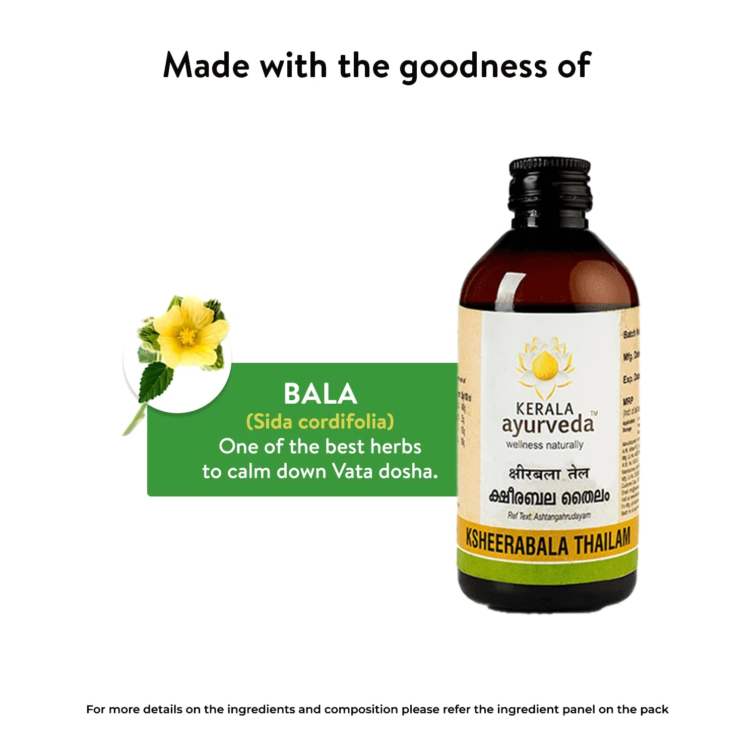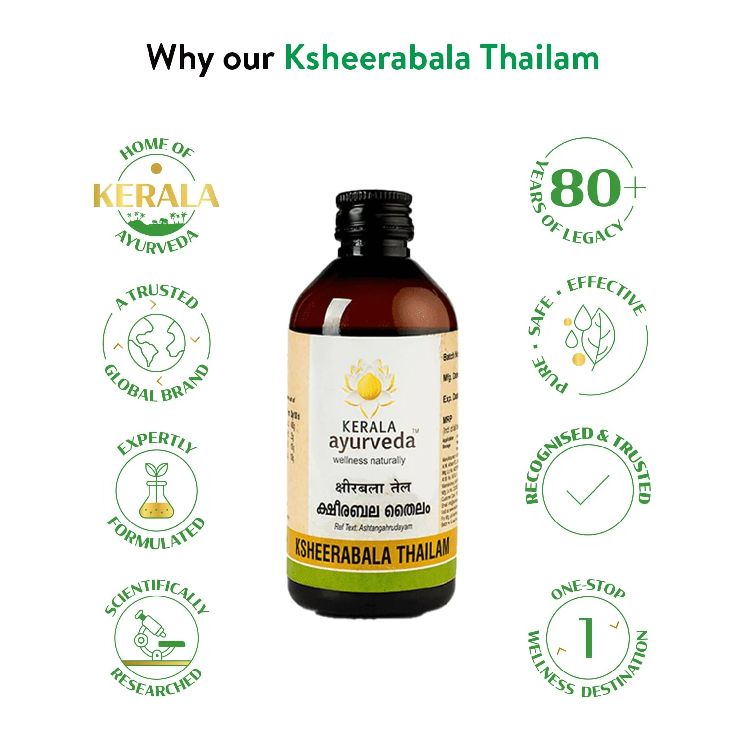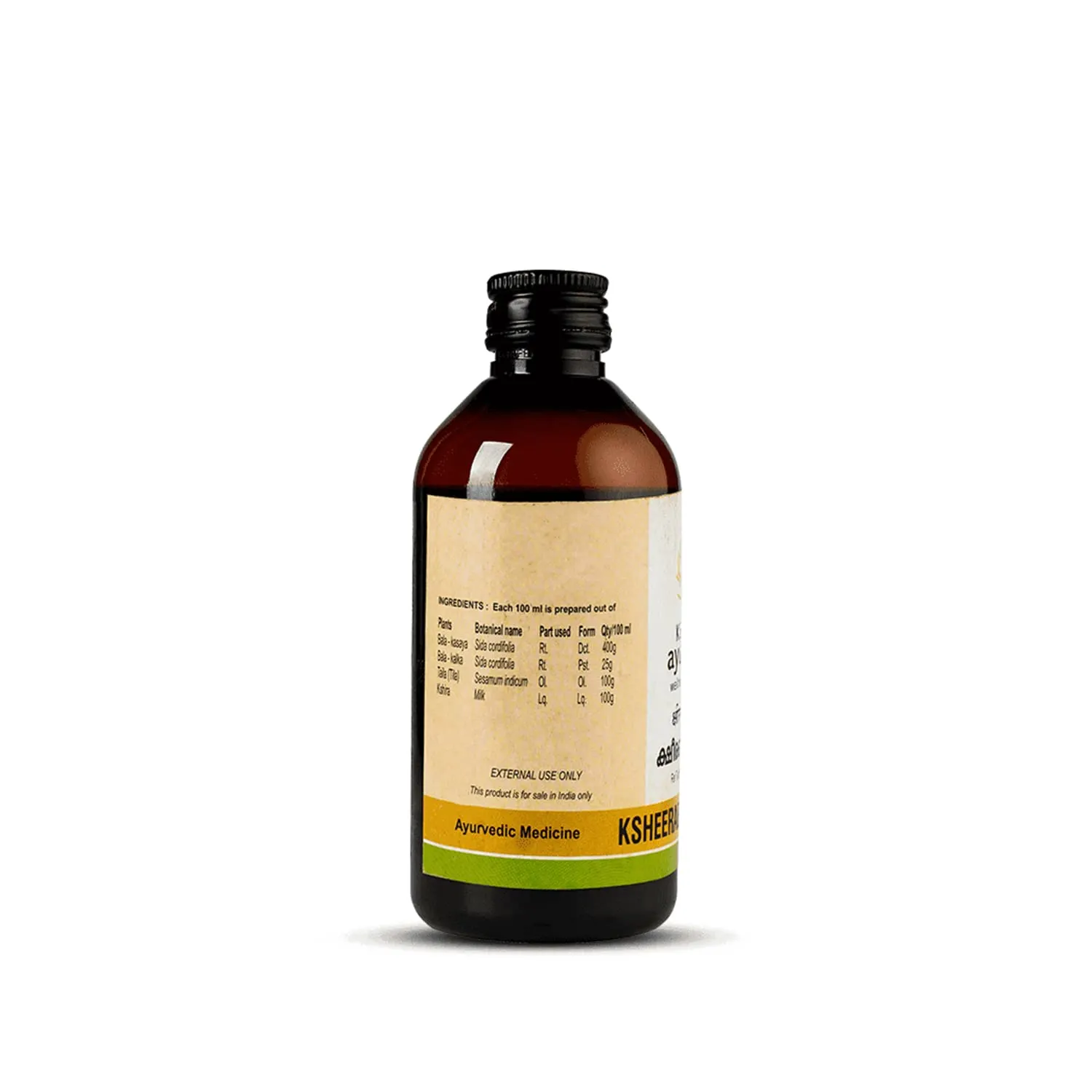 Experience the time-honored tradition of Kerala Ayurveda with Ksheerabala Thailam. This authentic Ayurvedic oil is crafted using traditional preparation methods, adhering to authentic formulations and recipes passed down through generations. We are committed to using only 100% all-natural, vegetarian ingredients, ensuring the highest standards of safety, purity, efficacy, and authenticity. Our dedication to quality extends to our manufacturing processes, which are GMP Certified and USFDA Compliant. We also adhere to Certified Organic Production (NPOP) standards. The Ksheerabala Thailam is made with internal Research and Development and Quality control. Our unwavering commitment to quality is reflected in every bottle of Ksheerabala Thailam, offering you a truly authentic and beneficial Ayurvedic experience. Crafted with care and precision, using only the finest ingredients, this oil embodies the principles of Ayurveda to promote overall well-being. Please note: These statements have not been evaluated by the Food and Drug Administration. This Kerala Ayurveda Inc product is not intended to diagnose, treat, cure, or prevent any disease or dysfunction. Compliant to California proposition 65.