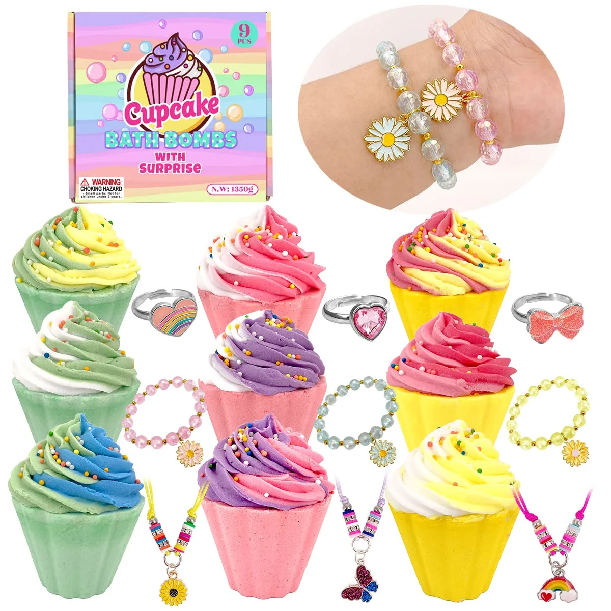9 pack cupcake bath bombs with surprise squishy toys inside! Natural, fruity scented, and perfect for kids aged 3+. Makes bath time fun and colorful with fizzing action!