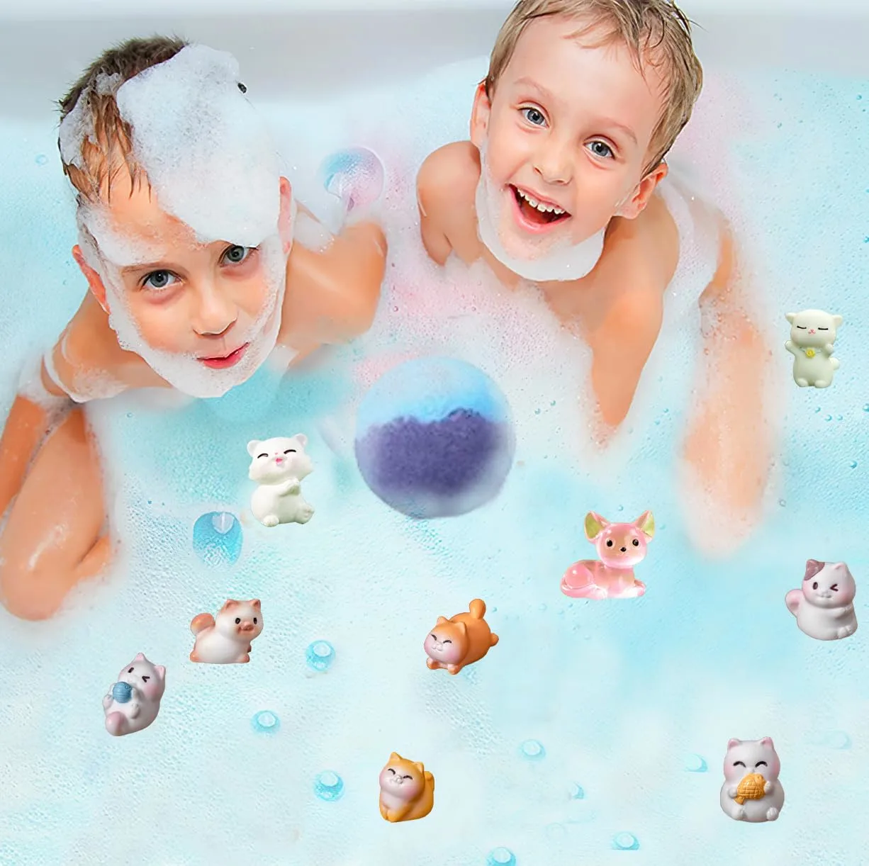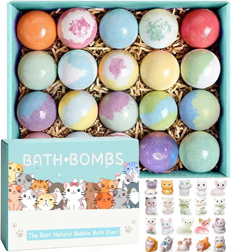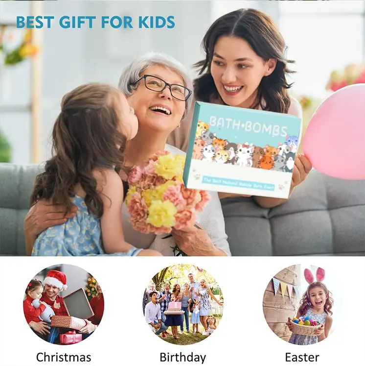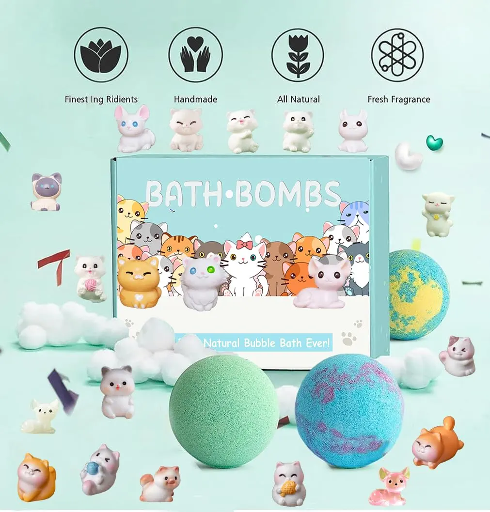 Make bath time an adventure with our Kids Bath Bombs with Surprise Toys! This 20-pack of bath bombs transforms ordinary baths into exciting spa experiences for your little ones. Each bath bomb contains a hidden surprise – a cute animal toy! Discover 20 different kitten toys and enjoy 10 delightful scents, adding a new element of fun to every bath. Our bath bombs are lovingly handmade with natural and organic ingredients, ensuring a gentle and safe experience for your child’s delicate skin. We use a distillation process to extract natural plant essential oils and blend them with natural deep sea mineral salts. These ingredients work together to moisturize and nourish the skin, leaving it feeling soft and smooth. Plus, our bath bombs dissolve quickly and rinse away easily, making cleanup a breeze. These bath bombs aren’t just for bathtime; they also make the perfect gift! Packaged in a specially designed, exquisite box, our bath bombs are vibrant and colorful, featuring adorable sea and land animal toys. They’re a unique and memorable birthday gift, holiday present, bath toy, or party favor that kids will absolutely love. Watch as the bath bomb fizzes and dissolves, releasing a burst of colorful bubbles and a soothing scent. After 4-6 minutes of spa-like relaxation, the hidden toy will slowly float to the surface, creating a moment of pure joy and excitement. The combination of colorful bubbles, calming fragrances, and surprise toys will help boys and girls embrace bath time like never before. We’re committed to providing high-quality products that you can trust. Our bath bombs are made with natural and organic ingredients, and our animal toys are crafted from durable, high-quality PVC material. The specially designed gift box features a charming jungle and sea animal theme, adding to the overall experience. With our Kids Bath Bombs with Surprise Toys, you can create a fun and enriching zoo for your child, right in your own bathroom! Enjoy peace of mind knowing that our bath bombs are safe and gentle for everyone to use.