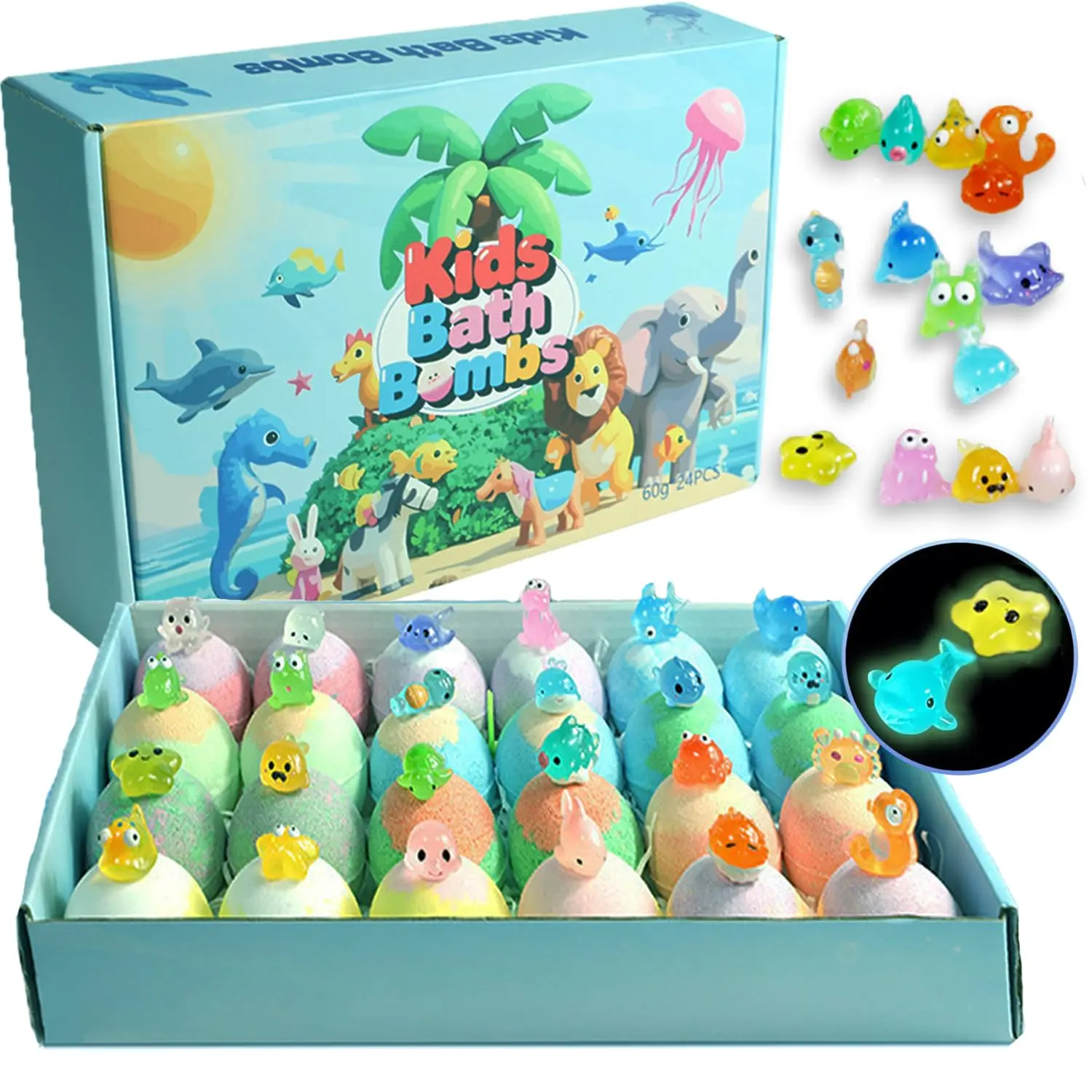 Transform bath time into an exciting adventure with our Kids Bath Bombs with Surprise Toys! This 24-pack of vibrant, fragrant bath bombs turns ordinary baths into bubbly, educational experiences. Each bath bomb is carefully crafted with natural ingredients like sodium bicarbonate and citric acid, ensuring a soothing and skin-friendly experience for your child. Say goodbye to harsh chemicals and irritants, and hello to a world of frothy fun! As the bath bomb fizzes and dissolves, a hidden surprise toy is revealed, sparking curiosity and stimulating learning. The diverse range of creatures adds an element of discovery that keeps kids engaged and entertained. Each bath bomb boasts a unique color and pleasant scent, making bath time a visually and aromatically stimulating experience. With 24 different smells and color combinations, every bath is a new and exciting adventure. Looking for the perfect gift? Our bath bombs are ideal for birthdays, Christmas, Easter, or just because! Give the gift of bubbly journeys, filled with laughter, learning, and delightful surprises. It’s more than just a bath bomb; it’s an adventure in every bubble, a story in every splash, and a smile with every fizz. Make bath time the best time with our delightful Kids Bath Bombs with Surprise Toys! Watch as your little ones eagerly anticipate their bath, knowing a fun, fizzy, and educational experience awaits them. These bath bombs are designed to make bath time less of a chore and more of a cherished activity. With the combination of vibrant colors, delightful scents, skin-friendly ingredients, and surprise toys, our bath bombs are sure to become a favorite in your household.
