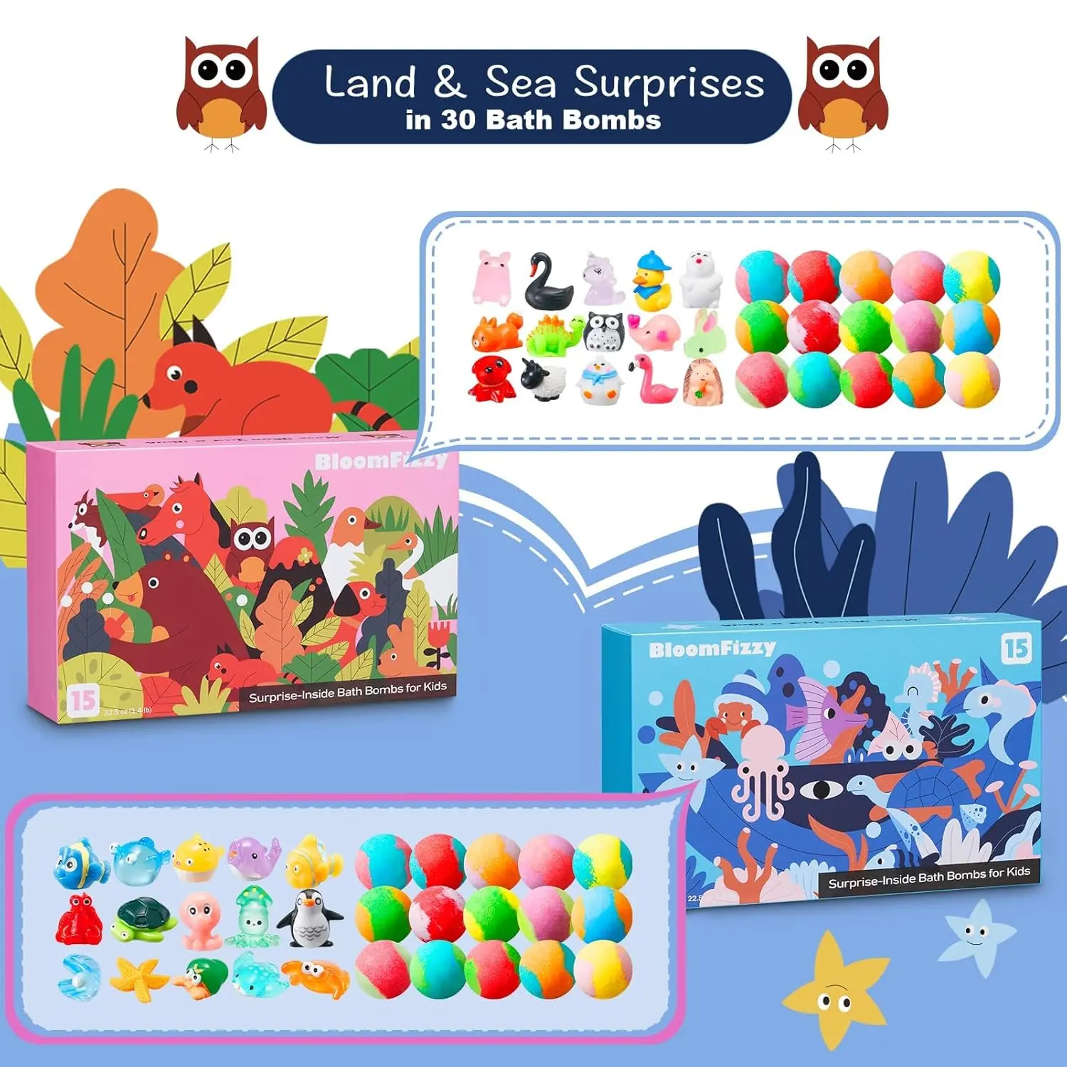 Make bath time an exciting adventure with BloomFizzy Kids Bath Bombs! This 30-pack gift set transforms ordinary baths into playful, educational experiences. Each box features a dual-themed design, one showcasing land animals and the other exploring sea creatures. Inside each bath bomb, discover a surprise resin figure – maybe a unicorn, dinosaur, dolphin, or penguin! Watch as the bath bomb fizzes and bubbles, releasing vibrant colors and delightful fragrances that create a captivating sensory experience. Made with natural and organic, kid-friendly ingredients like essential oils, glycerin, and baking soda, BloomFizzy bath bombs are gentle on sensitive skin, free from harsh chemicals and irritants. Each bath bomb offers a unique color and scent, making every bath a joyful exploration. Perfect for birthdays, holidays, or just because, BloomFizzy bath bombs promise a unique, fun, and educational bath time adventure for children. Turn every splash into a story and every fizz into a smile with this amazing gift! BloomFizzy bath bombs are not just bath products; they are invitations to a bubbly journey filled with discovery and imagination. Let your child dive into a world of colorful water, exciting scents, and hidden surprises, all while enjoying a soothing and skin-friendly bathing experience. BloomFizzy – where bath time becomes an unforgettable adventure.