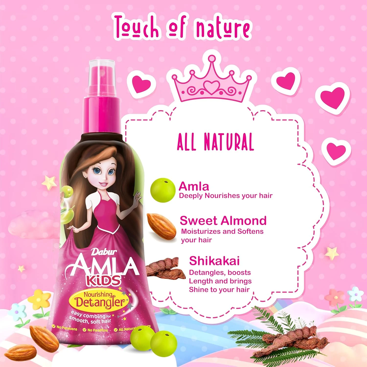 Unlock tangle-free, radiant hair for your little one with Dabur Amla Kids Detangler! This specially formulated detangler gently releases knots and tangles, making combing a breeze and leaving your princess’s hair free to grow long and strong. Enriched with a powerful blend of natural extracts, including Amla, henna, and sweet almonds, it provides comprehensive hair care from root to tip. Amla, known for its nourishing properties, invigorates the scalp and revitalizes hair follicles, promoting healthy and robust hair growth. Henna adds shine and luster, while sweet almonds provide essential moisture, leaving hair soft, smooth, and manageable. Our formula is free from parabens and paraffins, ensuring a gentle and safe product for your child’s delicate hair and scalp. Easy to use on both wet and dry hair, simply spray and comb through for instant detangling and enhanced shine. For optimal results, incorporate it into your child’s hair care routine after using Dabur Amla Kids Shampoo. Experience the joy of hassle-free hair care and watch your child’s hair flourish with Dabur Amla Kids Detangler. This detangler will keep your child’s hair nourished and healthy all day. The carefully selected ingredients are perfect to promote hair growth and leave hair looking shiny and volumious. Your child’s hair will be stronger and healthier looking. It’s the perfect solution to prevent your child’s hair from tangling and breaking. Make combing and hair styling easy by using our product.