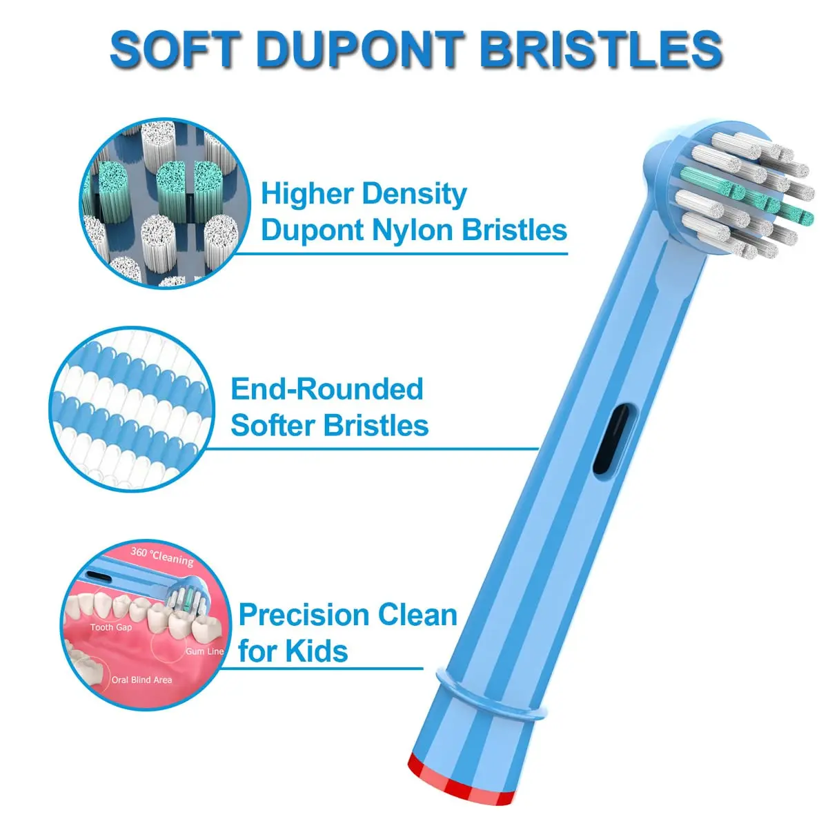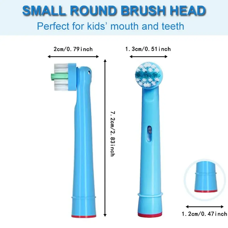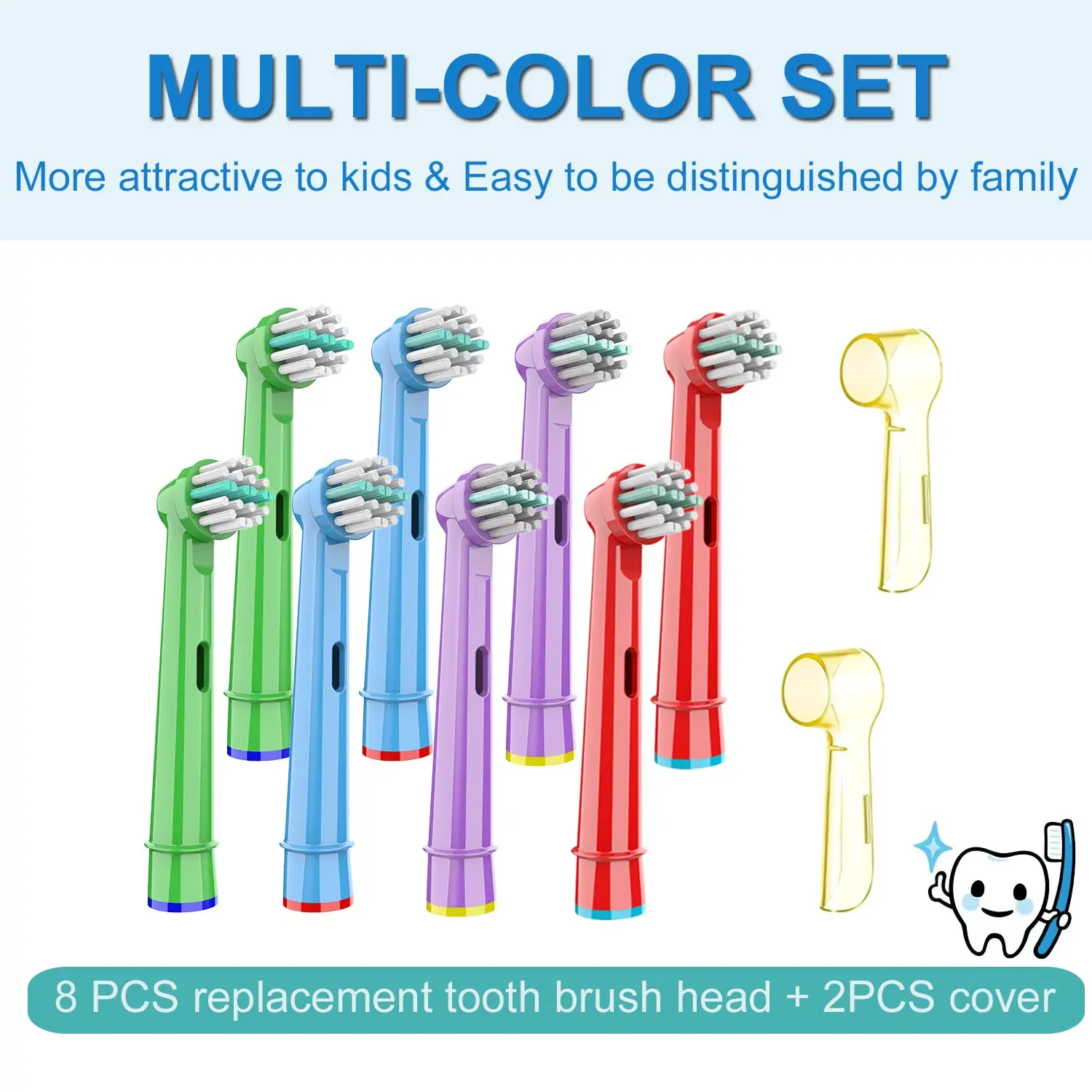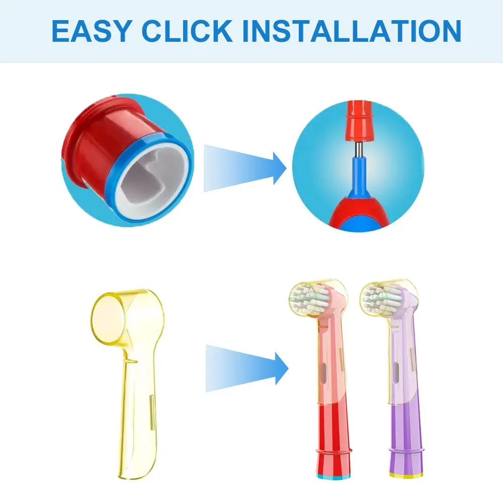 Give your child a brighter, healthier smile with our Kids Toothbrush Heads Replacement. This 8-pack of brush heads features soft, end-rounded Dupont bristles specially designed for delicate gums and small mouths. The multicolored design makes brushing fun and easy to differentiate between family members. These replacement heads are compatible with a wide range of electric toothbrush models, including Triumph, SmartSeries, PRO, Vitality, and Pro-Health Power. Encourage healthy oral hygiene habits from a young age with a gentle, effective clean that helps prevent plaque and tartar buildup, promoting healthy gums. Easy to install and featuring bonus brush head covers for hygienic storage, these replacement heads are the perfect choice for your child’s dental care. The small, round brush head is ideal for children aged 3 and up, ensuring a comfortable and thorough clean every time. Upgrade your child’s brushing experience today! Invest in their smile and their future oral health. These replacement brush heads help your children develop good habit to brush their teeth and help preventing plaque build-up and tartar deposits promote healthy gums. These are fully compatible with electric toothbrush models-Triumph, SmartSeries, PRO, Vitality and Pro-Health Power.