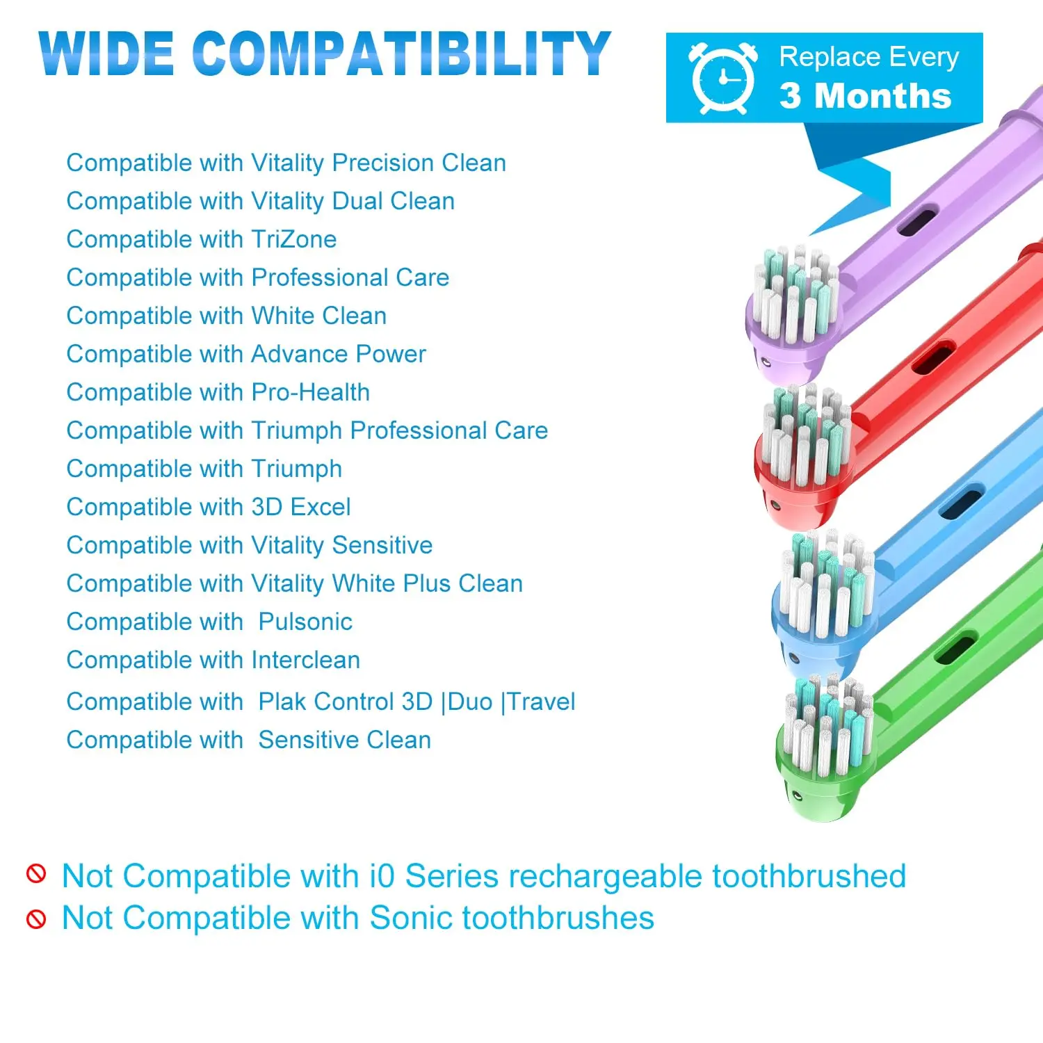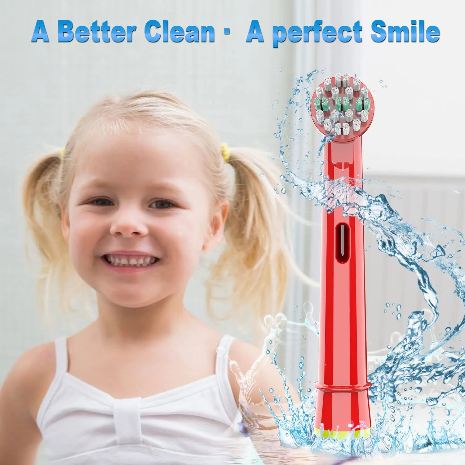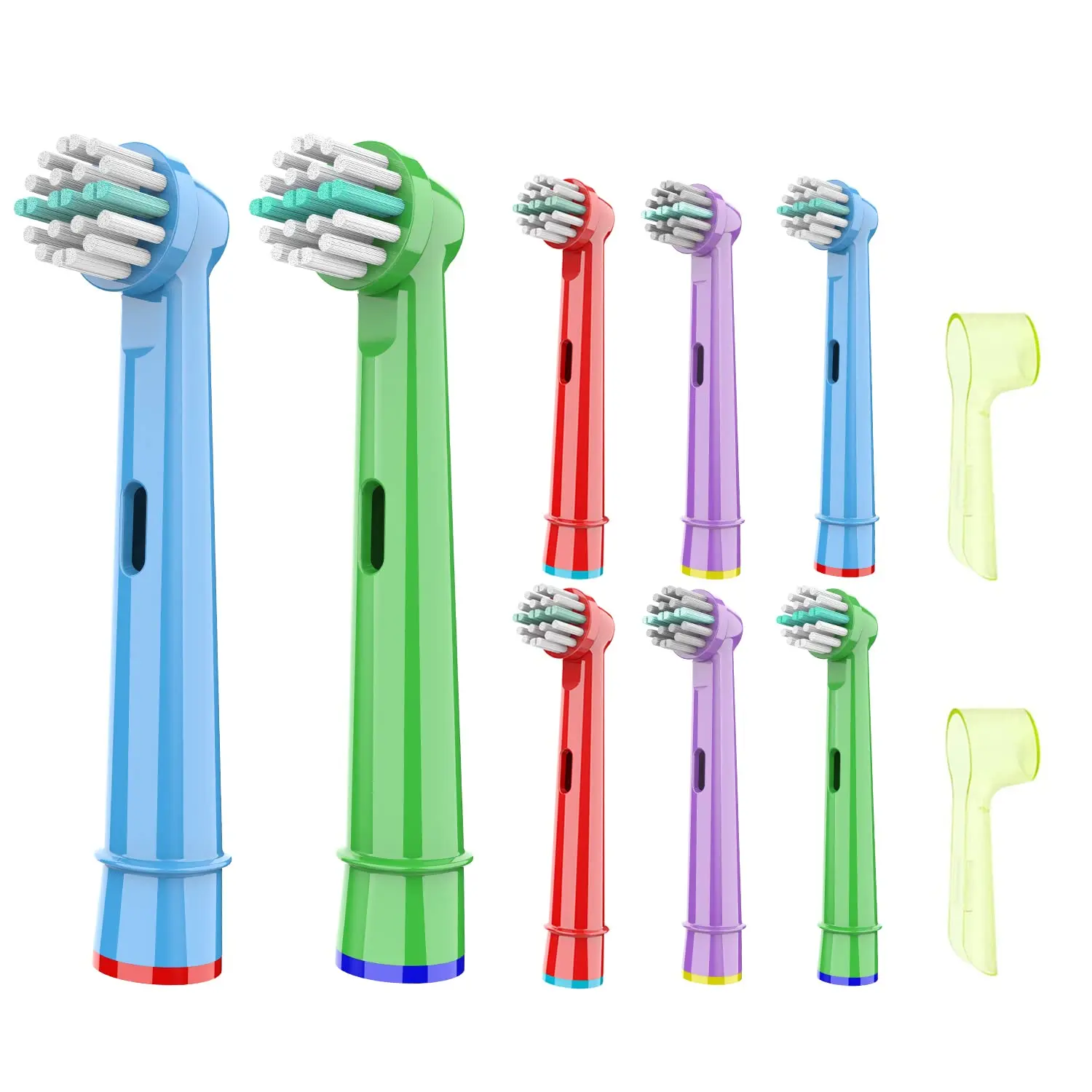 Give your child a brighter, healthier smile with our Kids Toothbrush Heads Replacement. This 8-pack of brush heads features soft, end-rounded Dupont bristles specially designed for delicate gums and small mouths. The multicolored design makes brushing fun and easy to differentiate between family members. These replacement heads are compatible with a wide range of electric toothbrush models, including Triumph, SmartSeries, PRO, Vitality, and Pro-Health Power. Encourage healthy oral hygiene habits from a young age with a gentle, effective clean that helps prevent plaque and tartar buildup, promoting healthy gums. Easy to install and featuring bonus brush head covers for hygienic storage, these replacement heads are the perfect choice for your child’s dental care. The small, round brush head is ideal for children aged 3 and up, ensuring a comfortable and thorough clean every time. Upgrade your child’s brushing experience today! Invest in their smile and their future oral health. These replacement brush heads help your children develop good habit to brush their teeth and help preventing plaque build-up and tartar deposits promote healthy gums. These are fully compatible with electric toothbrush models-Triumph, SmartSeries, PRO, Vitality and Pro-Health Power.