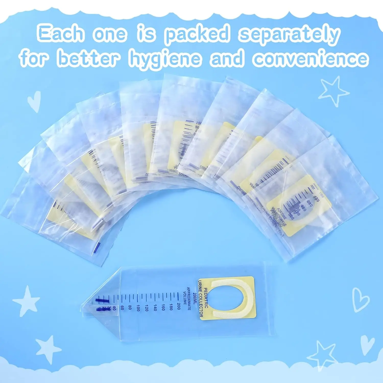 20 disposable kids urine bags for convenient and hygienic urine collection during travel, potty training, and emergencies. Latex-free PE material with a spill-proof design.