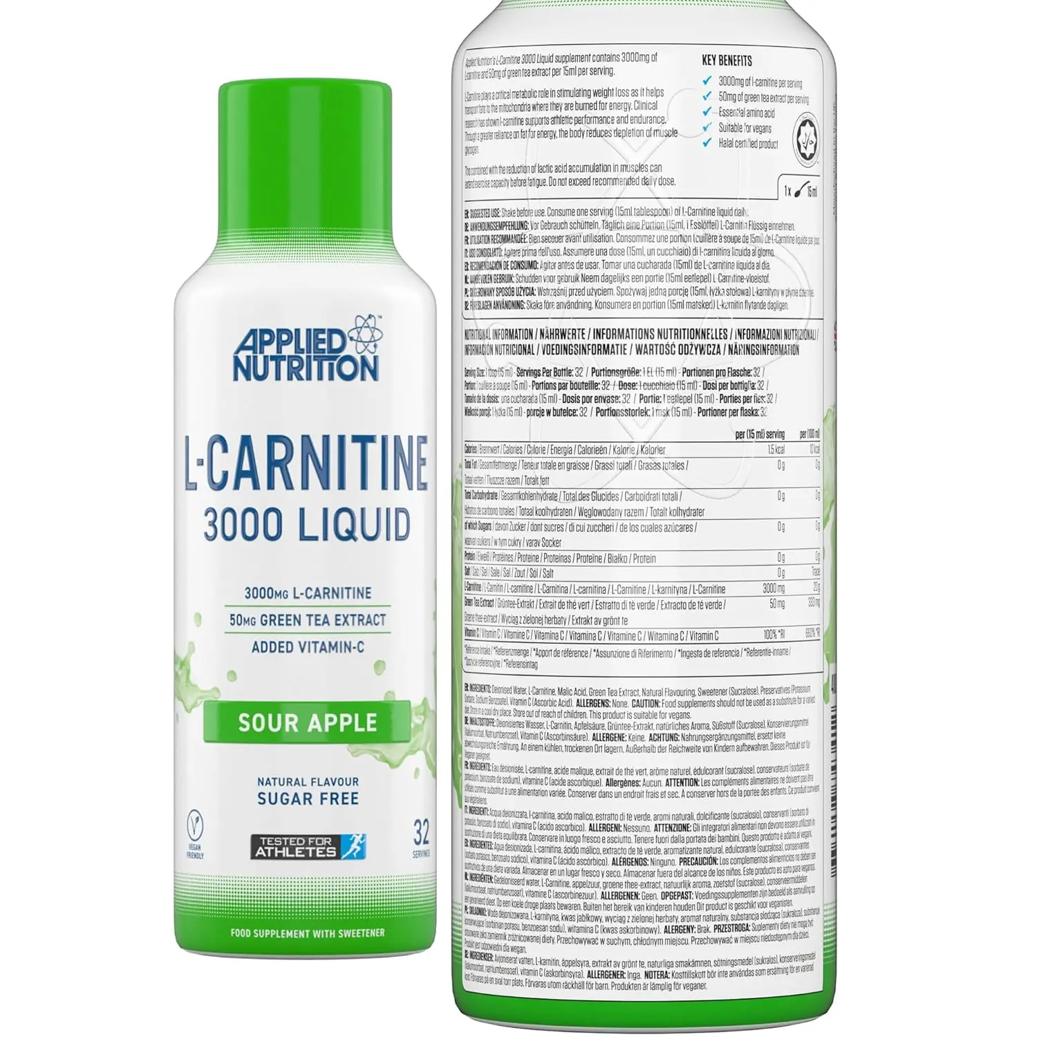 Applied Nutrition L-Carnitine Liquid 3000 supports weight loss by transporting fats for energy. It enhances athletic performance with Green Tea & Vitamin C. Vegan & Halal certified.