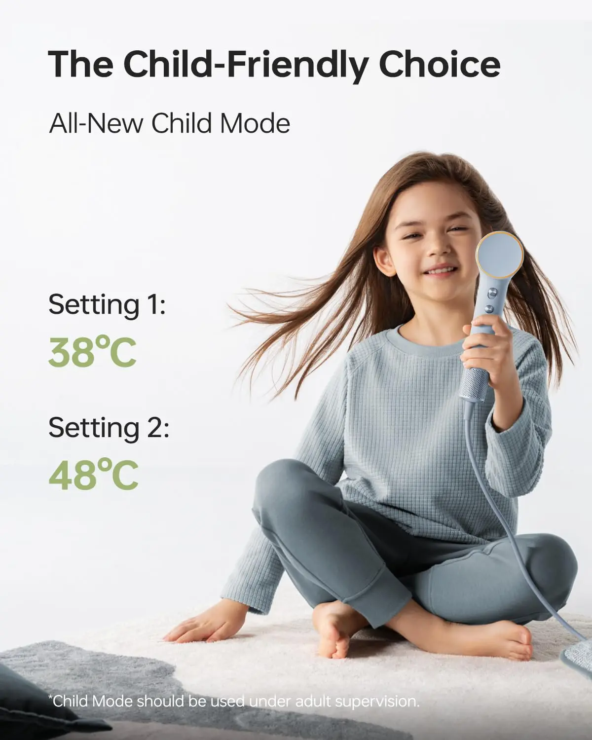 Experience powerful drying in a remarkably compact design with the Laifen Mini Hair Dryer. This mini powerhouse redefines portability without compromising performance. Weighing only 299g and 33% smaller than previous models, it’s the perfect travel companion. Don’t let the size fool you – the miniaturized brushless motor spins at an incredible 110,000 rpm, delivering the iconic Laifen power and optimized airflow you expect. Say goodbye to frizz and hello to silky smooth, shiny hair thanks to the 200 million negative ions released by the Laifen Mini. Ion technology works to repel water, seal in moisture, and create a naturally healthy shine. Protect your hair from damage with intelligent heat control technology. Laifen’s exclusive technology automatically compensates for excess heat by alternating between hot and cold airflow. A sophisticated microprocessor monitors the temperature 100 times per second, ensuring your hair is shielded from extreme heat. The intuitive LED ring displays the temperature setting with three distinct colors: red (80°C, hot air), yellow (50°C, warm air), and blue (cold air). For a unique experience, press and hold the button for two seconds to activate the hot and cold air circulation mode. Despite its impressive power and speed, the Laifen Mini operates at a whisper-quiet 61dB. It even features a dedicated children’s mode with two gentle temperature levels, perfect for delicate hair and even pets. The intelligent technology ensures safe and gentle care.