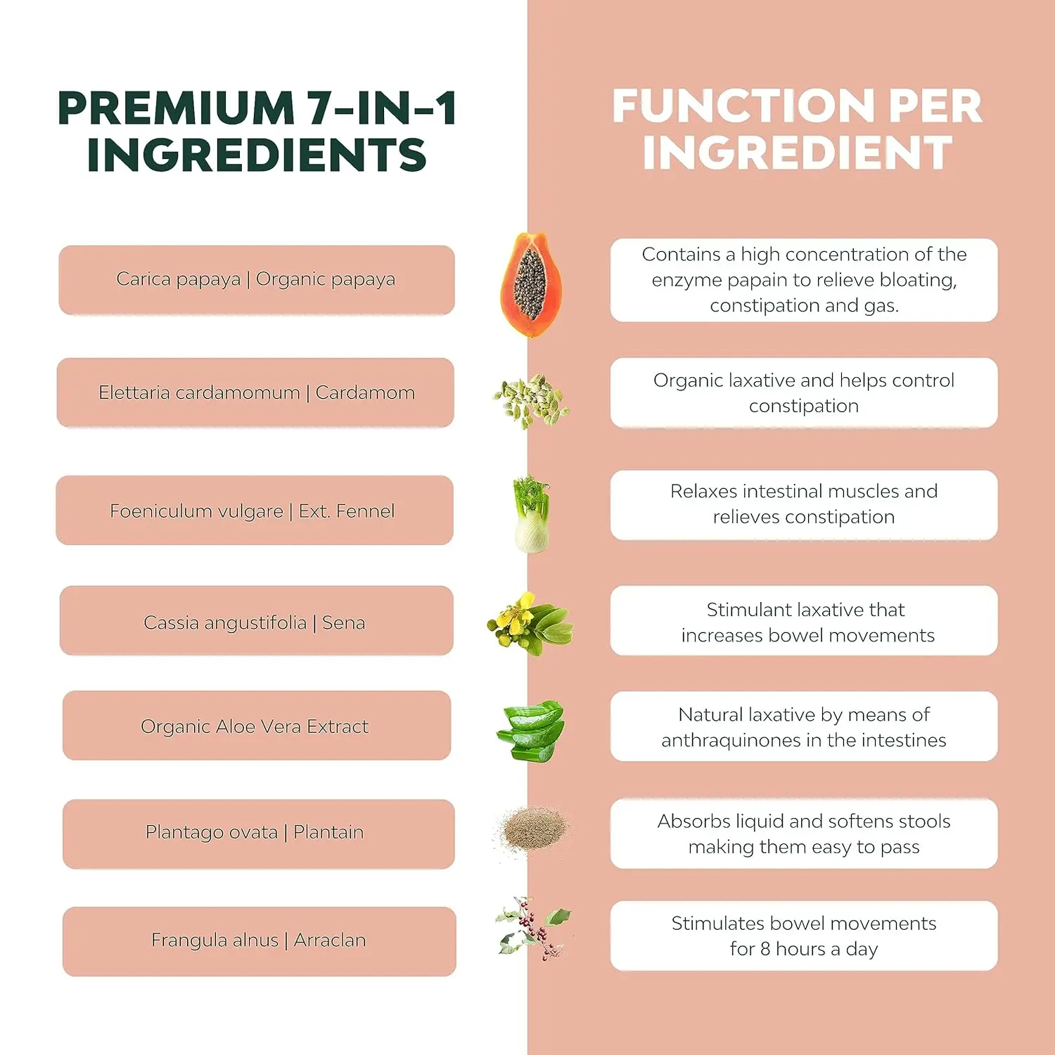 • Contains Papaya, Cardamon, Fennel, Sena, Aloe, Plantago, and Arraclan
