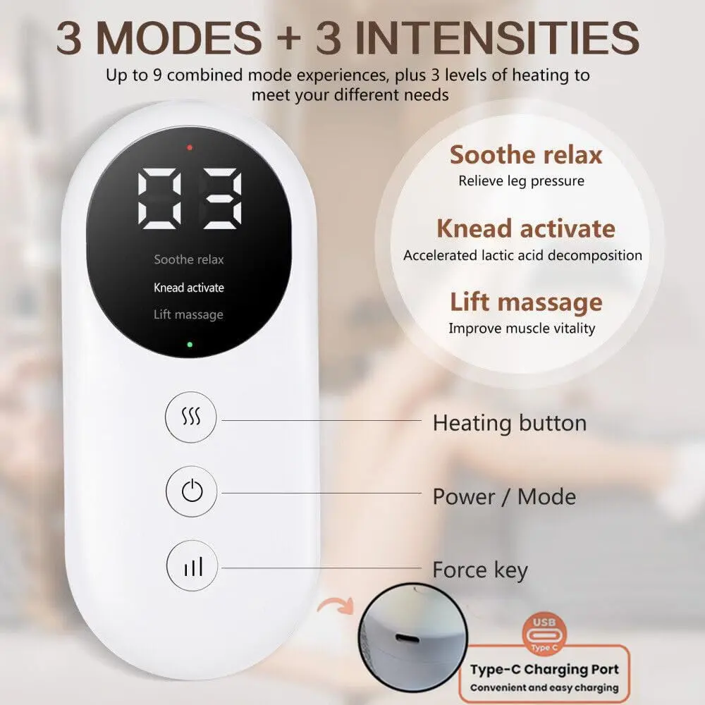 Experience soothing relief and improved circulation with our Leg Massager for Circulation & Pain Relief with Heat. This innovative device utilizes air compression technology to gently massage your legs and feet, promoting healthy blood flow and alleviating muscle soreness. Choose from 3 massage modes and 3 intensity levels to customize your massage experience. The added heat function warms your calves and feet, providing extra comfort and pain relief, especially during colder months. The adjustable hook and loop fasteners ensure a comfortable and secure fit for various leg sizes, while the breathable material enhances your overall comfort. The built-in 15-minute automatic shut-off feature provides a safe and worry-free experience, particularly for elderly users who might forget to turn the device off. This leg massager is the perfect gift for loved ones on special occasions such as birthdays, Mother’s Day, Father’s Day, Valentine’s Day, Thanksgiving, and Christmas. Give the gift of relaxation and well-being with our air compression leg massager. If you have any questions, our customer support team is available to provide a satisfactory answer within 24 hours. Enjoy a comfortable and revitalizing massage experience in the comfort of your own home.