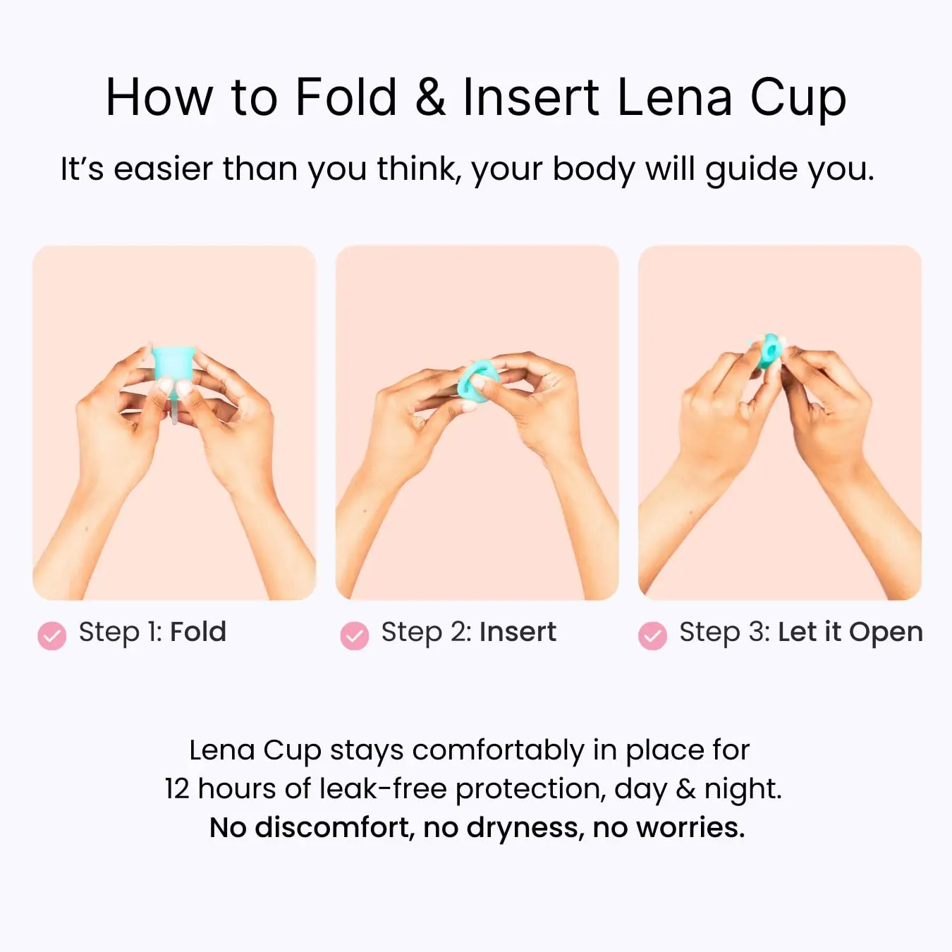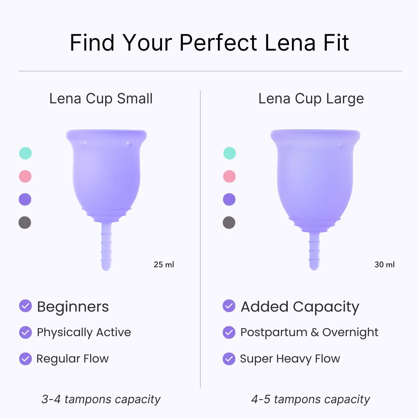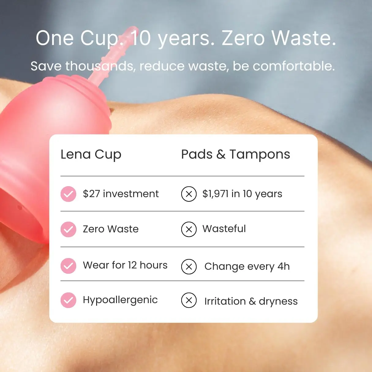 Experience a BETTER PERIOD with the Lena Menstrual Cup! This reusable menstrual cup collects your monthly blood flow, offering complete protection and an odorless, sensation-free period. Inserted like a tampon, the Lena Cup will change the way you think about your period. Join thousands of first-time menstruation cup users who say they will never go back to using pads and tampons.